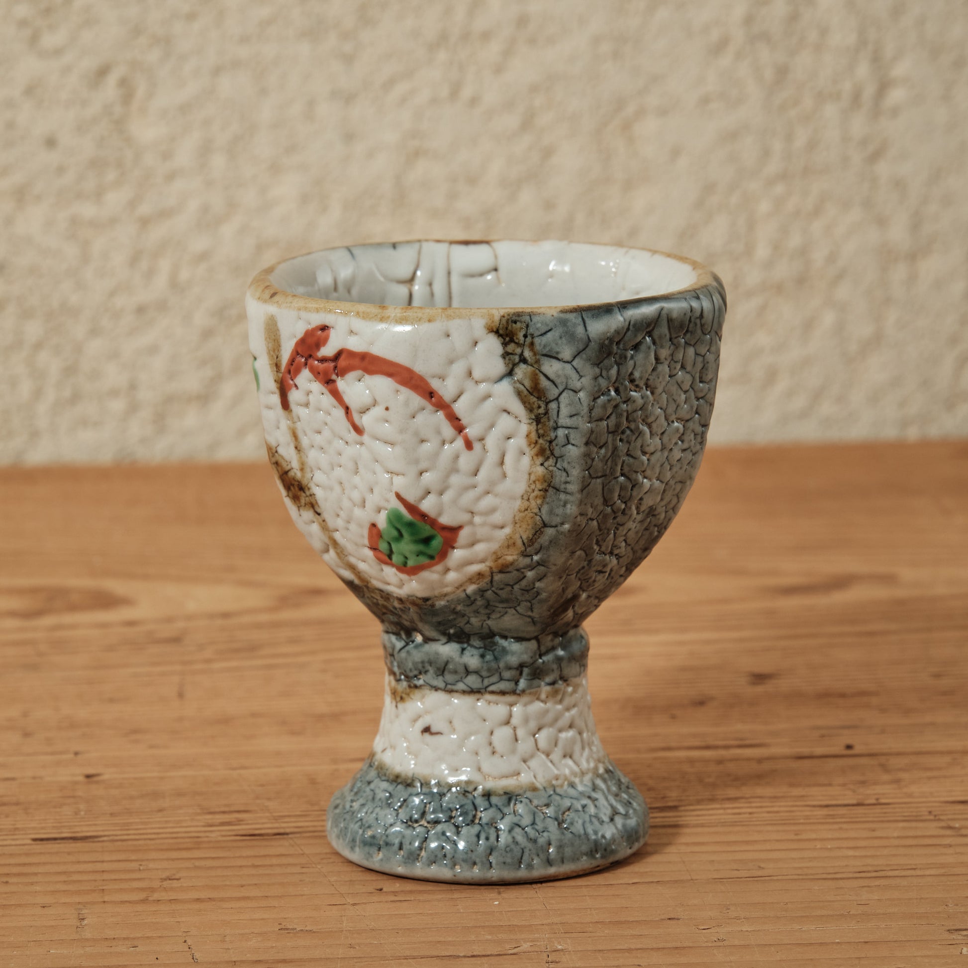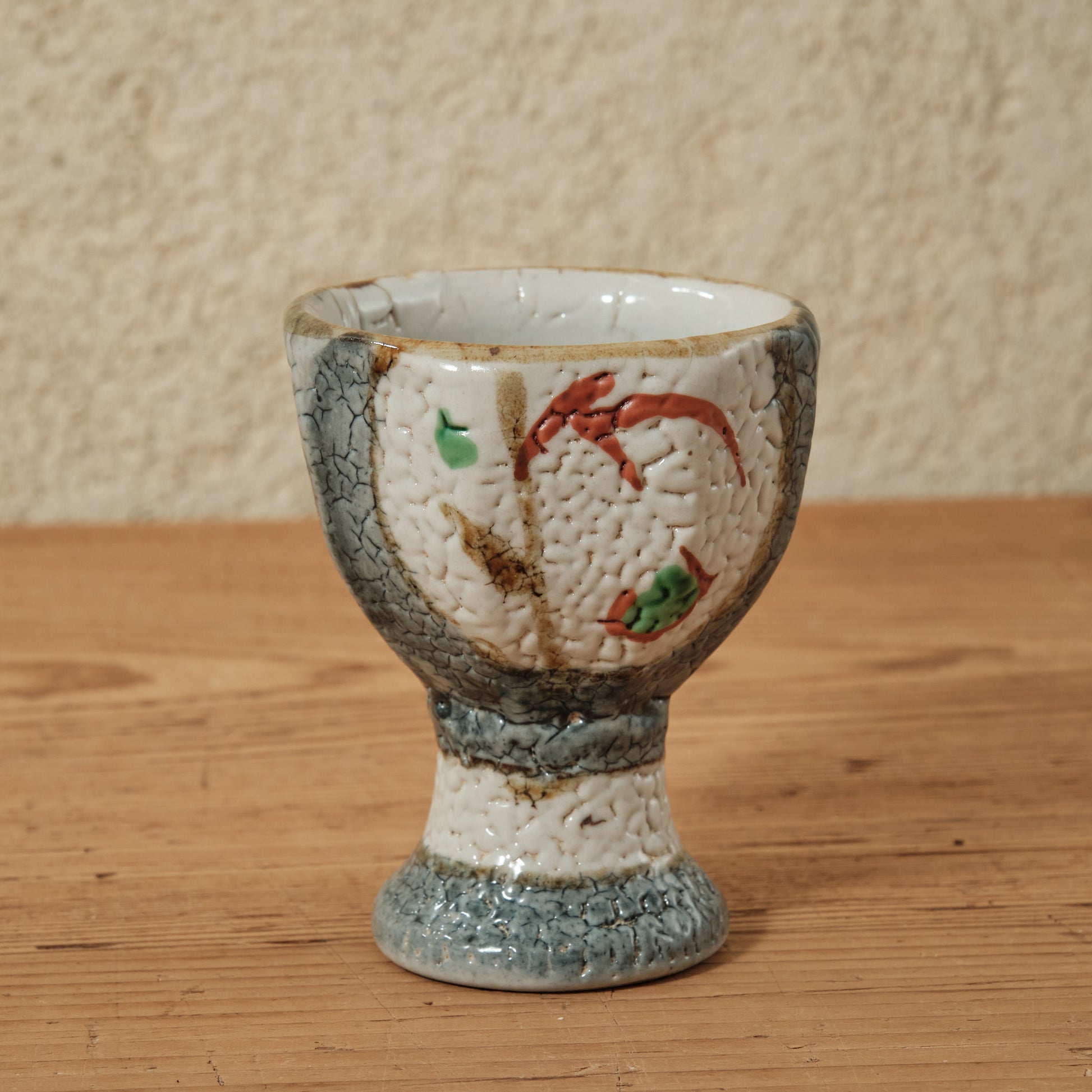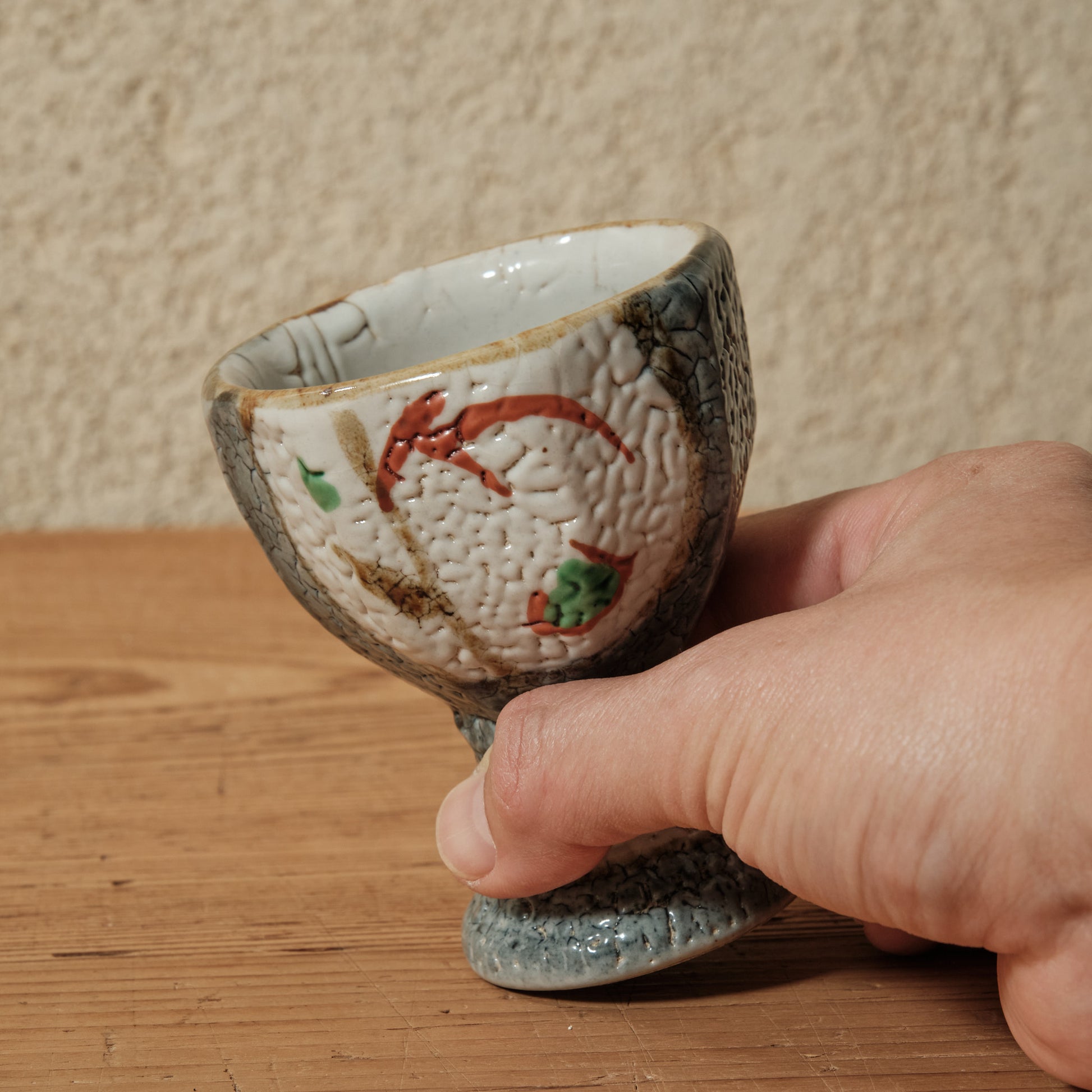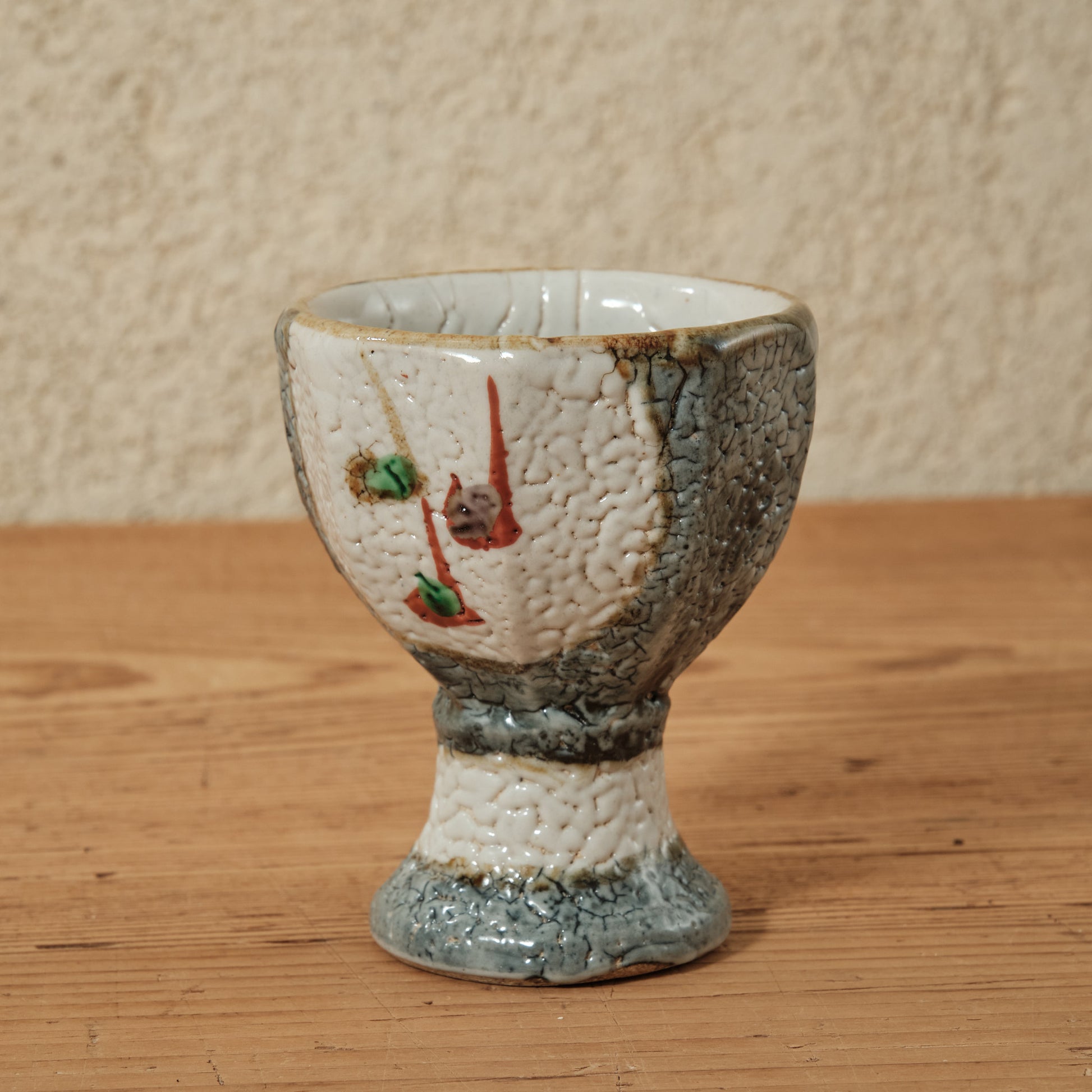 泥並白釉の上に浮かぶ赤と緑の彩が軽やかに調和し、梅花皮(かいらぎ)のようなちぢれた肌が深みを添えています。