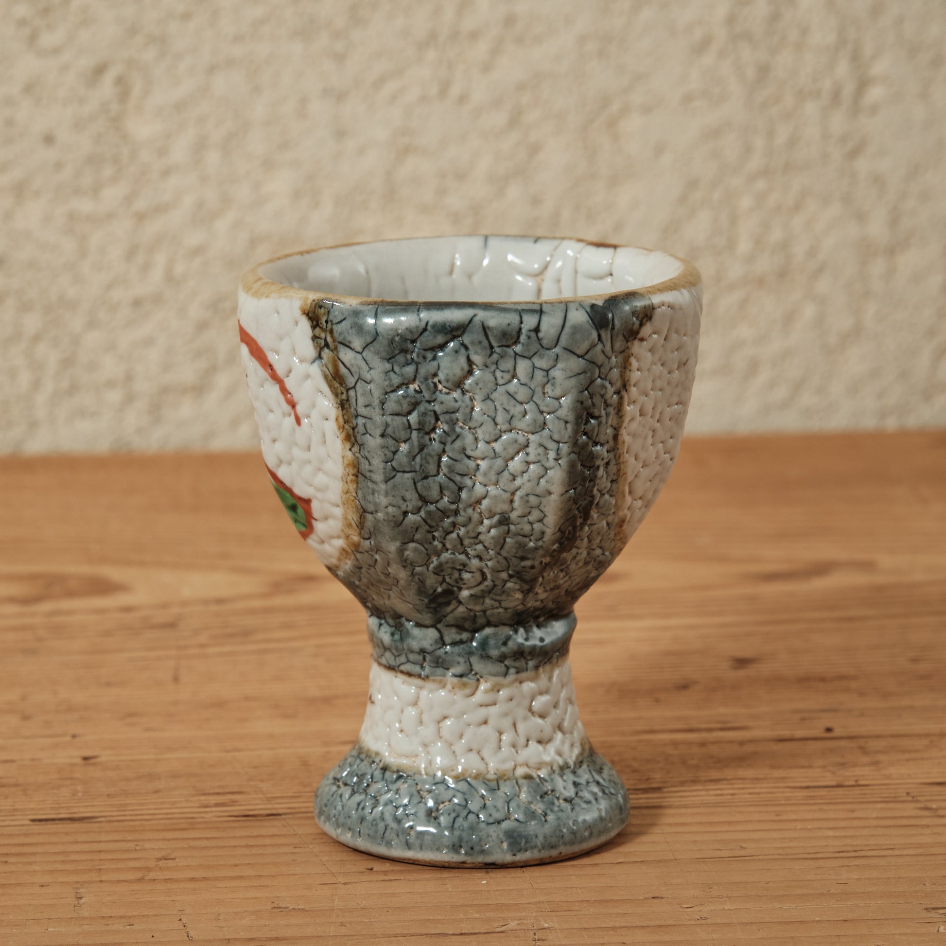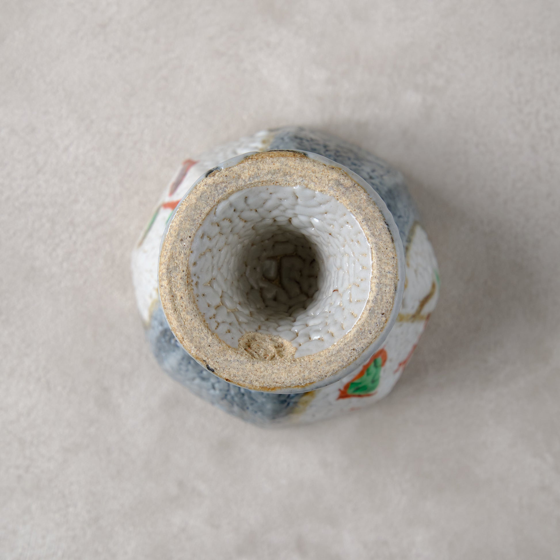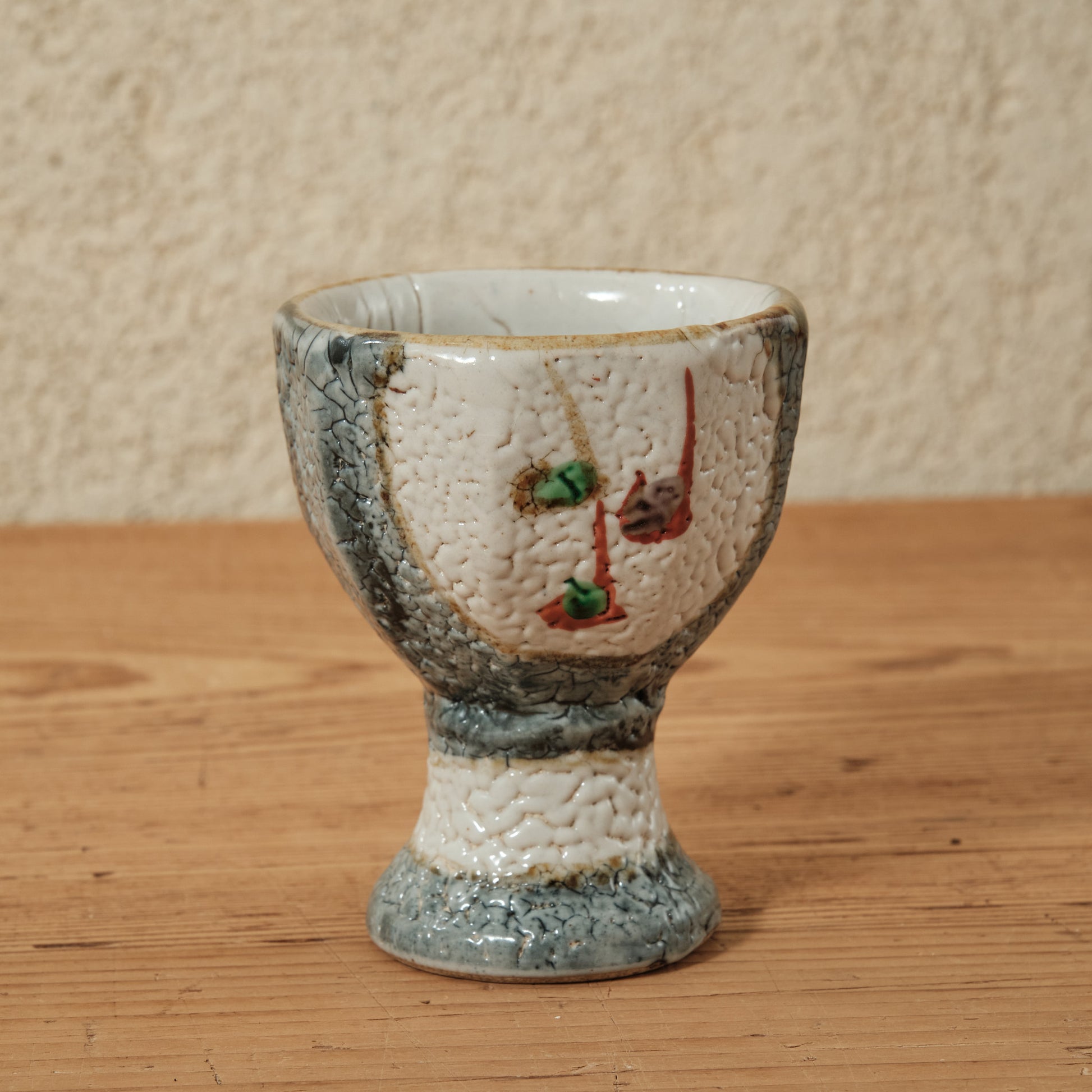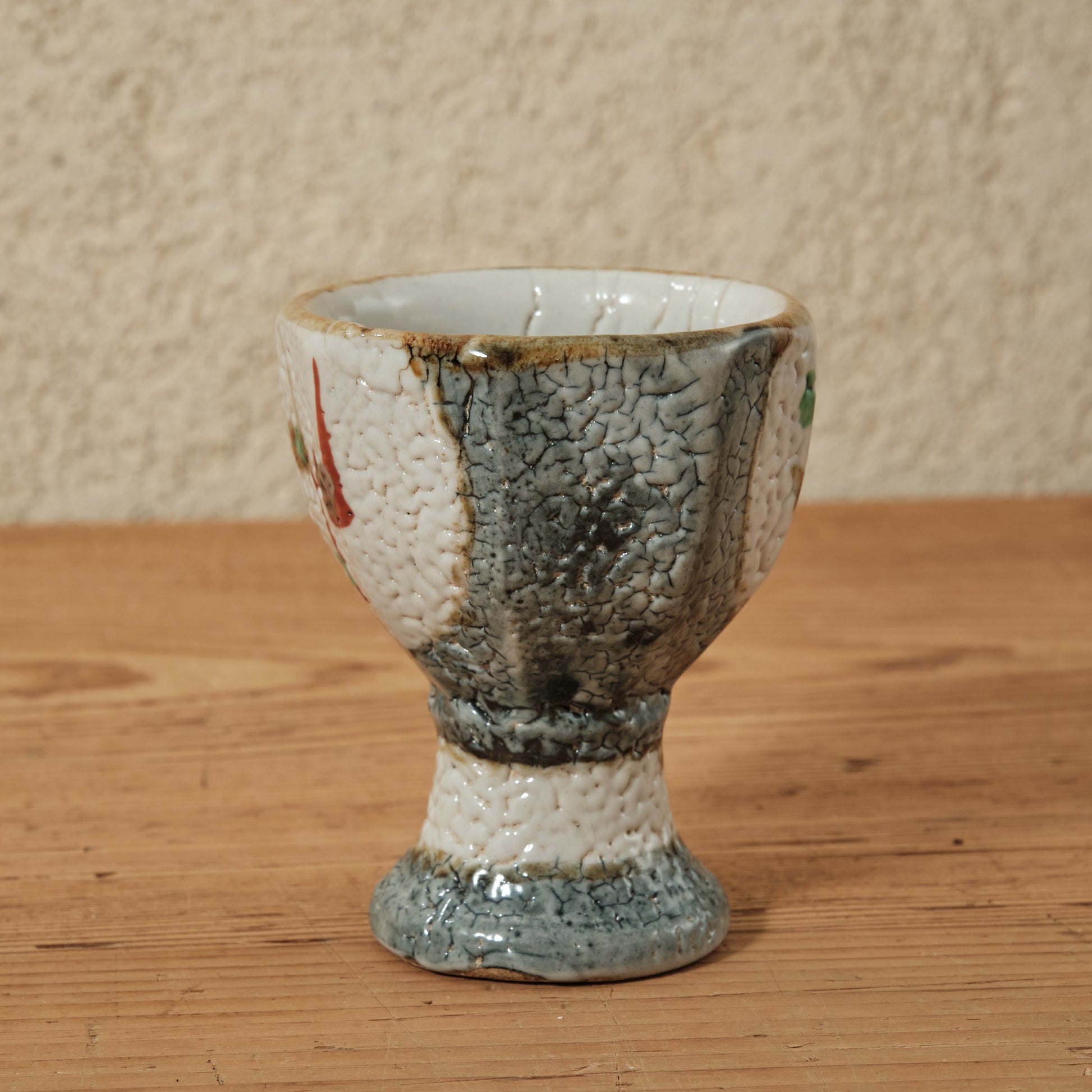 泥並白釉の上に浮かぶ赤と緑の彩が軽やかに調和し、梅花皮(かいらぎ)のようなちぢれた肌が深みを添えています。