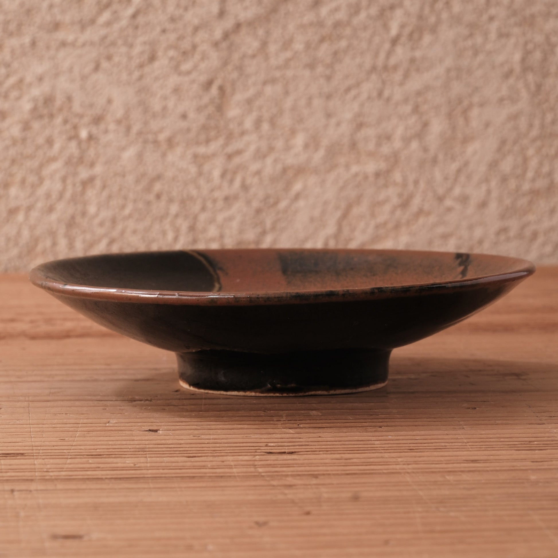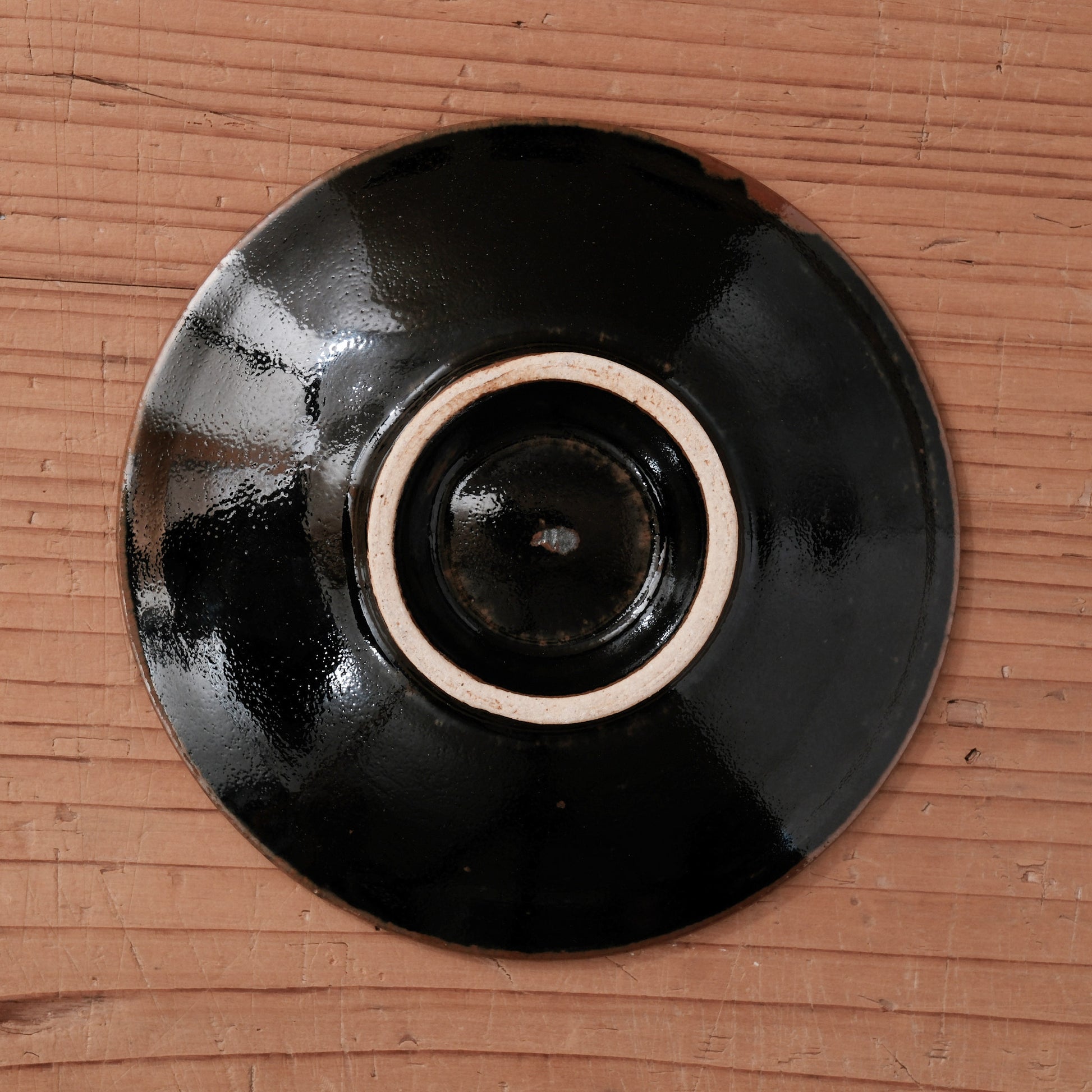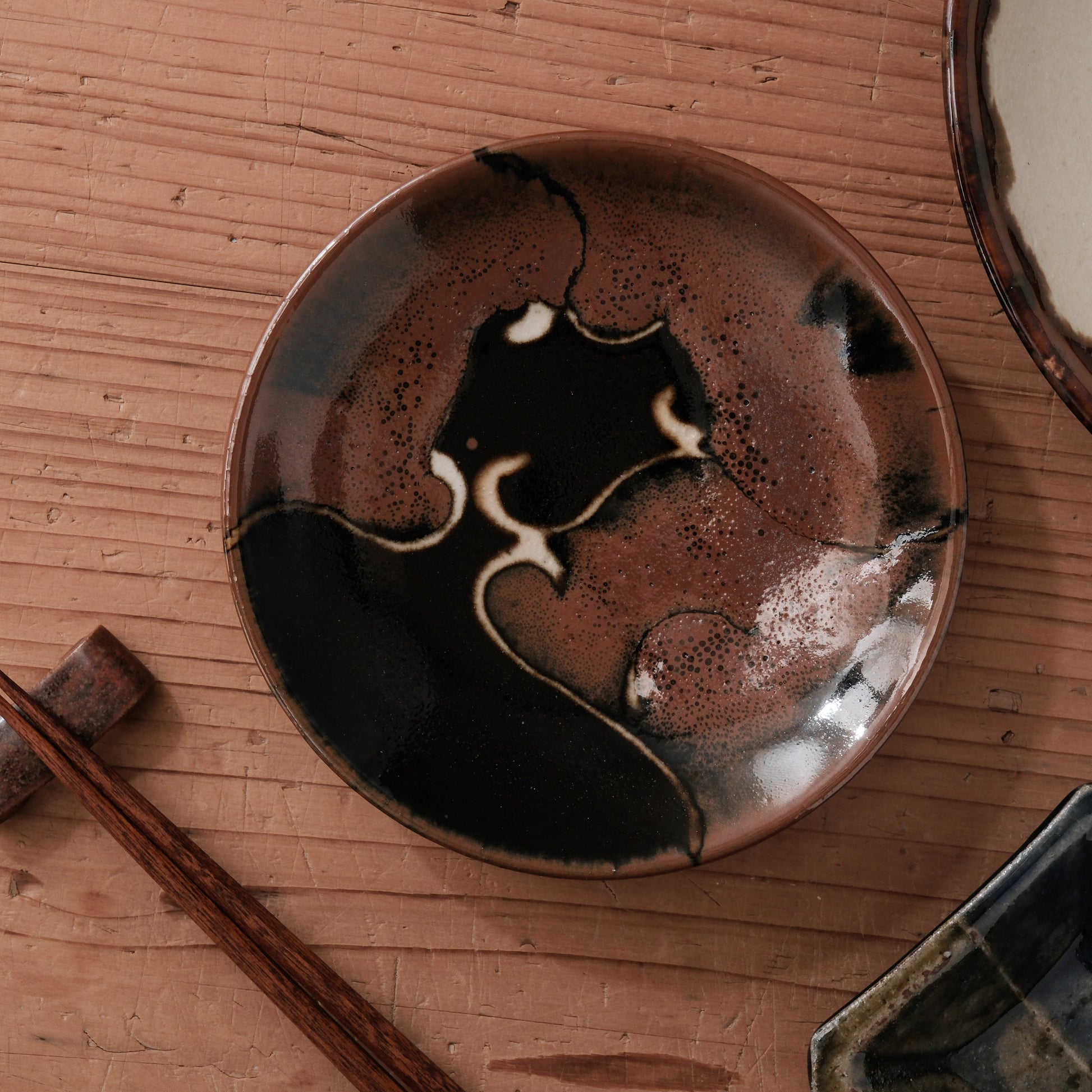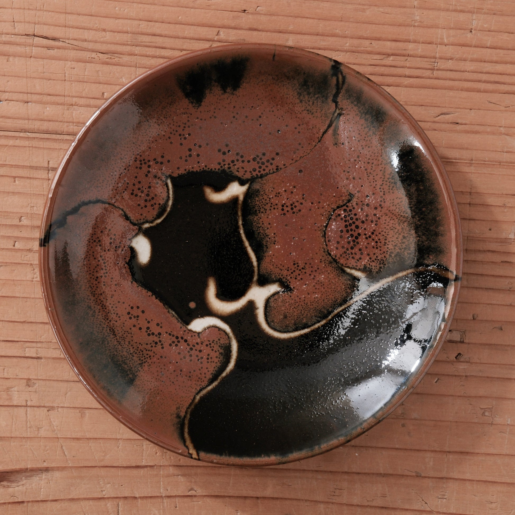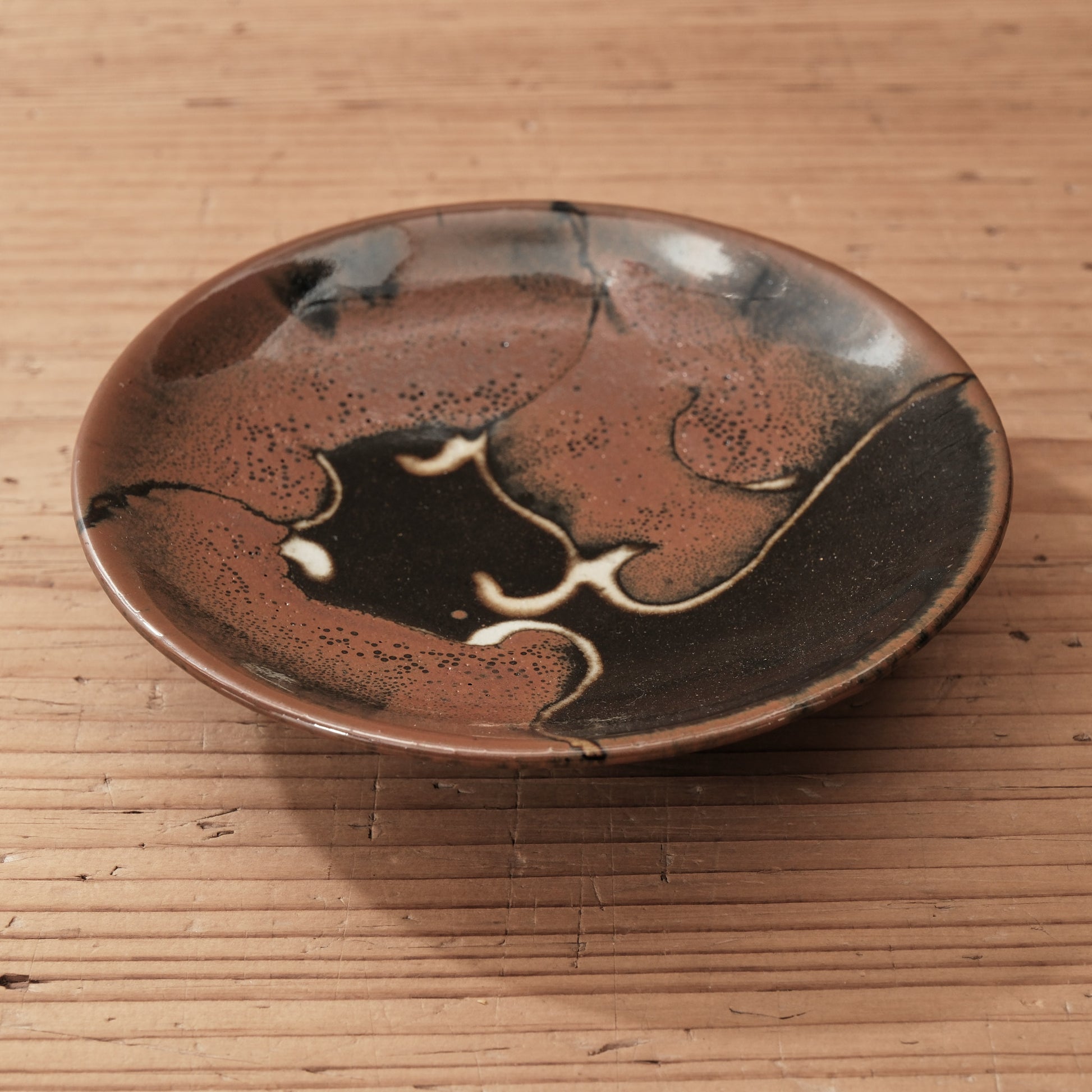 柿釉の深みある色合いに、抜絵による白い文様が印象的な、5寸サイズの中皿です。