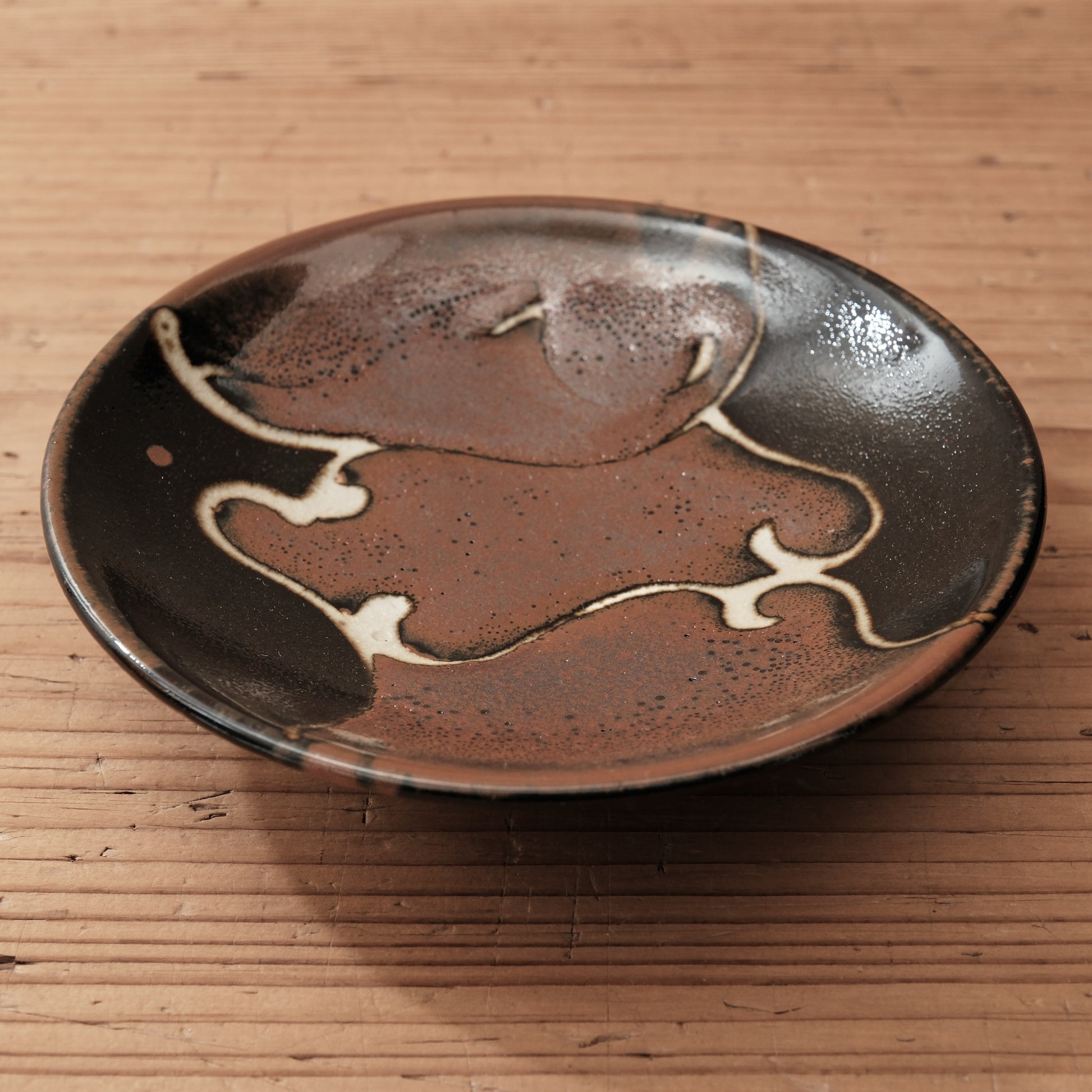 柿釉の深みある色合いに、抜絵による白い文様が印象的な、5寸サイズの中皿です。