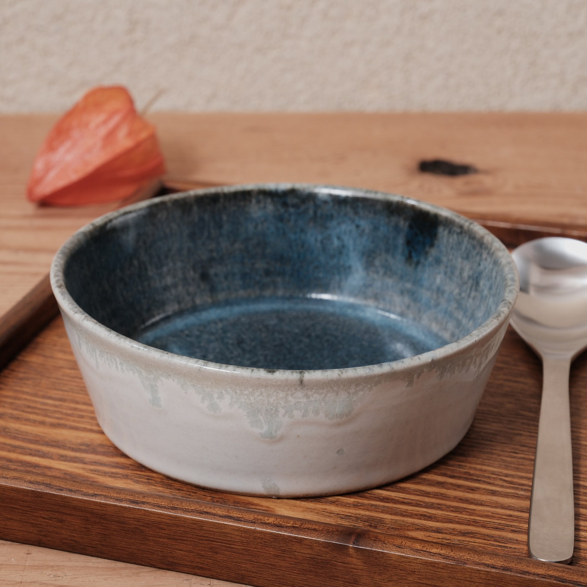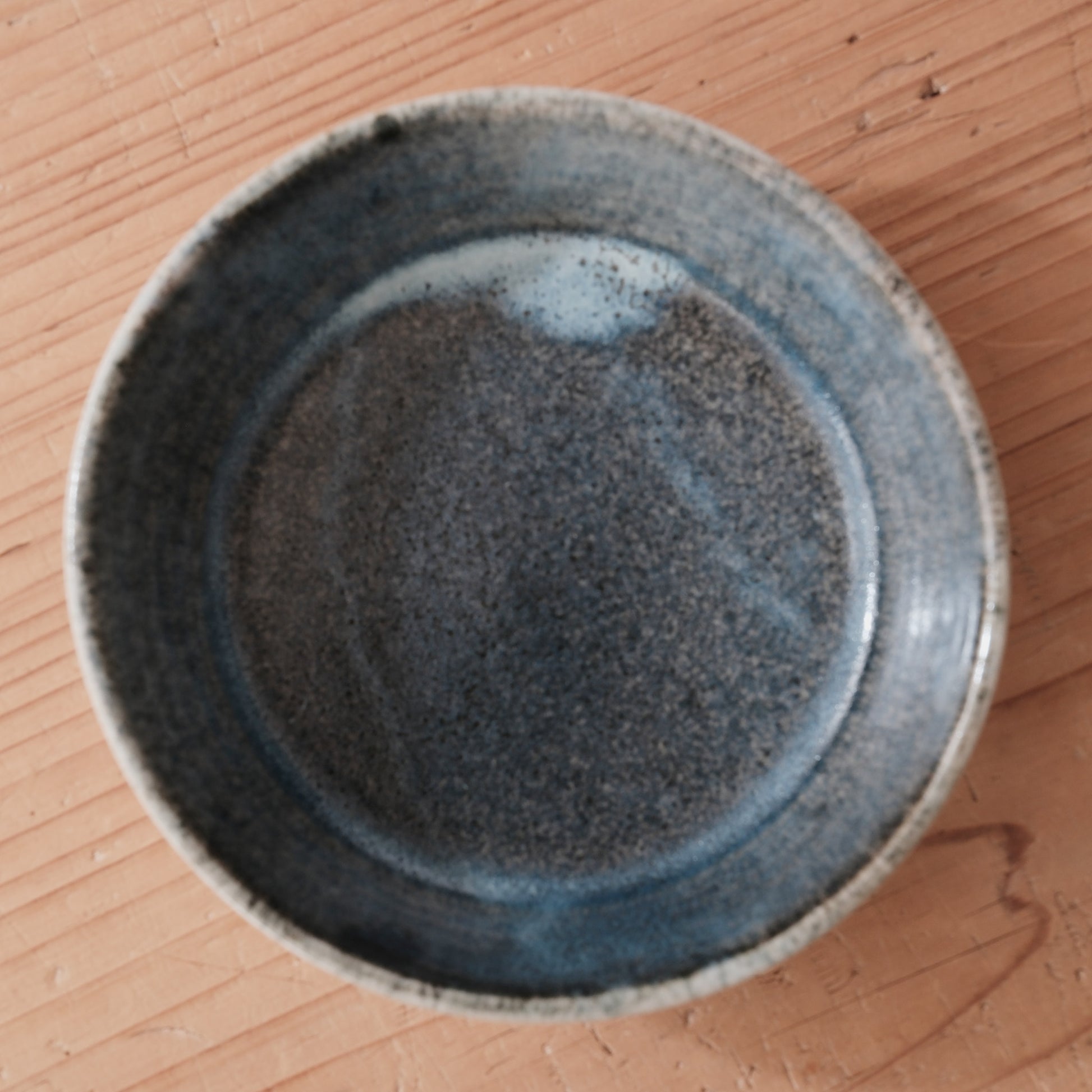 内側には深みのある青灰釉、外側にはやや淡い釉調があらわれ、