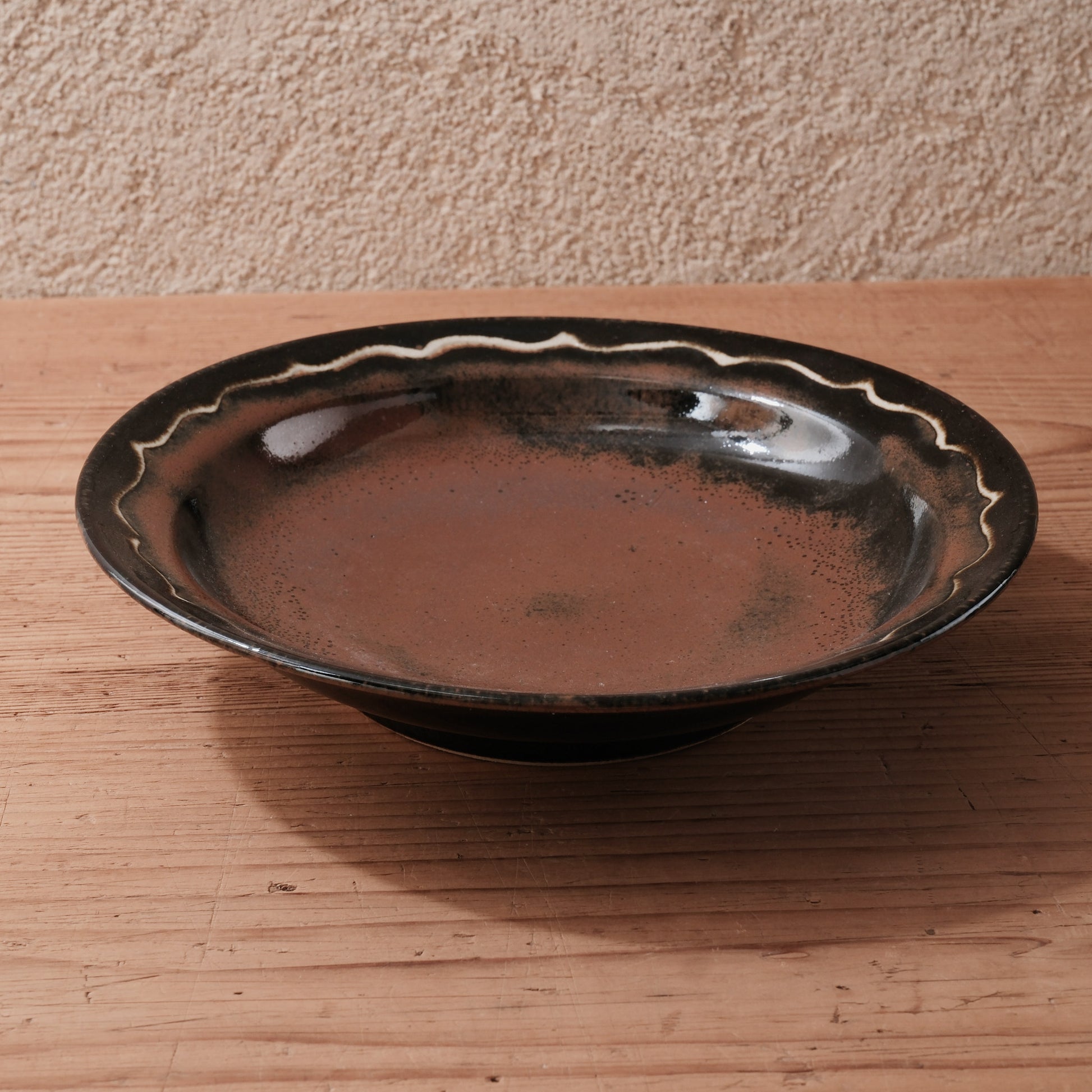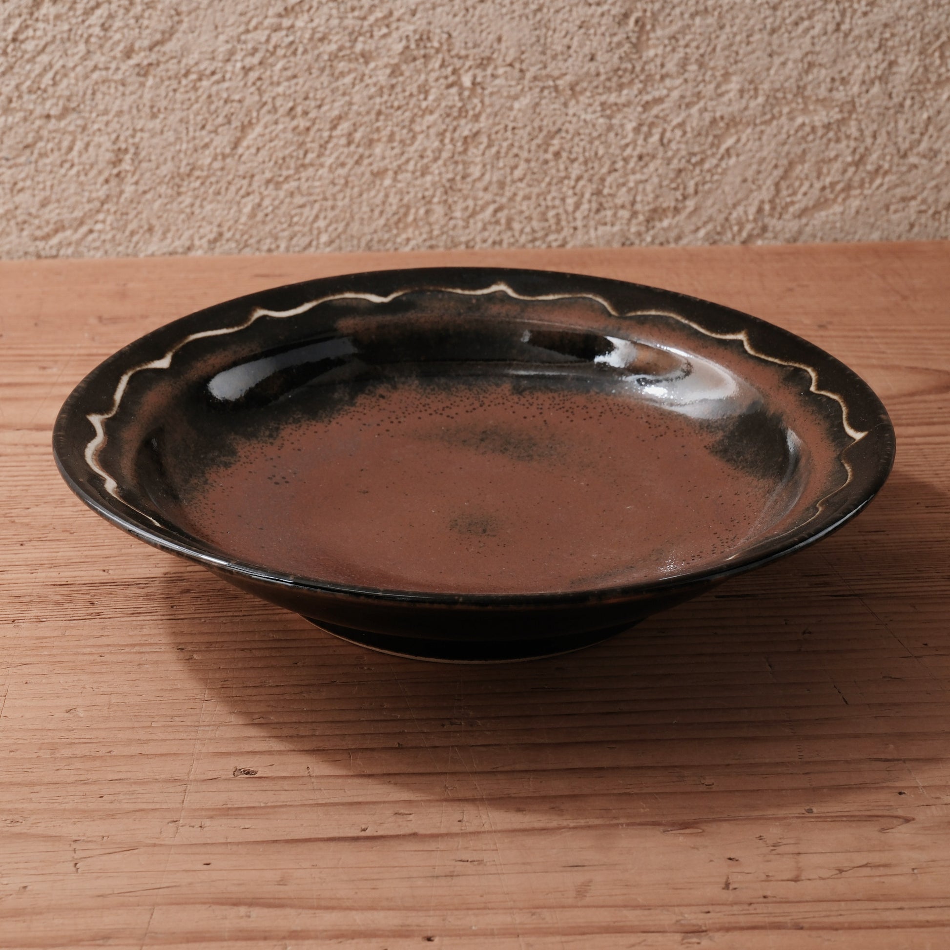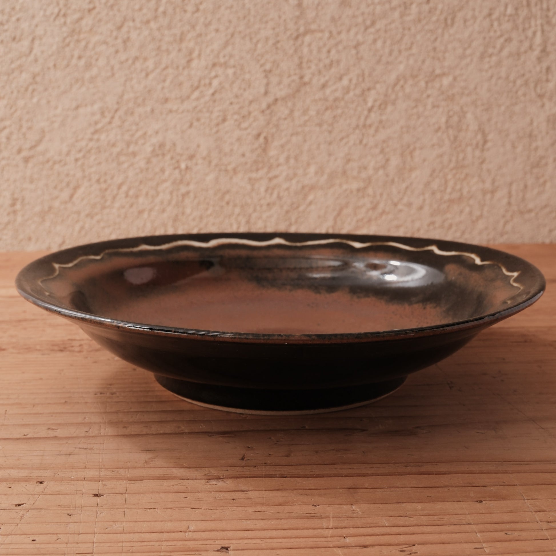 やわらかな丸みをもつ器体に、波打つ縁取りを施した、柿黒釉の8寸大鉢です。