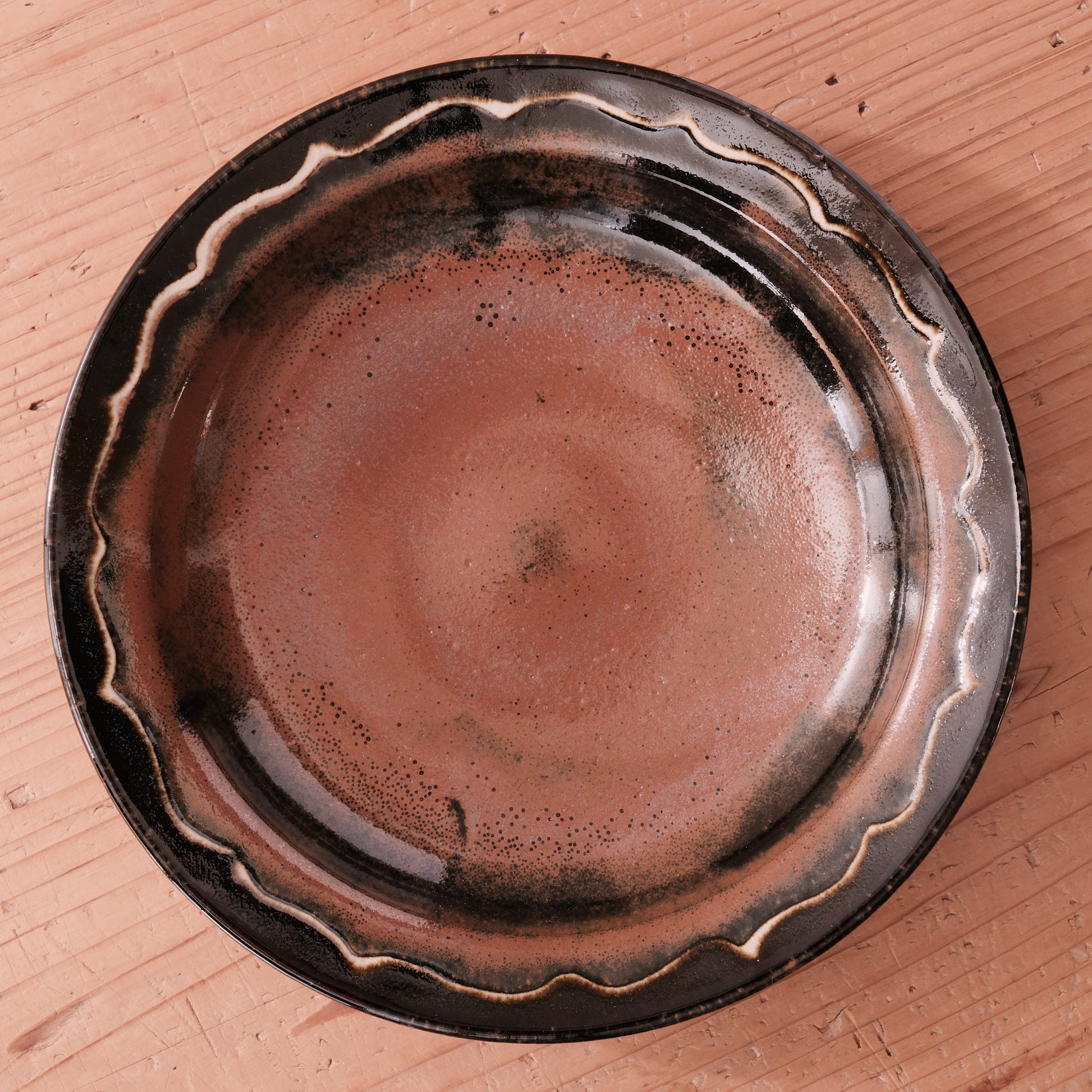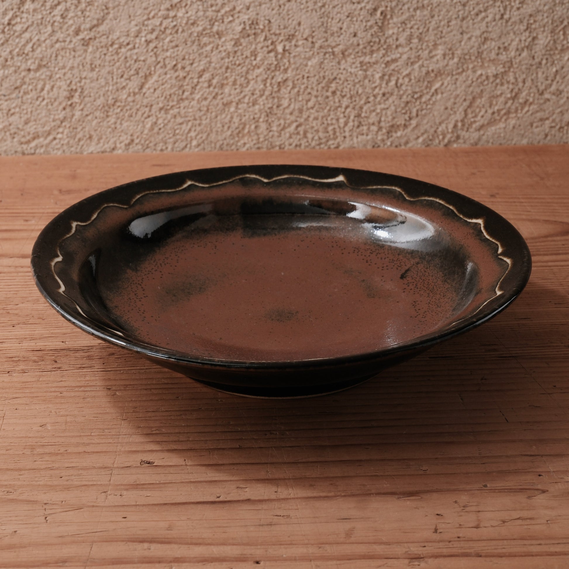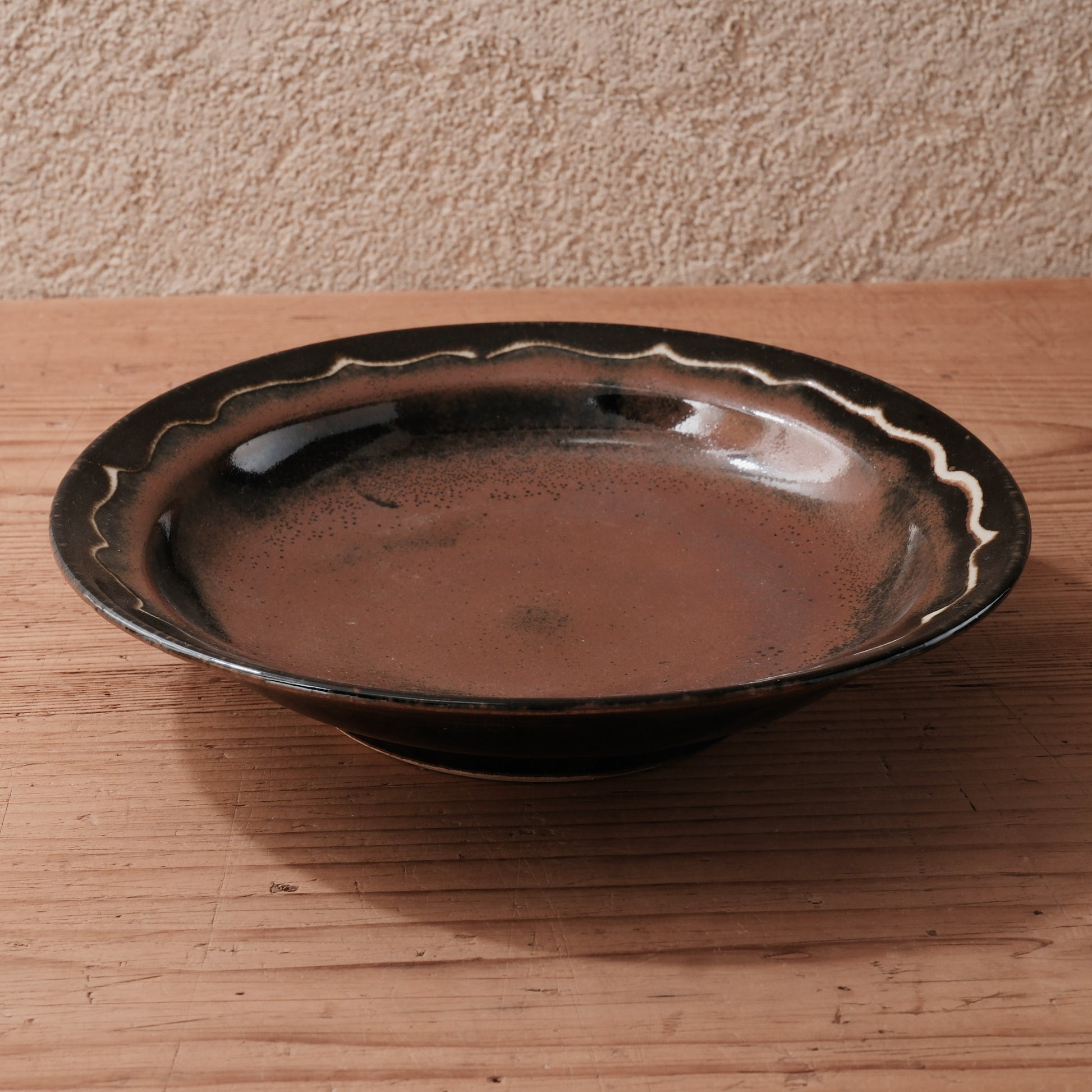 やわらかな丸みをもつ器体に、波打つ縁取りを施した、柿黒釉の8寸大鉢です。