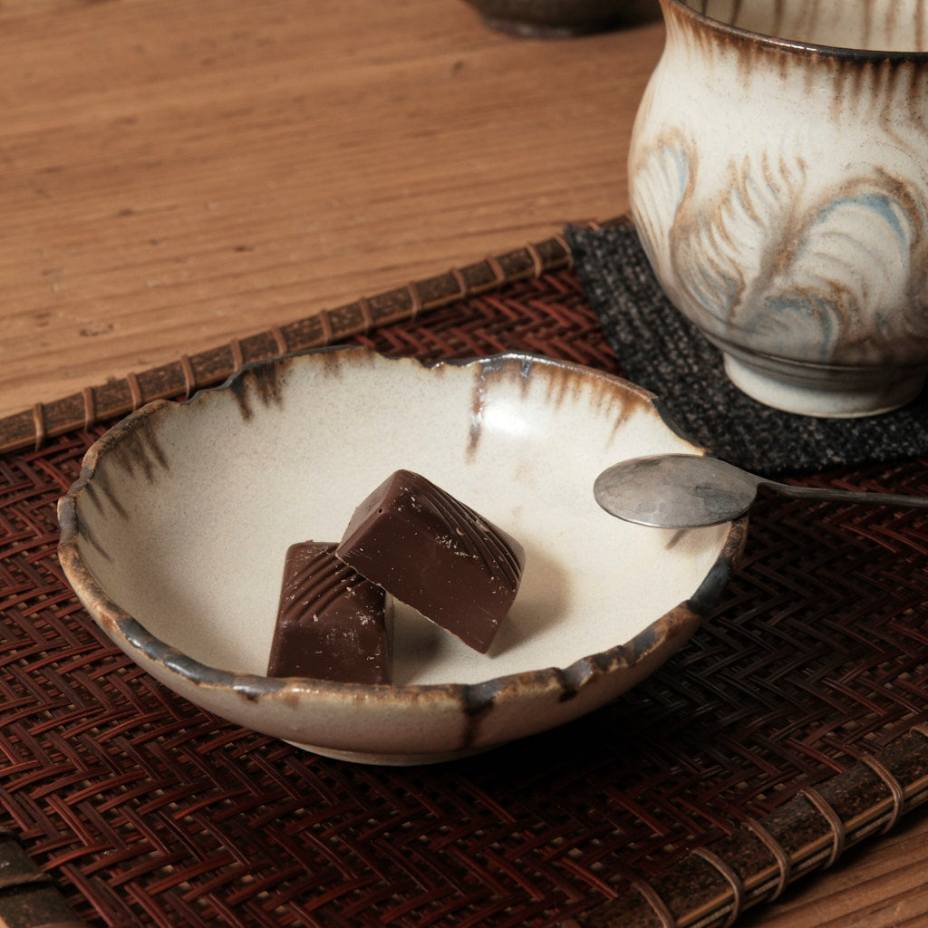 器の縁へと流れるように現れたブラウンの表情が印象的な深小皿です。