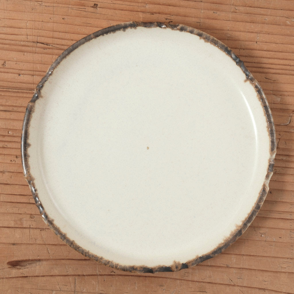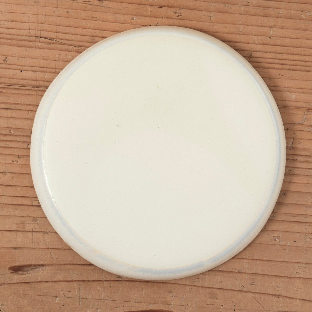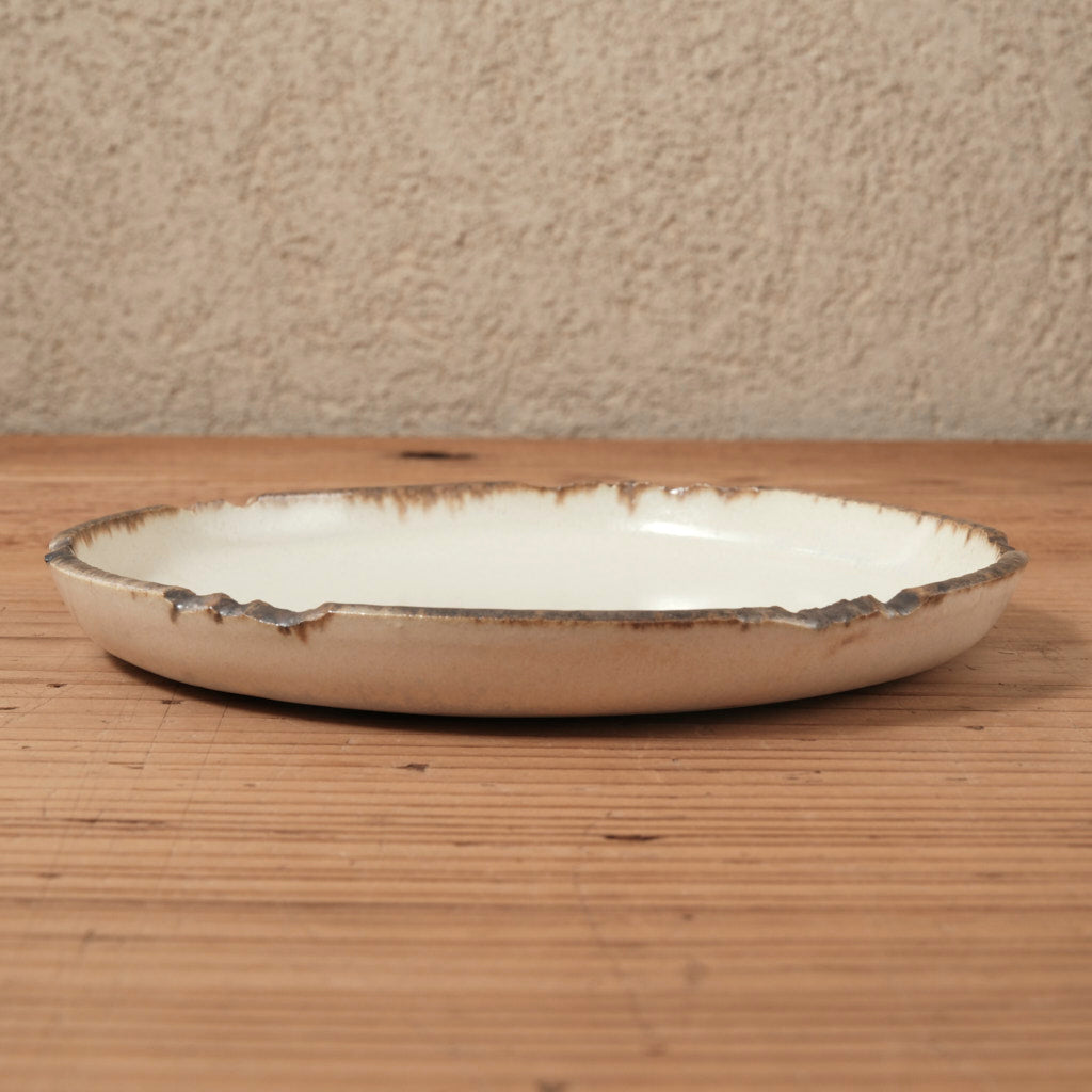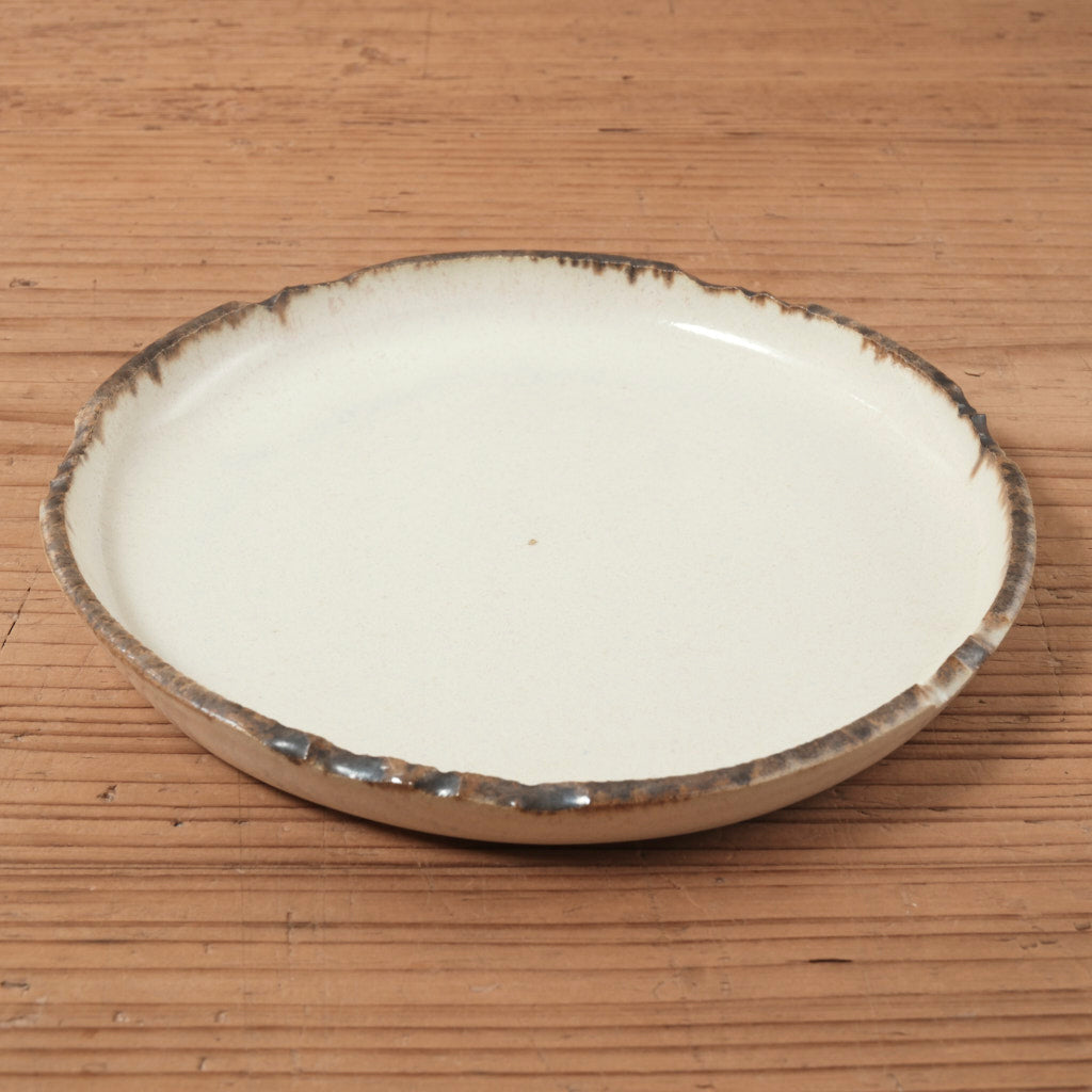 淡いアイボリーの釉肌が印象的な、フラットリムの中皿です。