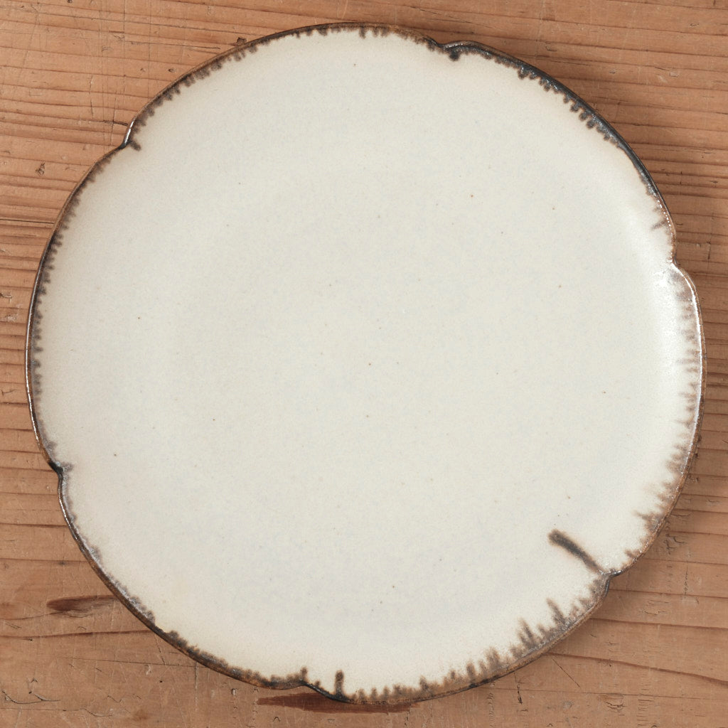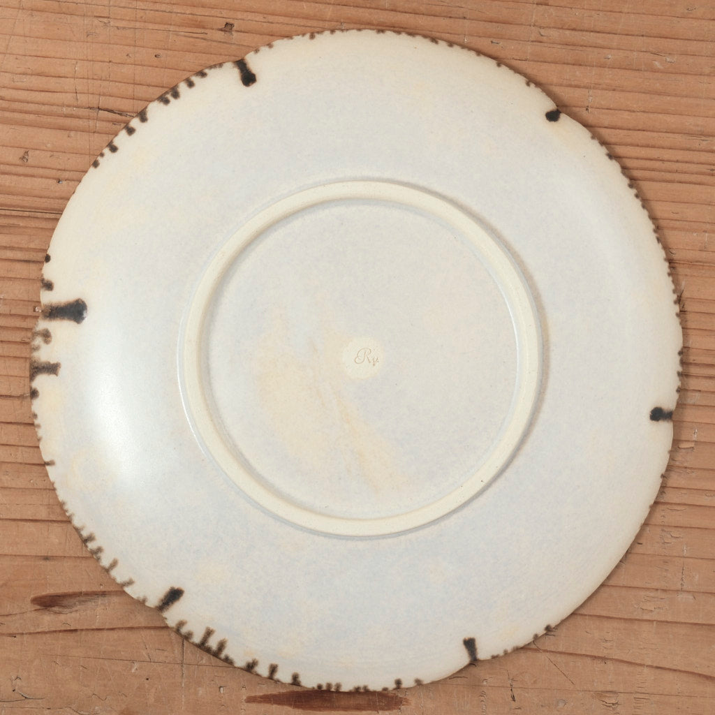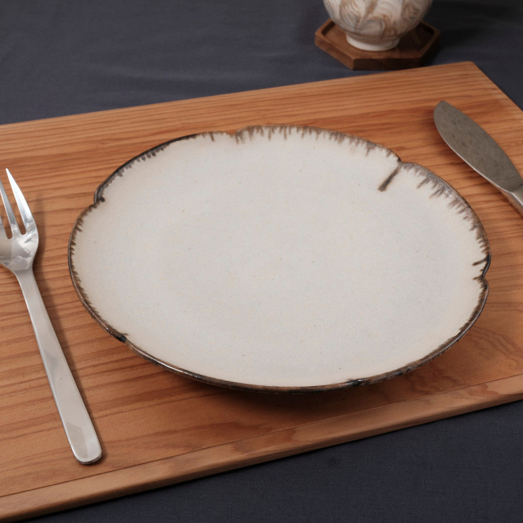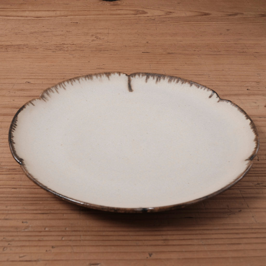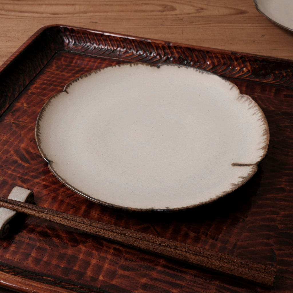 一見すると穏やかな印象の中皿ですが、縁に施された黒茶のラインが、全体を静かに引き締めています。