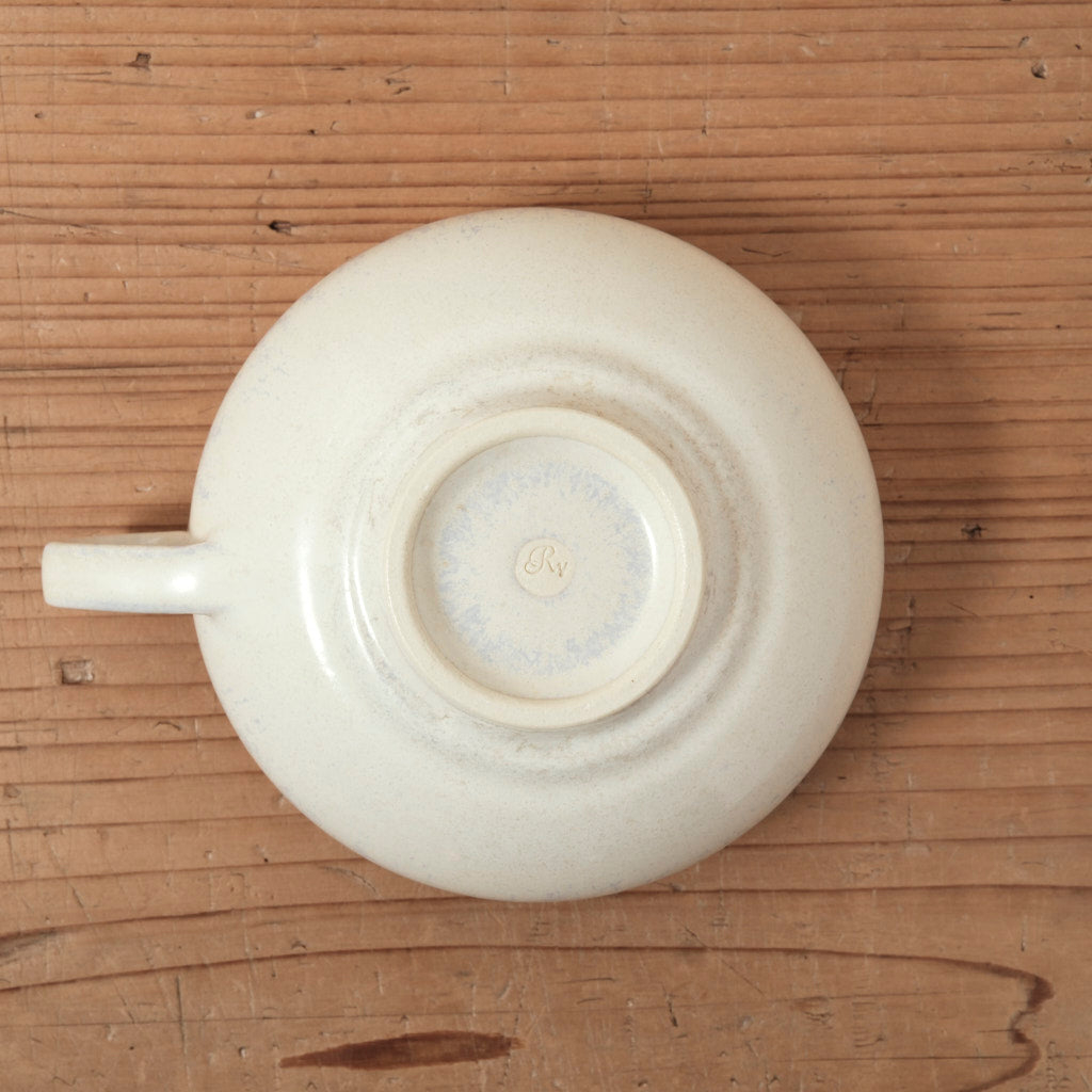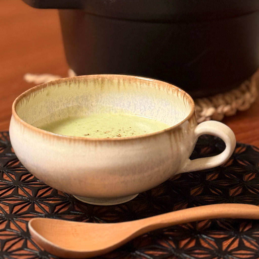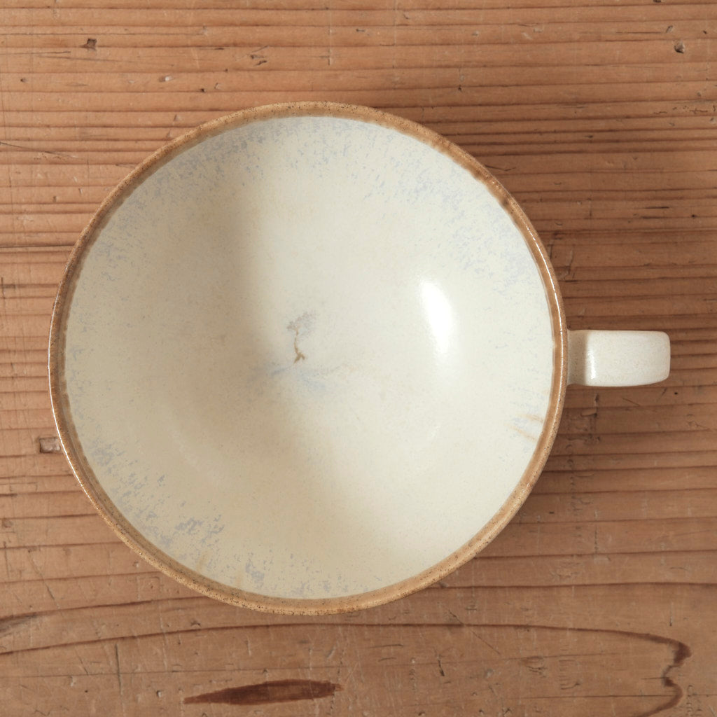 やわらかなアイボリーの釉肌に、ほのかに茶色が溶け込むスープカップ。