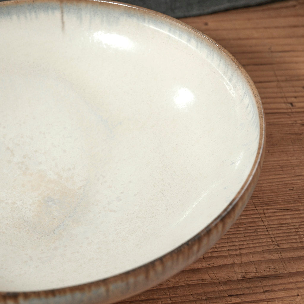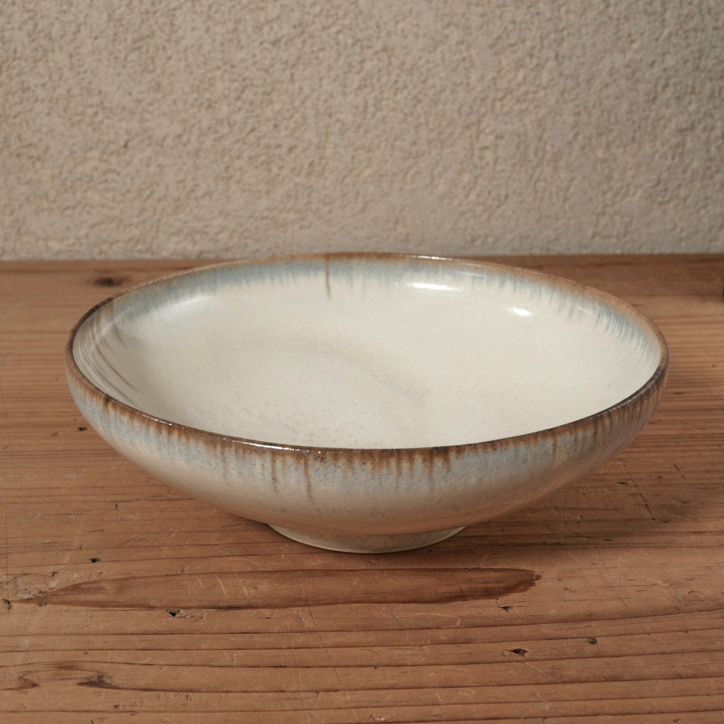 青と茶色の釉薬がゆっくり溶け合うように流れ、縁にかけて表情が現れます。