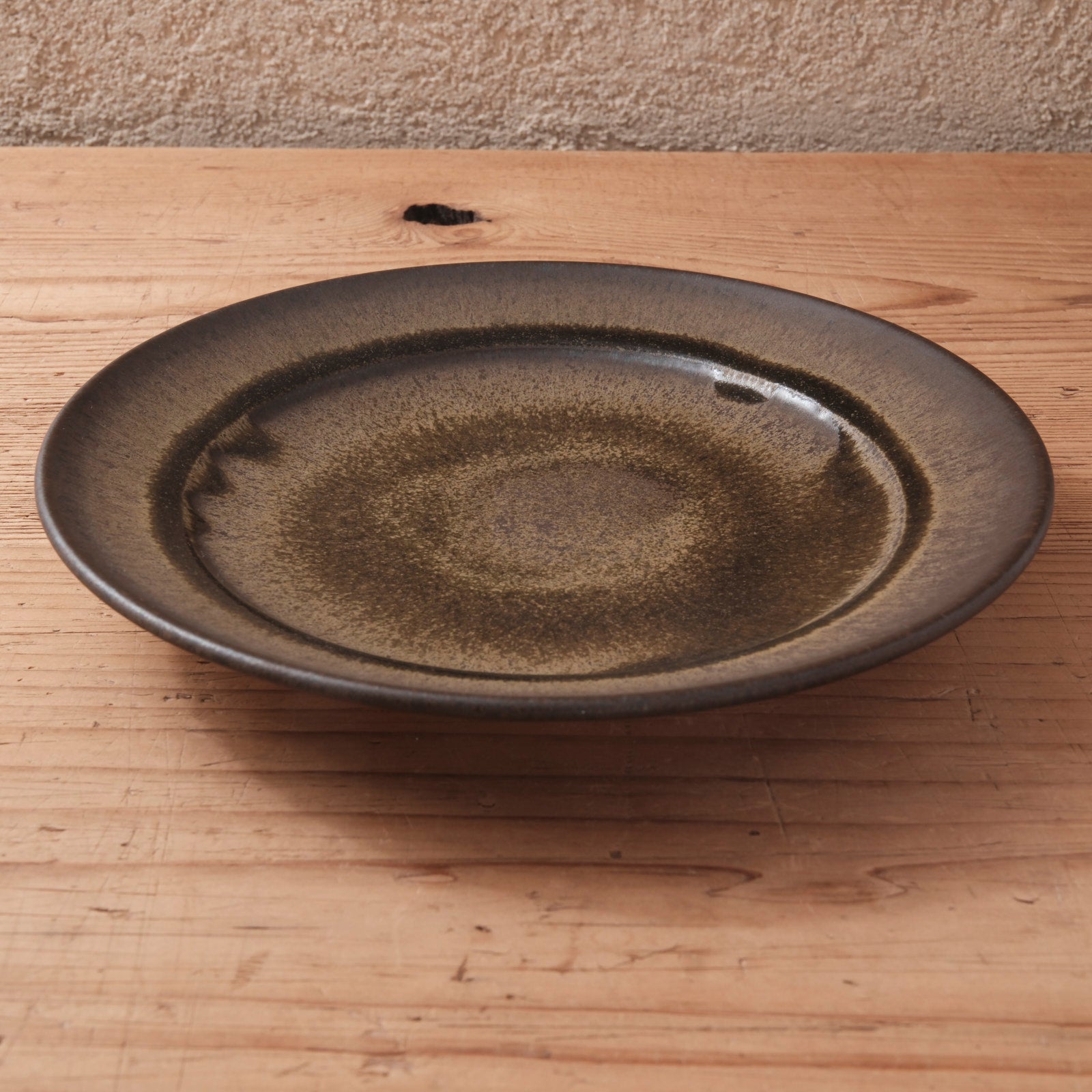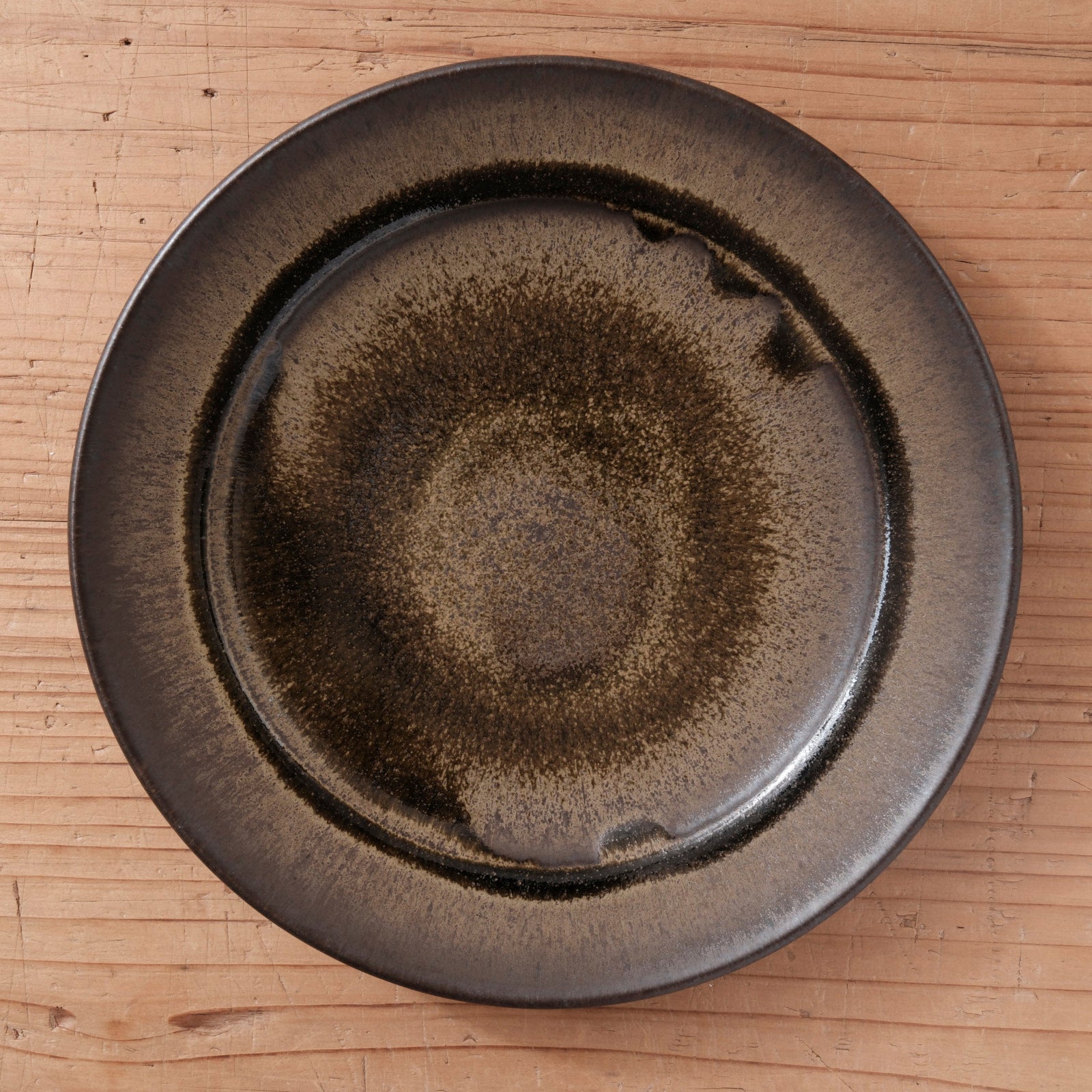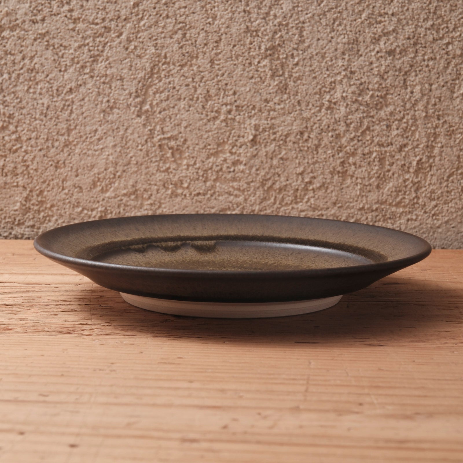 黒釉の重なり合いが、静かな奥行きを感じさせる約21cmのリム皿です。