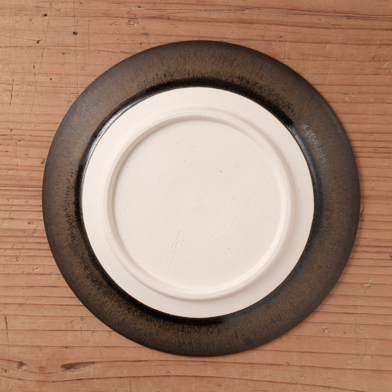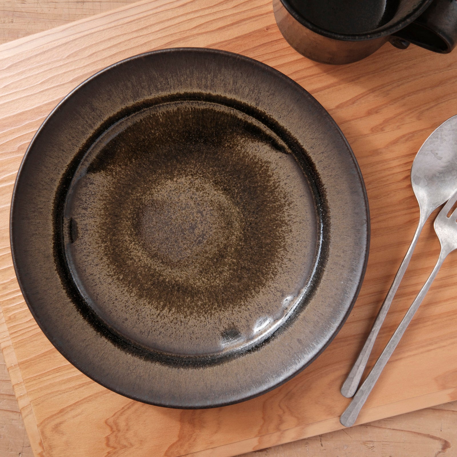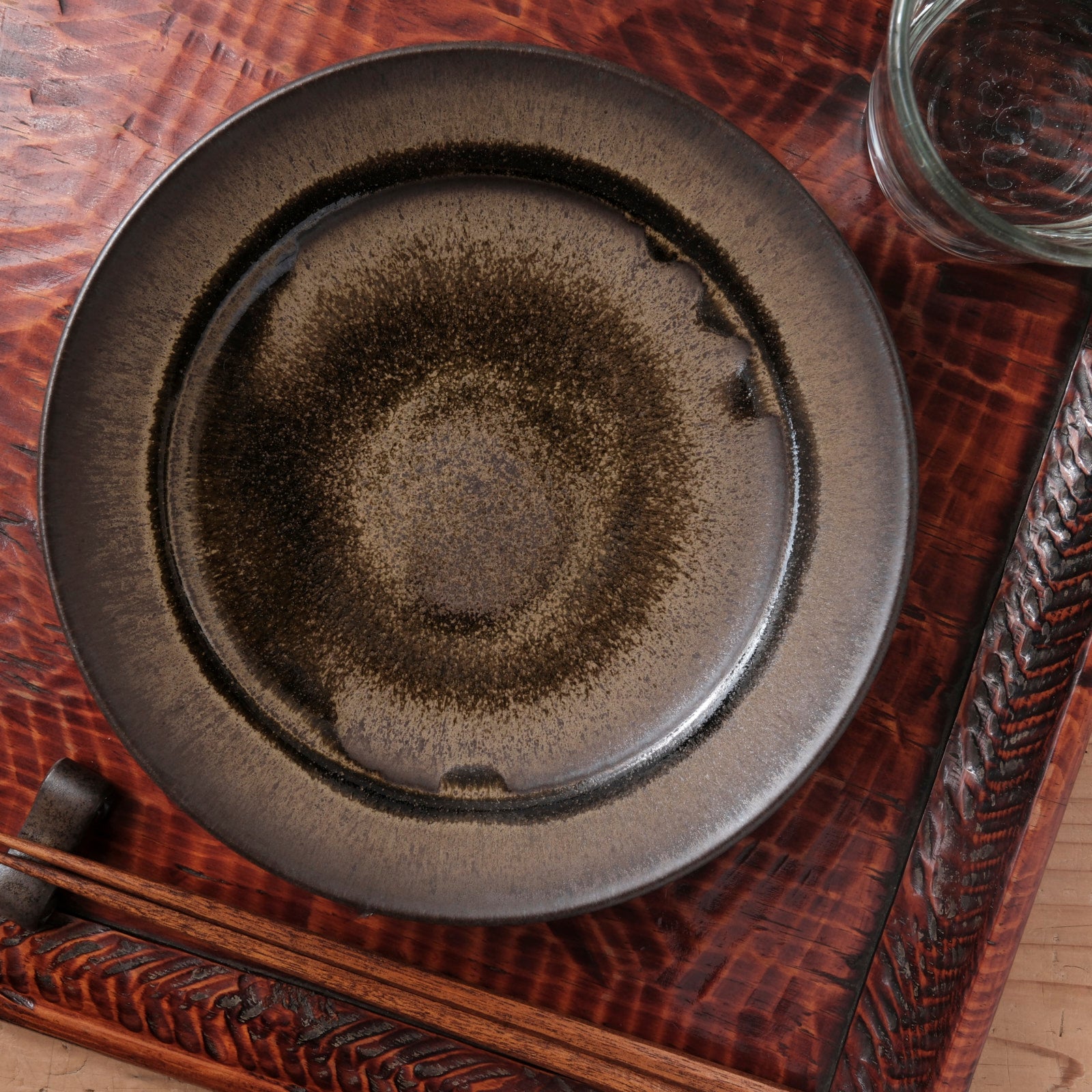 黒釉の重なり合いが、静かな奥行きを感じさせる約21cmのリム皿です。