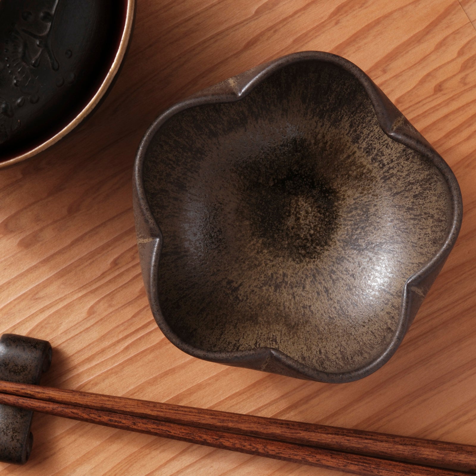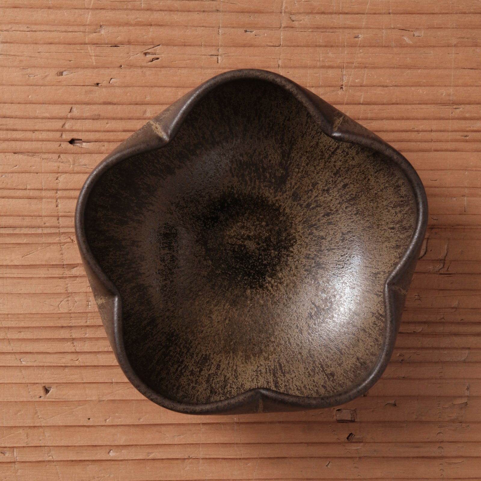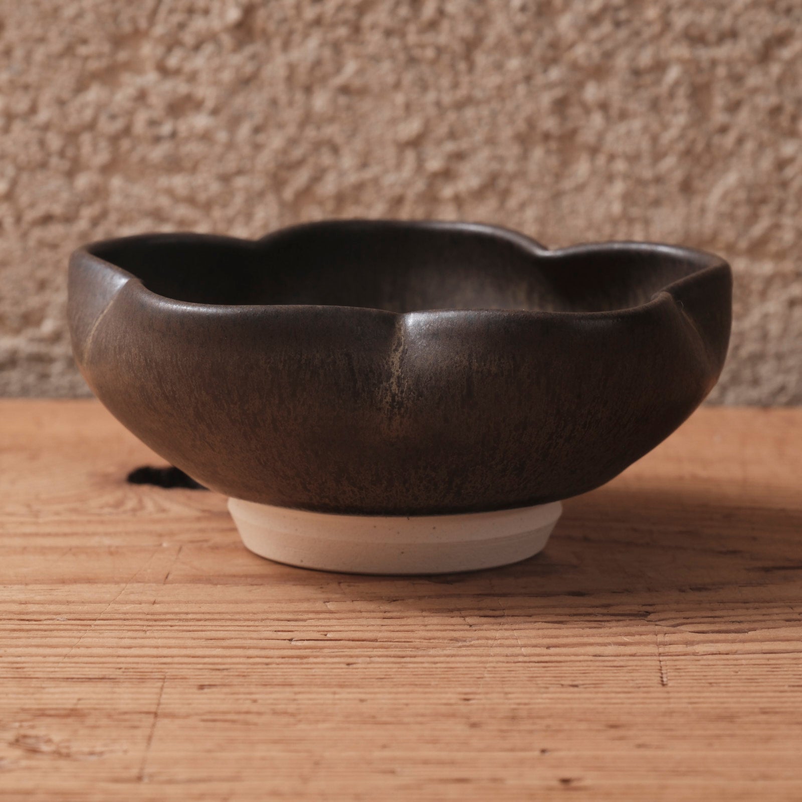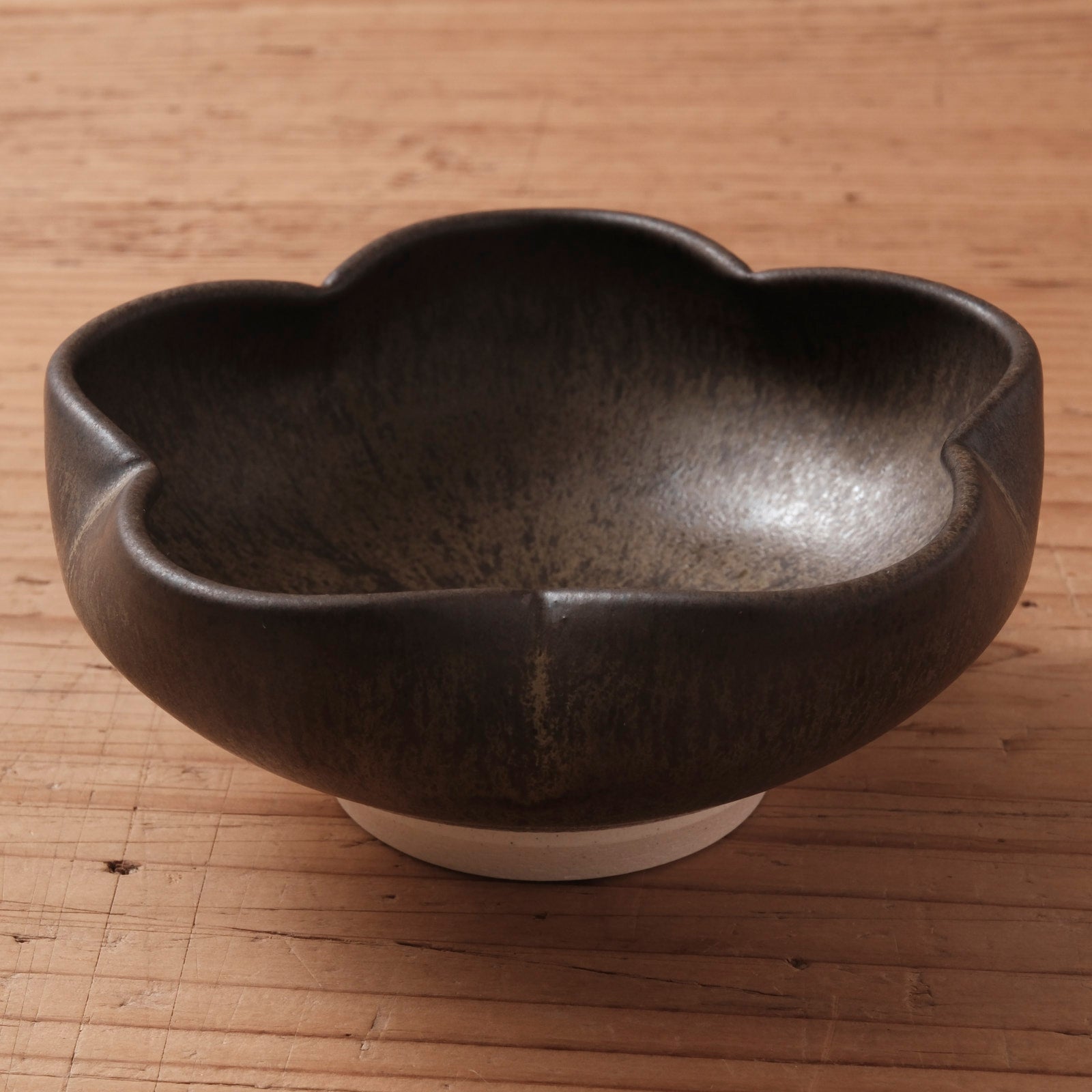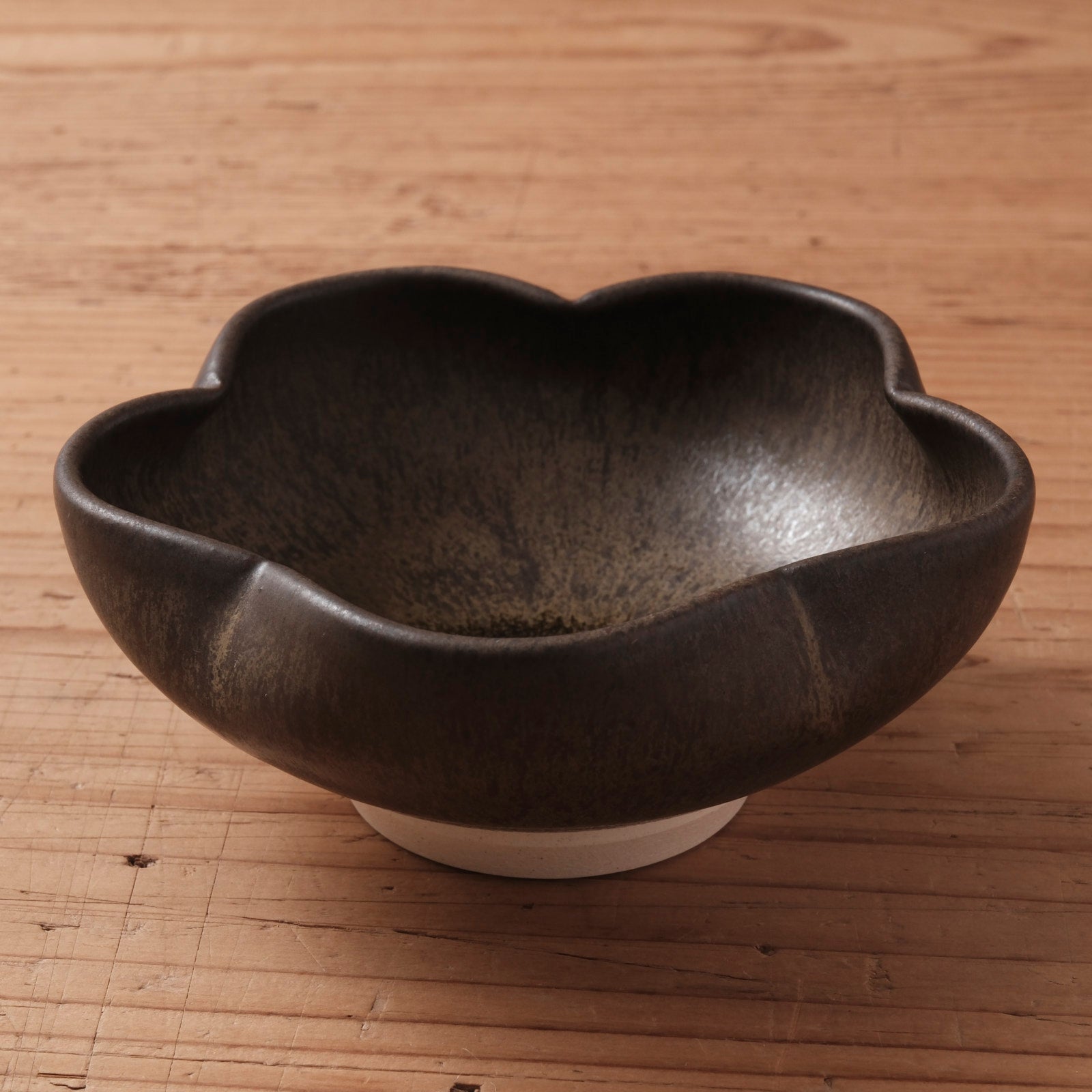 やわらかく花がひらくような輪郭を、深みのある黒釉で包み込んだ輪花小鉢です。
