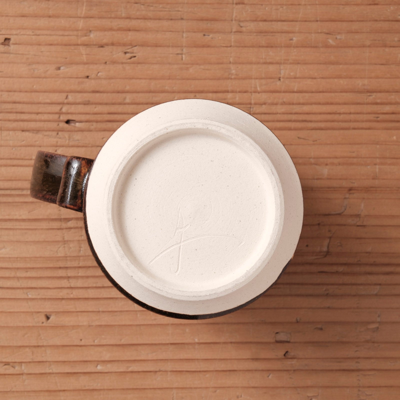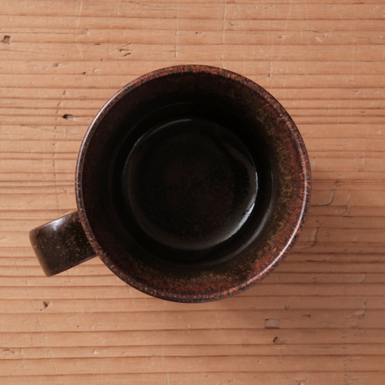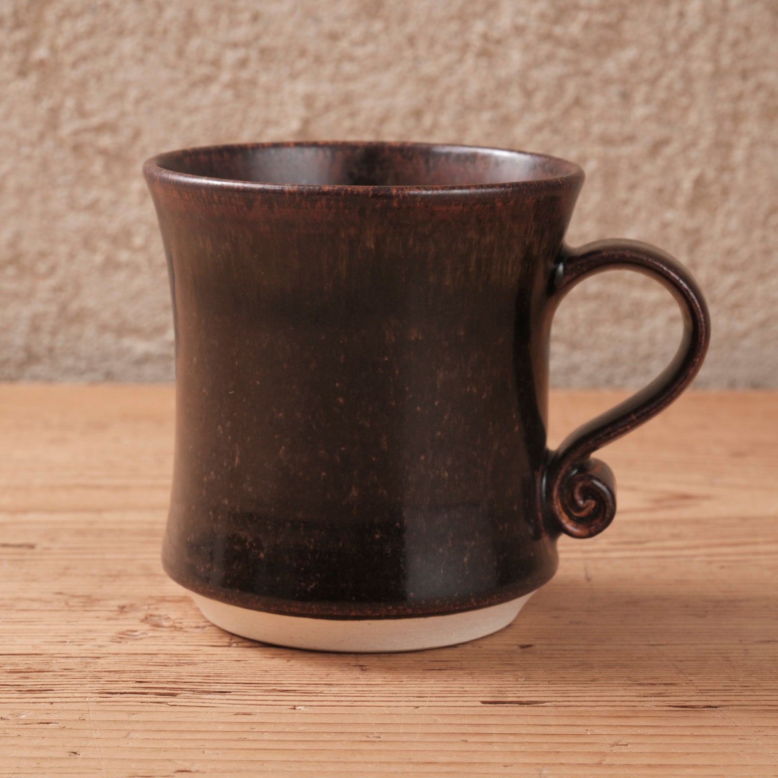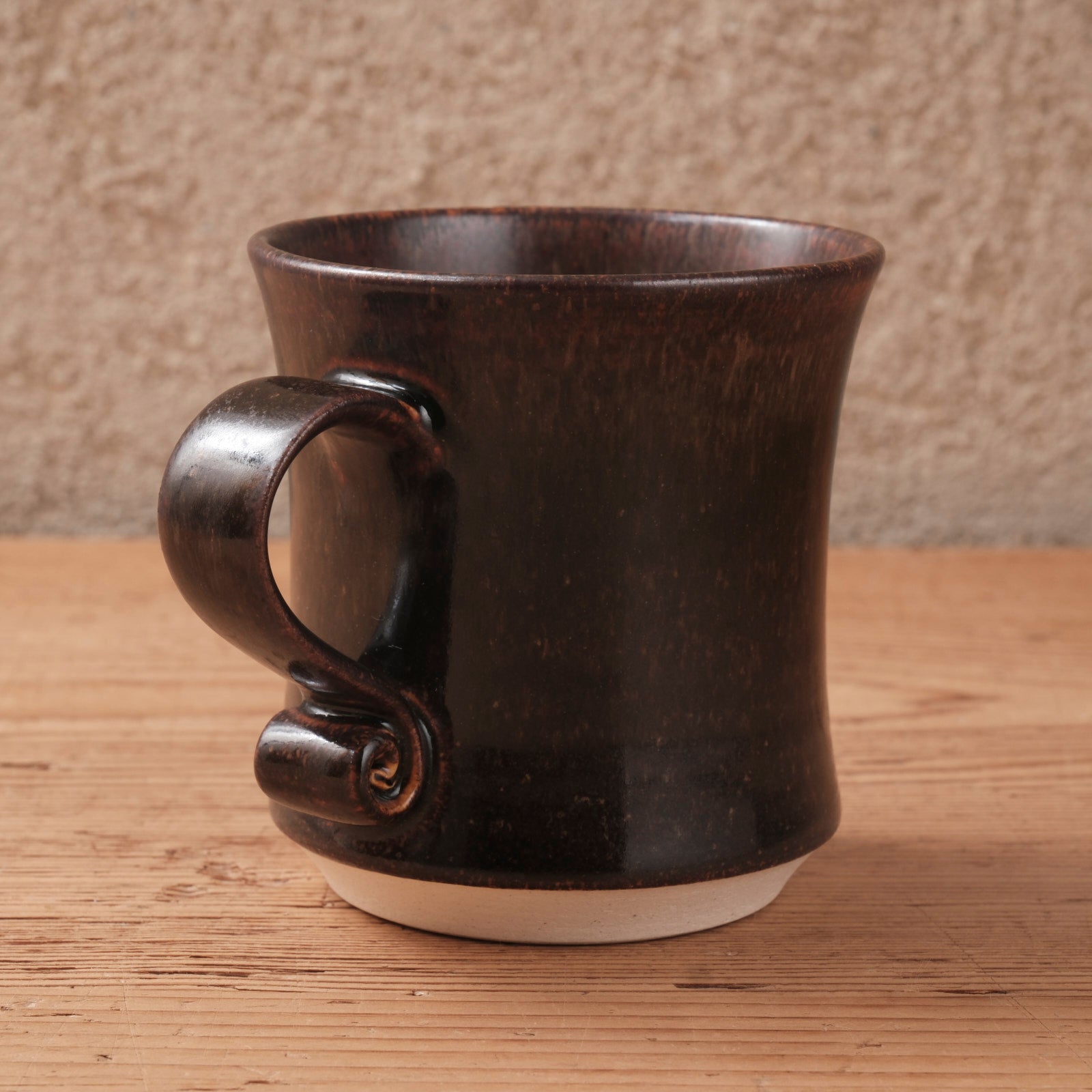 濃い茶色の蕎麦釉に包まれた、落ち着いた佇まいのマグカップです。
