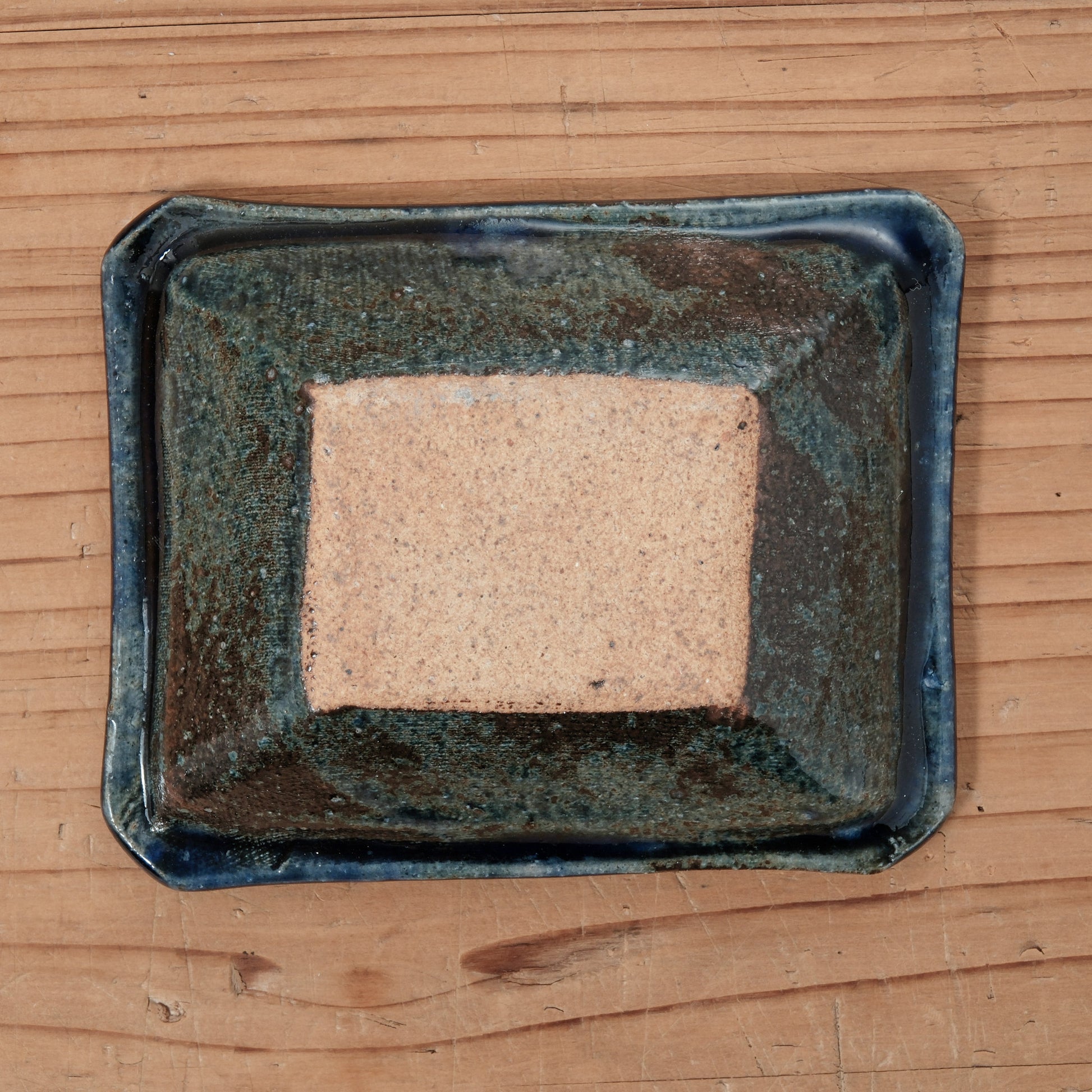 落ち着いた青と織部釉が重なり合い、奥行きのある表情を見せる角小鉢です。
