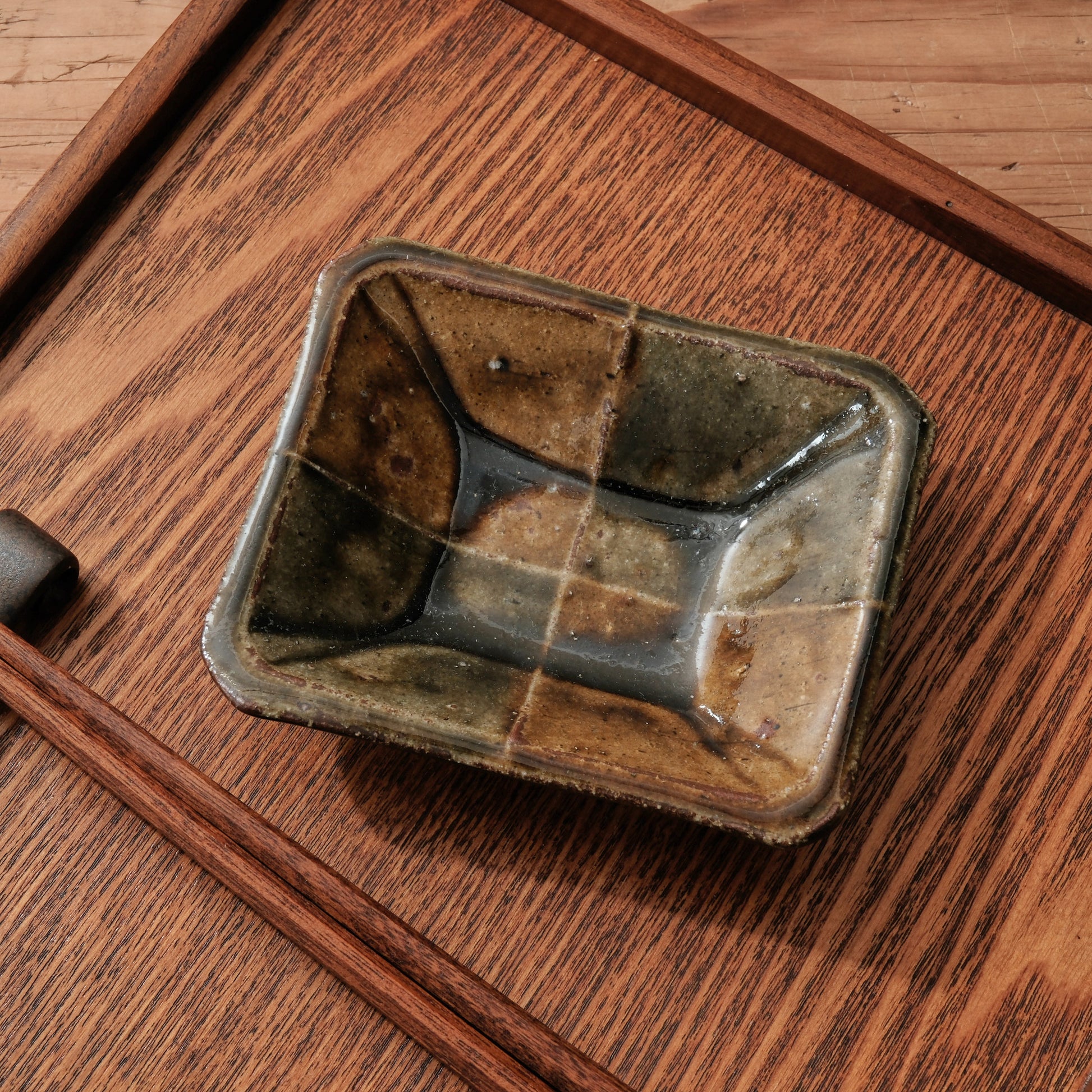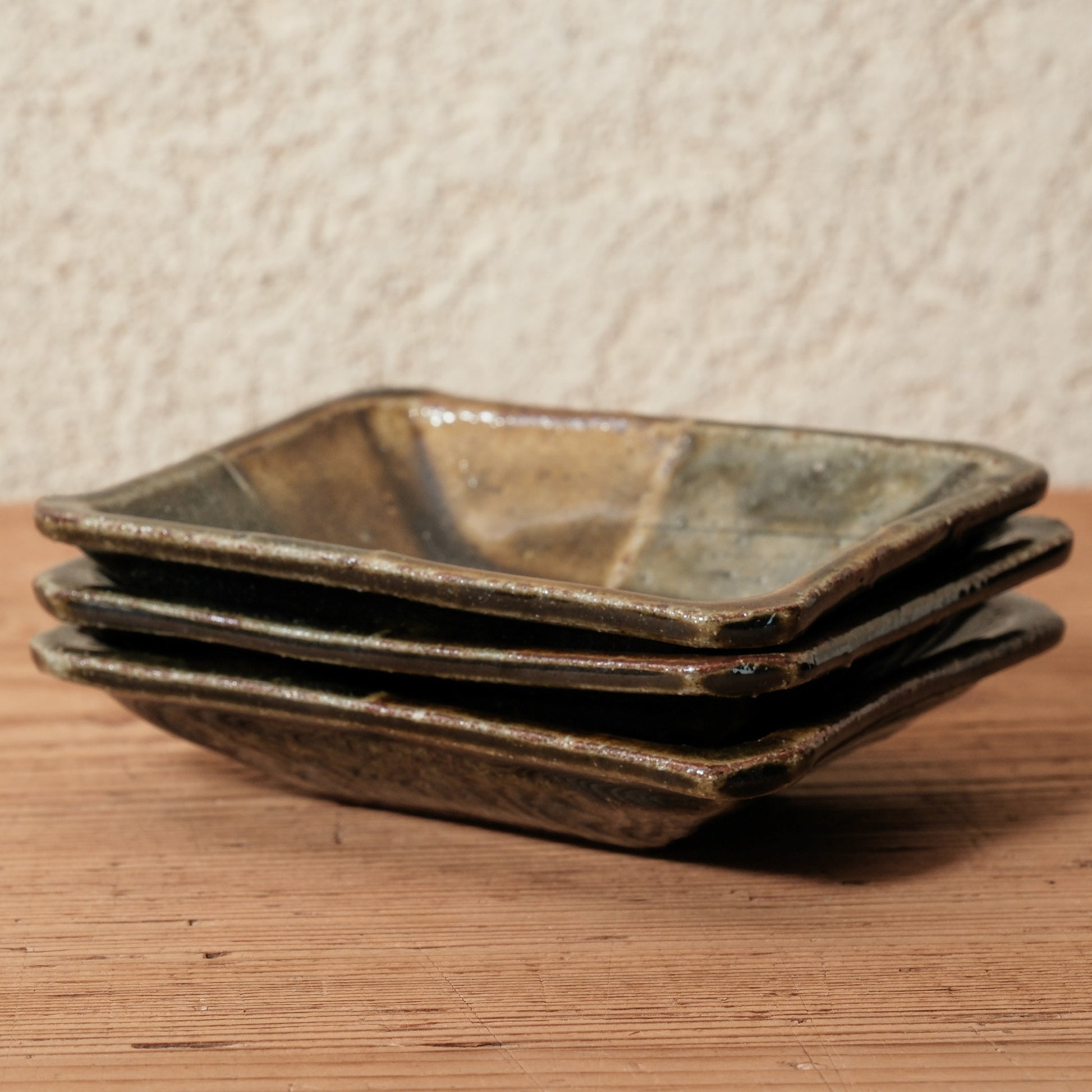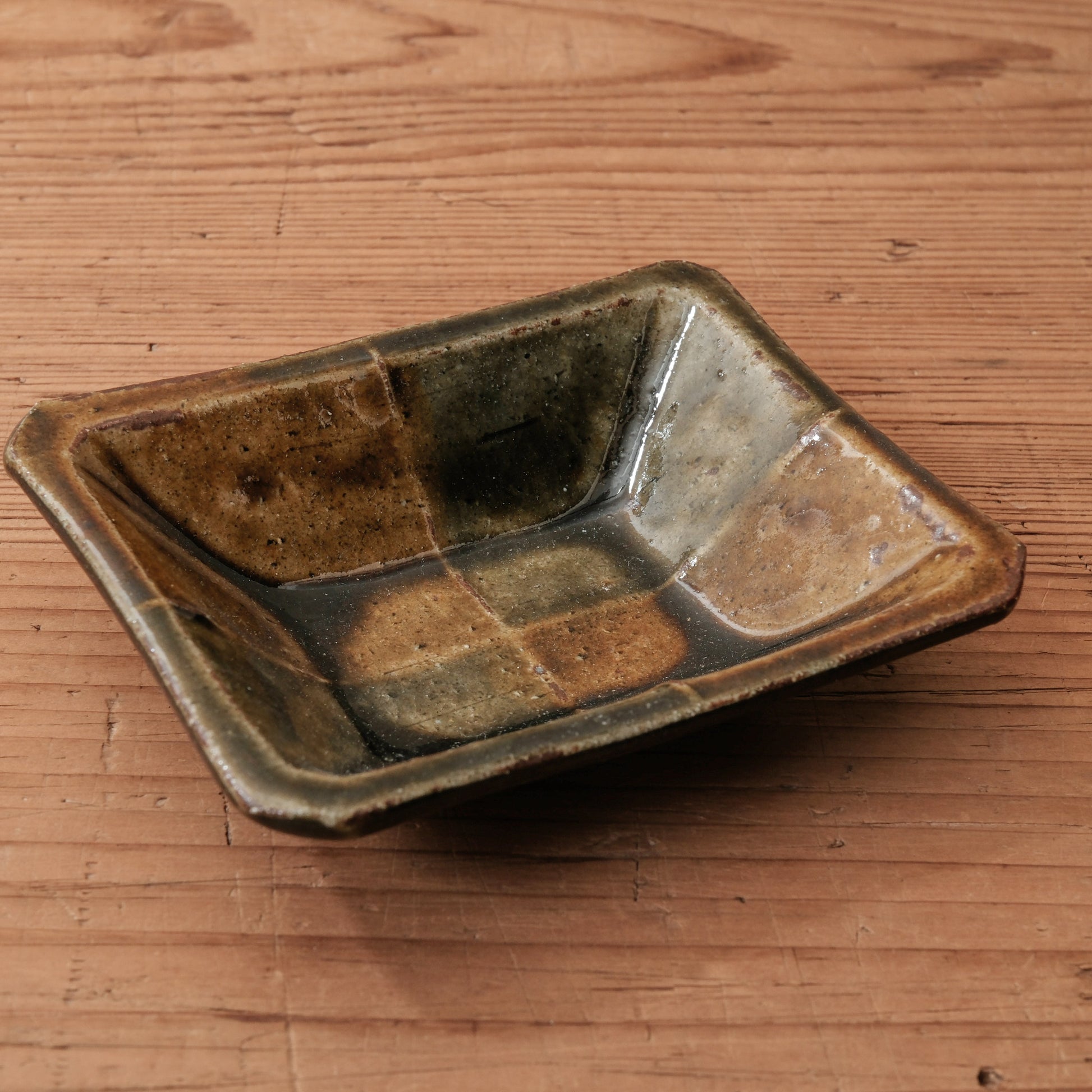 あたたかみのある飴釉に、織部釉の緑が重なり、落ち着いた表情に仕上がった角小鉢です。
