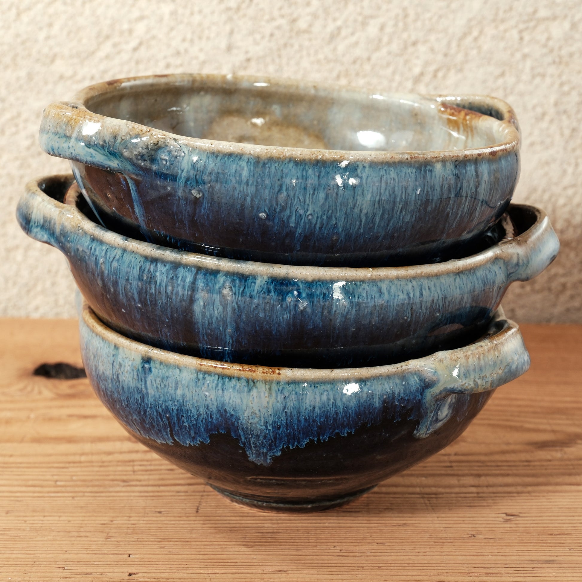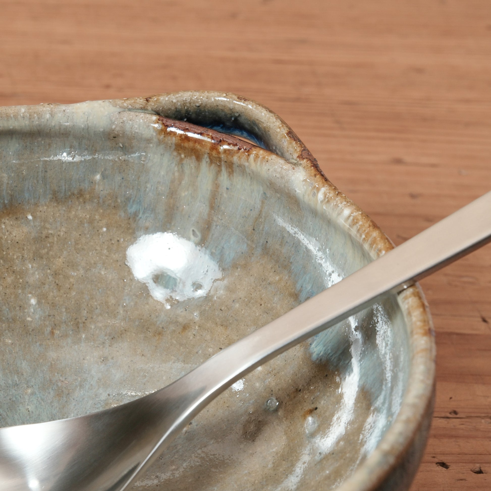 ろくろ成形ならではのやわらかな曲線と、落ち着いた青釉の表情が、温かい料理をやさしく受け止めてくれます。
