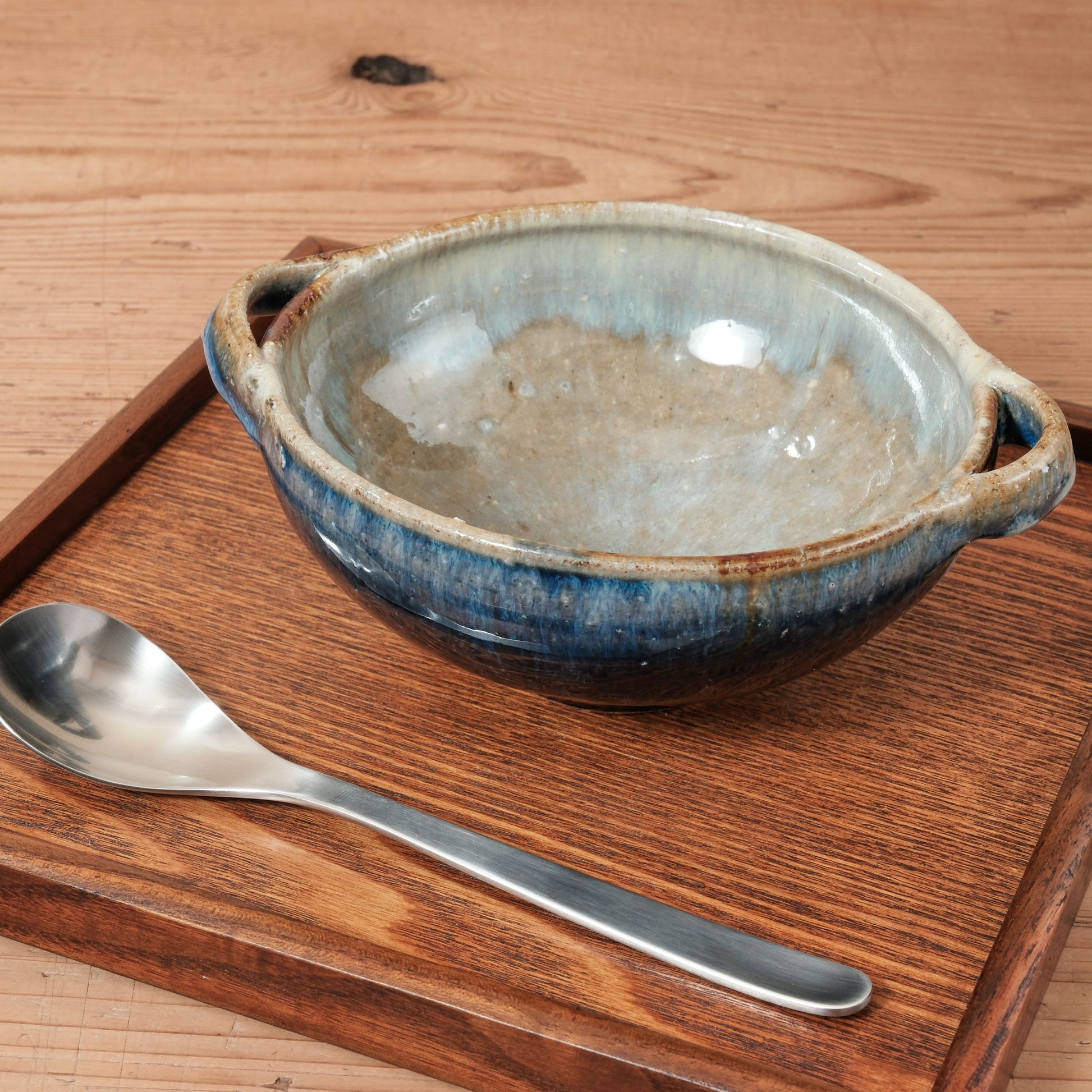 ほどよい深さと安定感のあるかたちに、両側についた耳が印象的なスープカップです。
