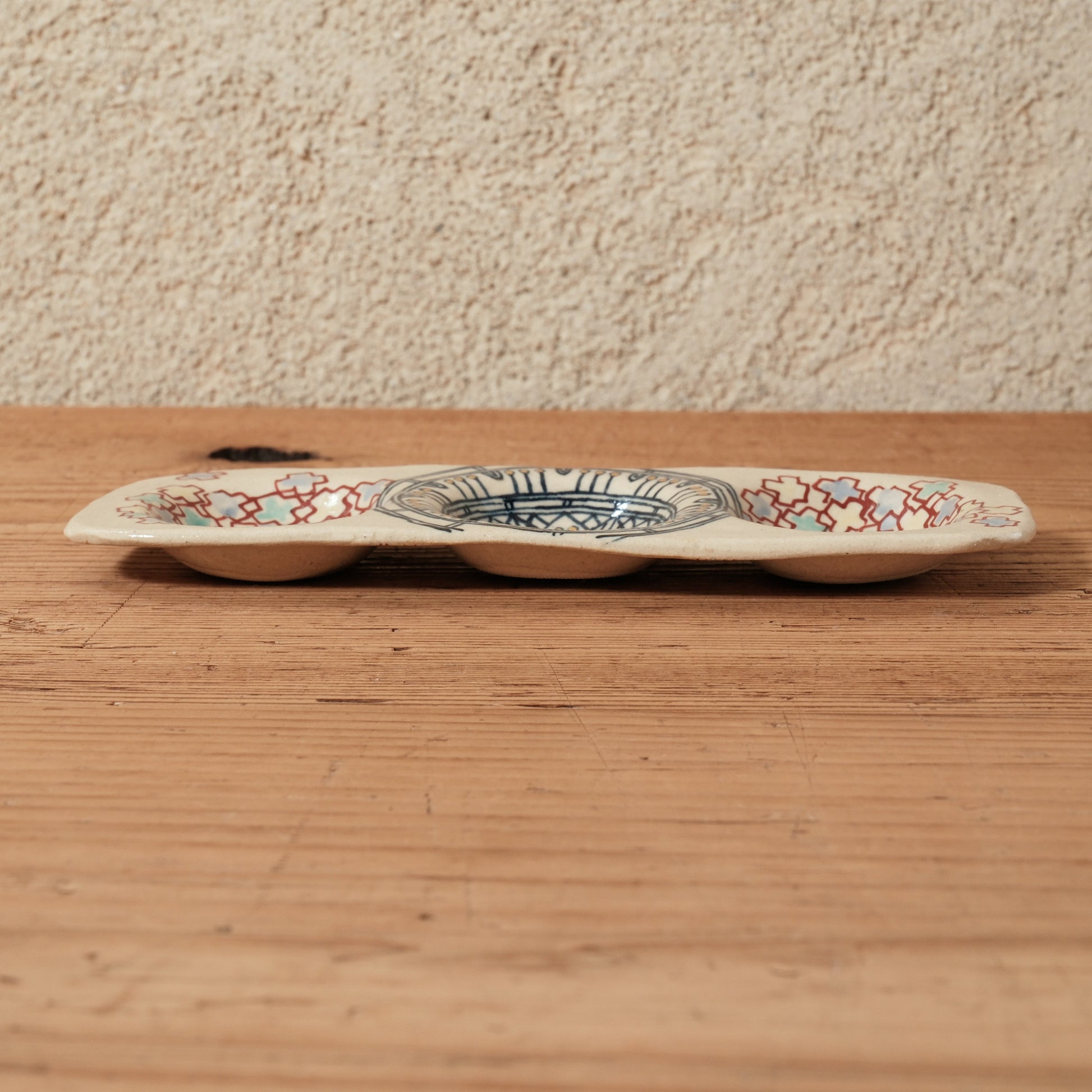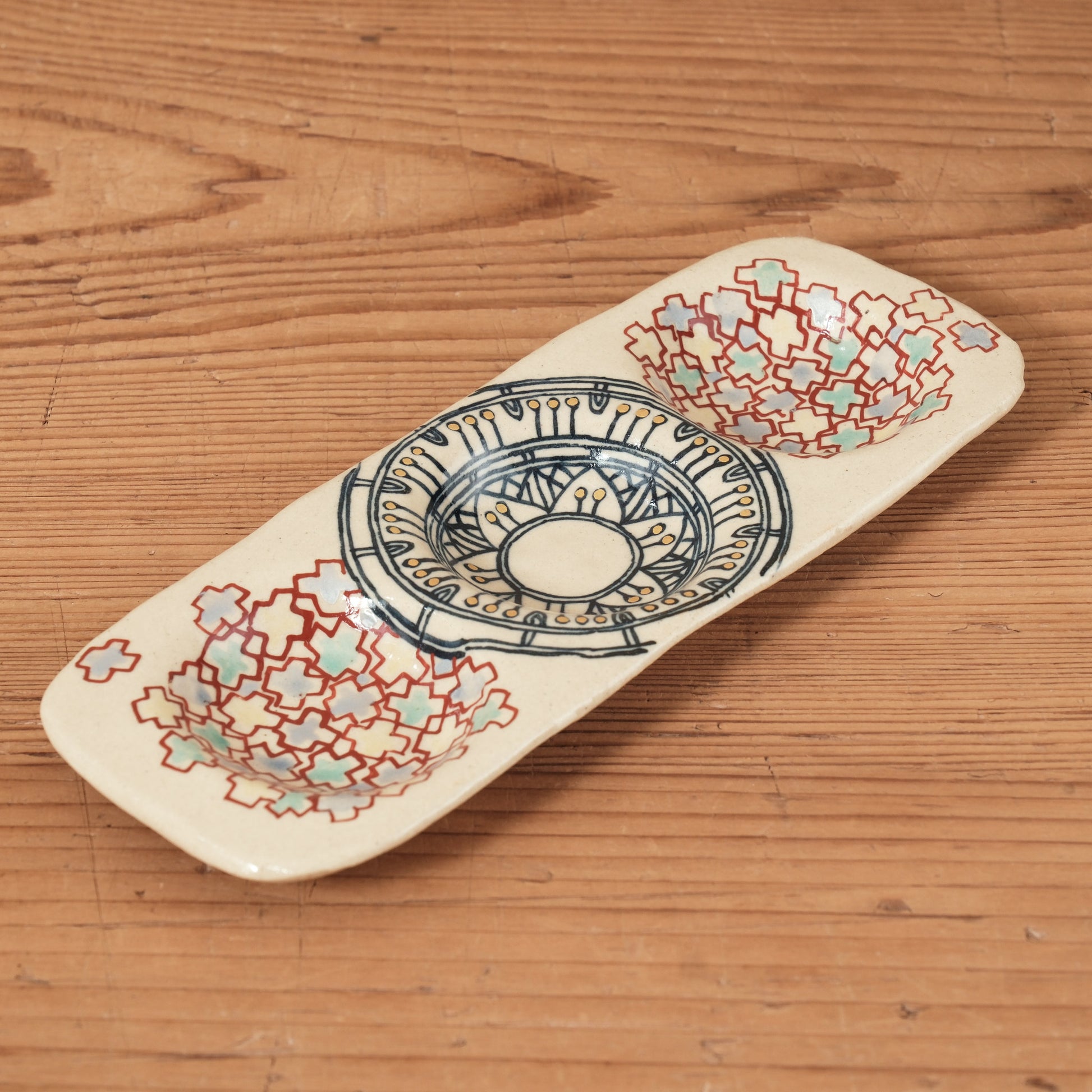細やかな模様を赤絵と金彩で仕上げられた、約18cmの3点薬味plate。