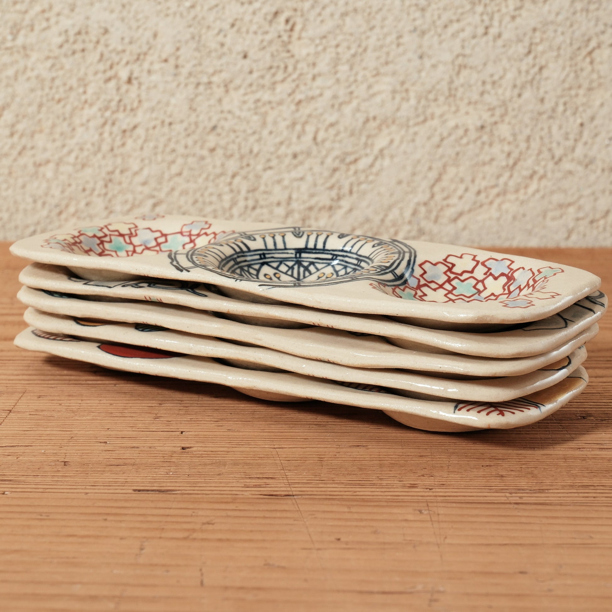 形状が同じでも模様や色使いがそれぞれ異なるのも、「決めすぎない、縛りすぎない」加藤さんの作陶スタイルだからこそ。