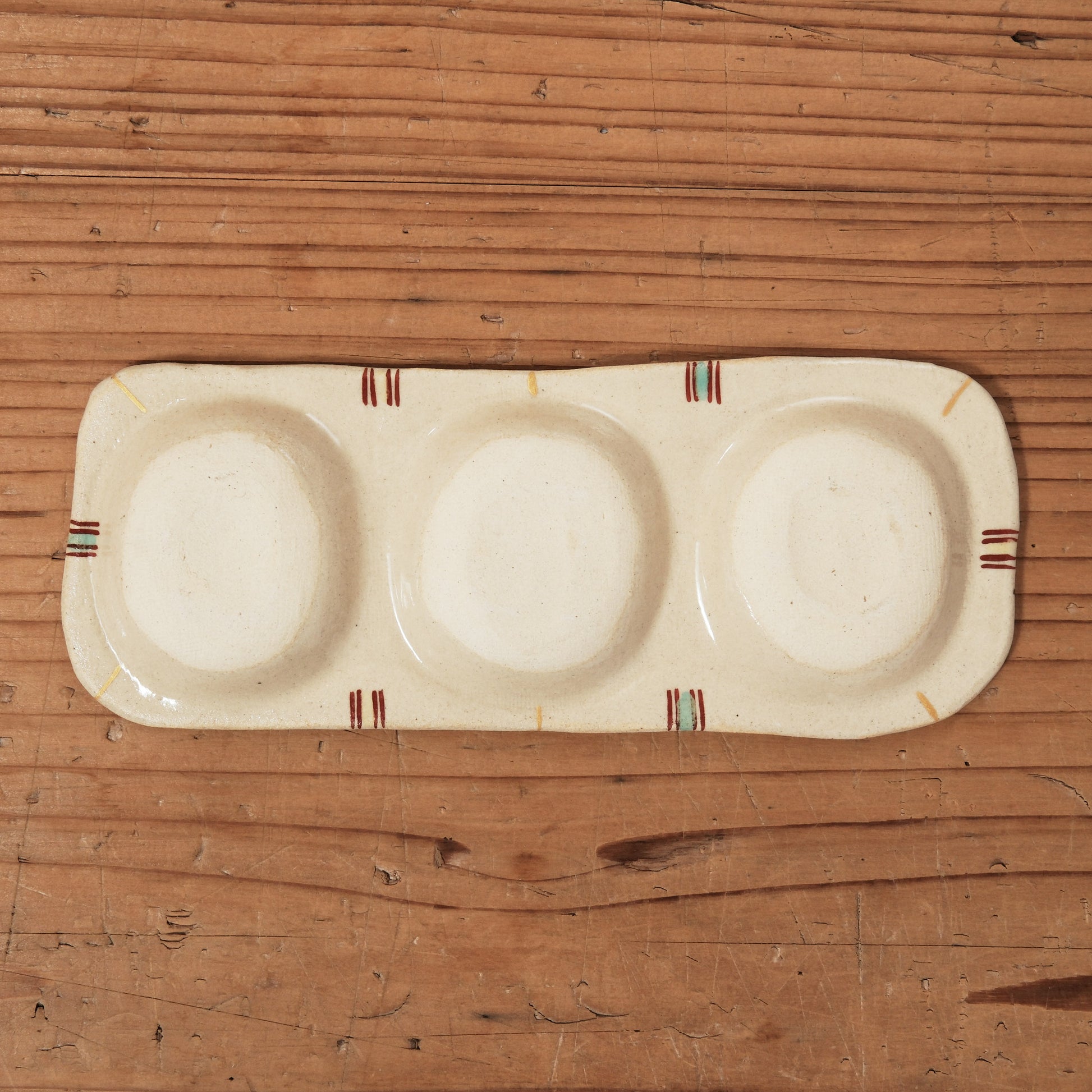 細やかな模様を赤絵と金彩で仕上げられた、約18cmの3点薬味plate。