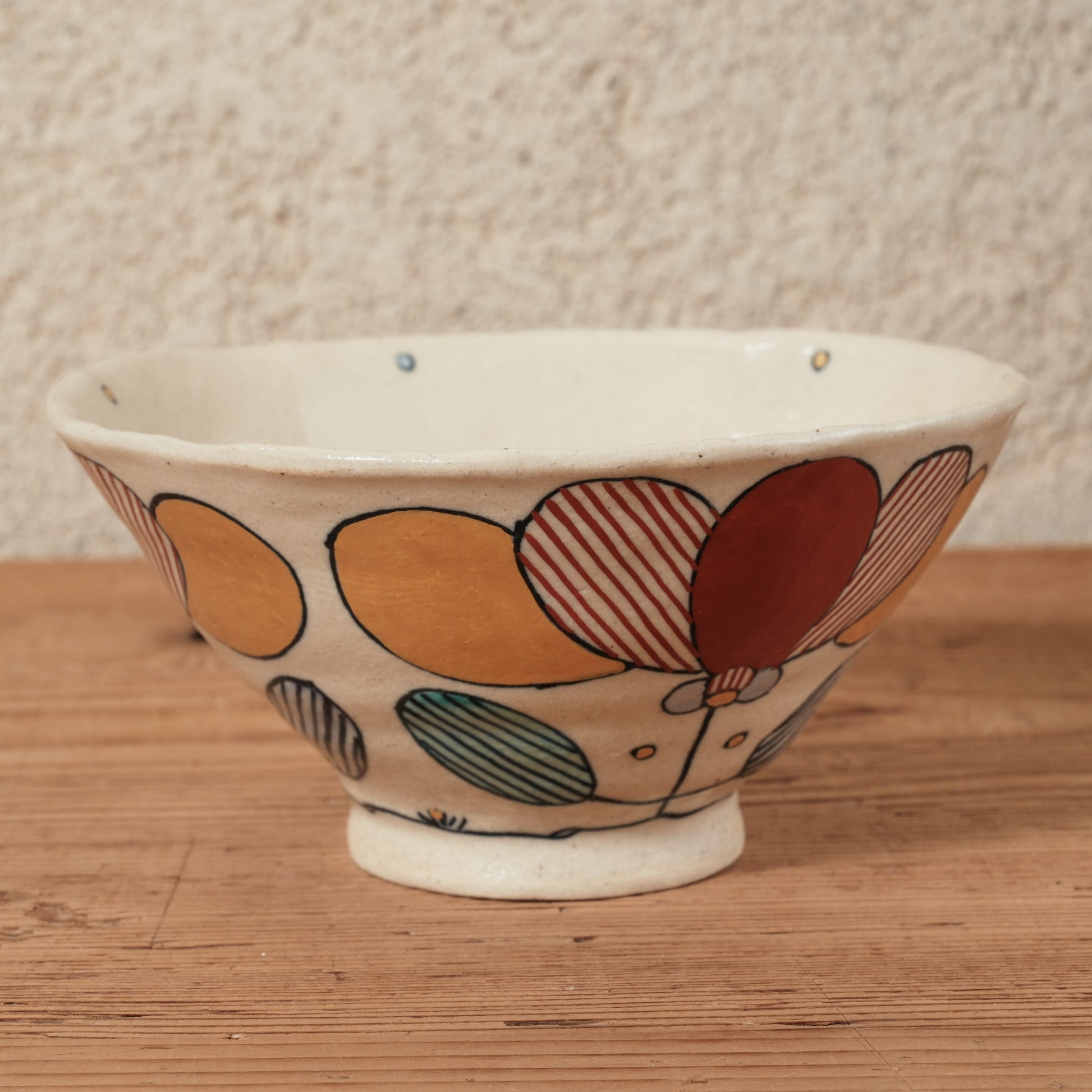透明釉のかかった素朴な白地の外側には細かな模様色とりどりに描かれている、直径約13.5cmの飯茶碗です。
