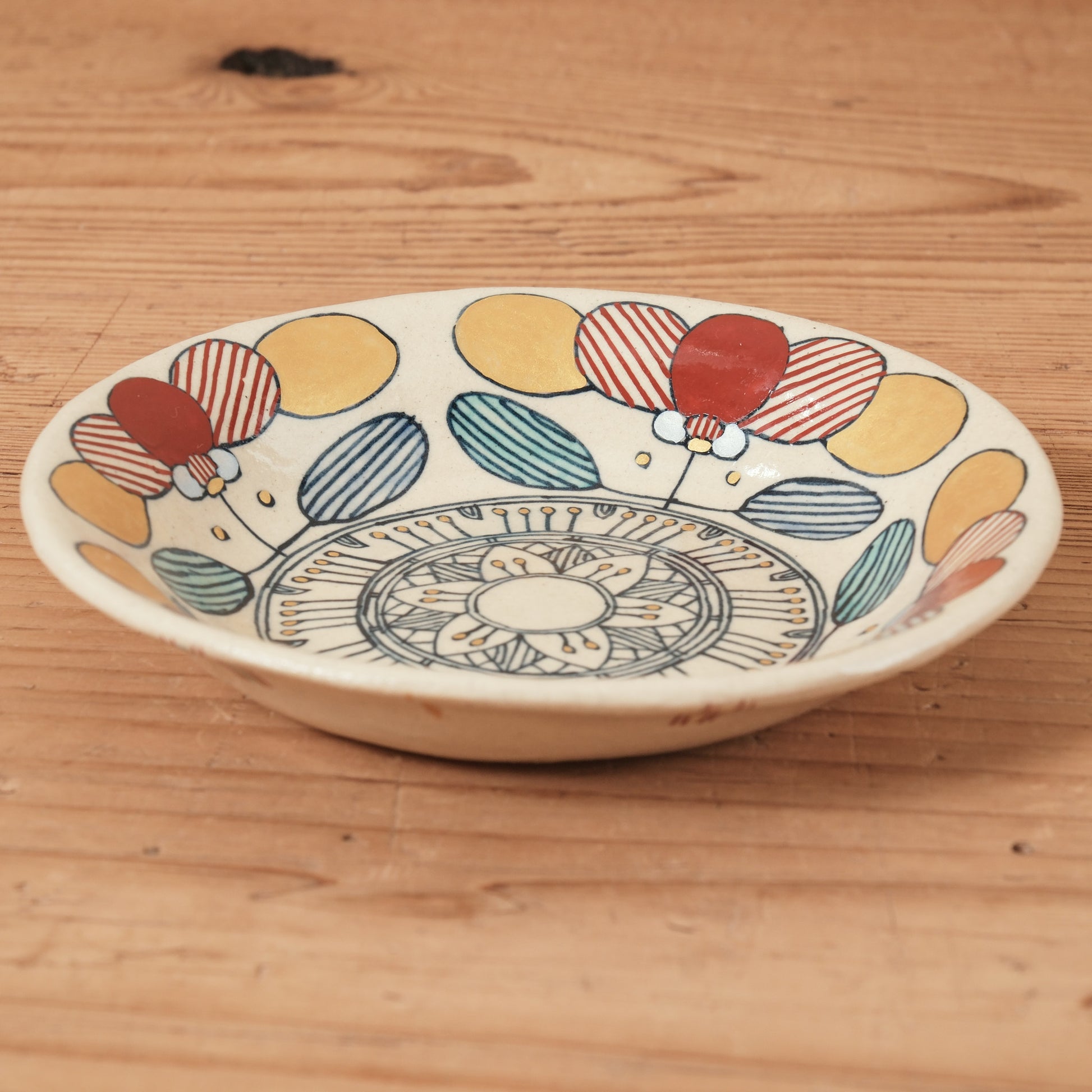 細かな柄が丁寧な赤絵金彩で表現されている、少し大きめな円形小鉢です。