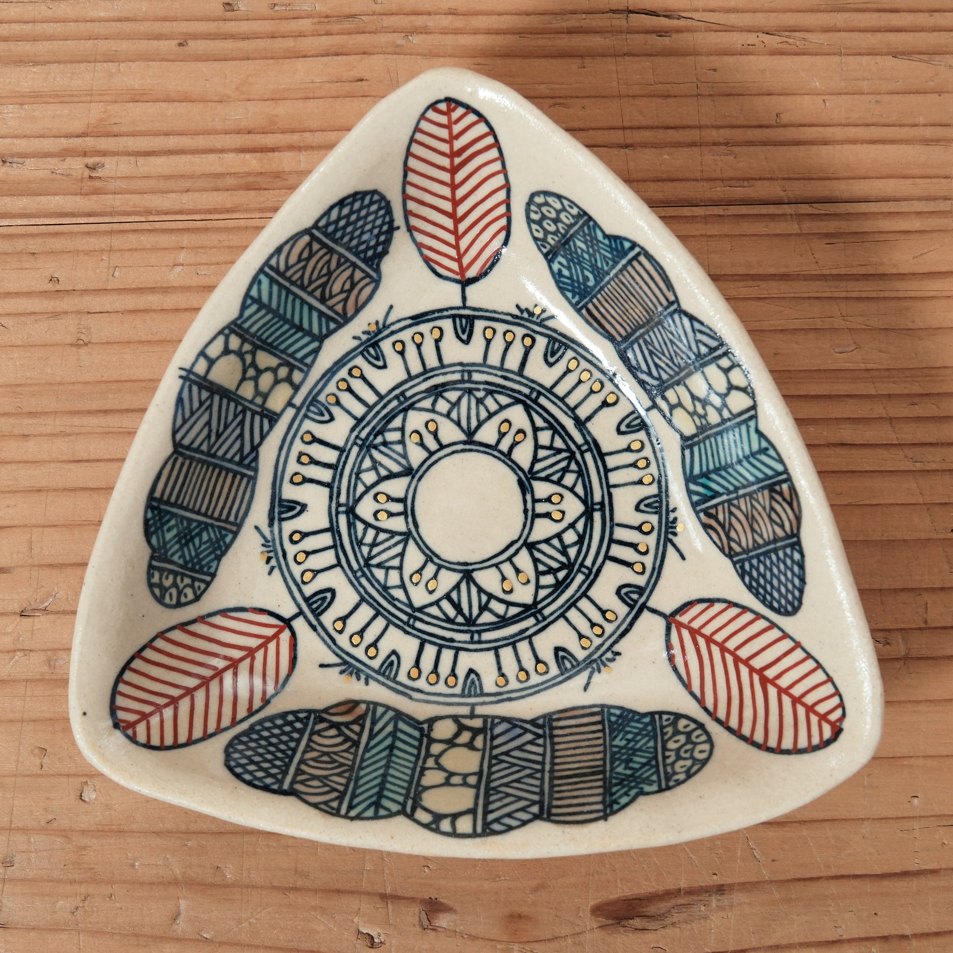 赤絵金彩で彩りされた、少しめずらしい、三角形の小鉢で、