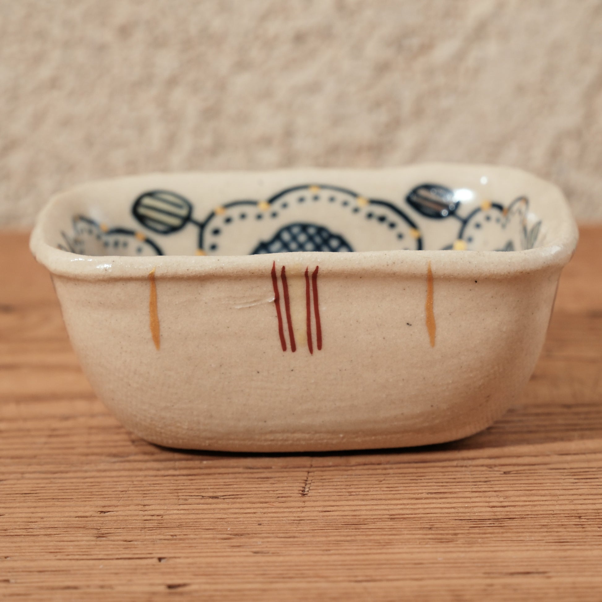 細かな柄が丁寧な赤絵金彩で表現されている、幅約8cmの角鉢です。