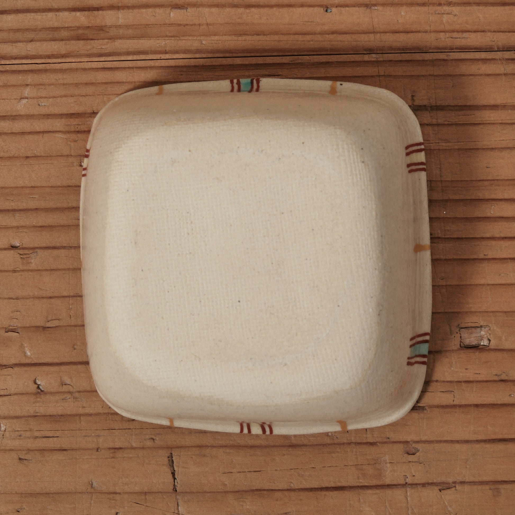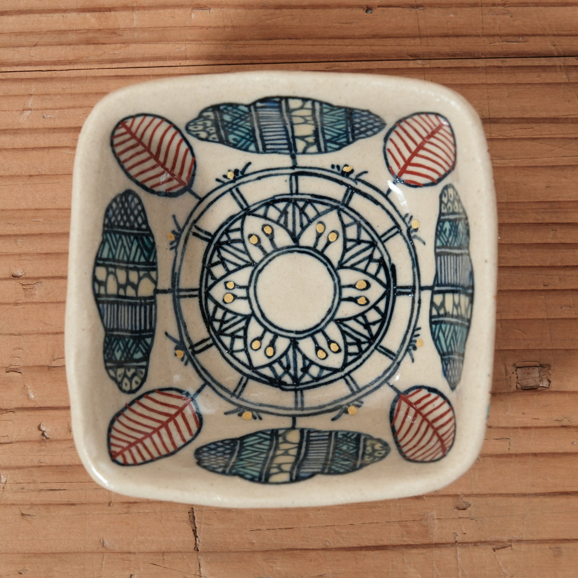 細かな柄が丁寧な赤絵金彩で表現されている、幅約8cmの角鉢です。