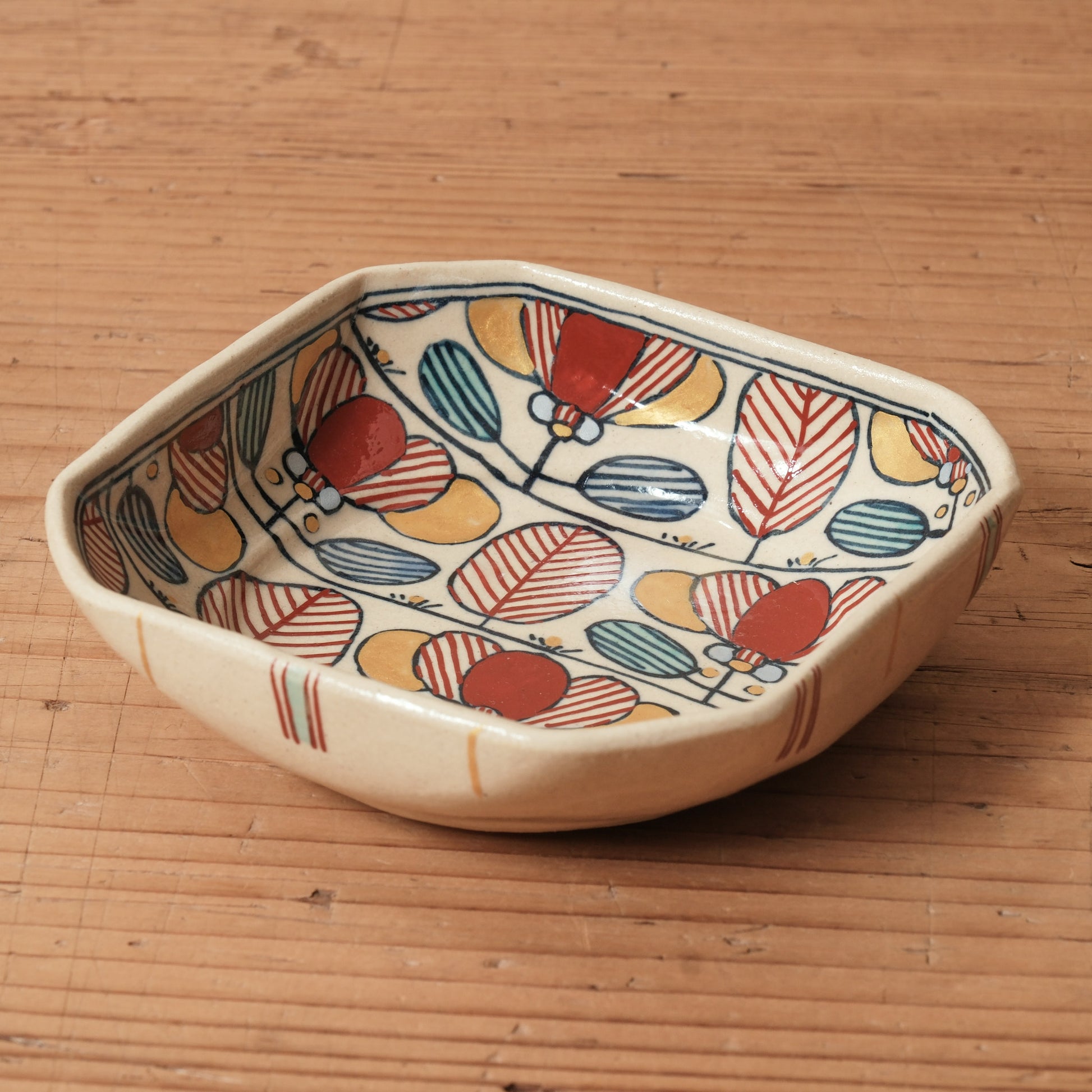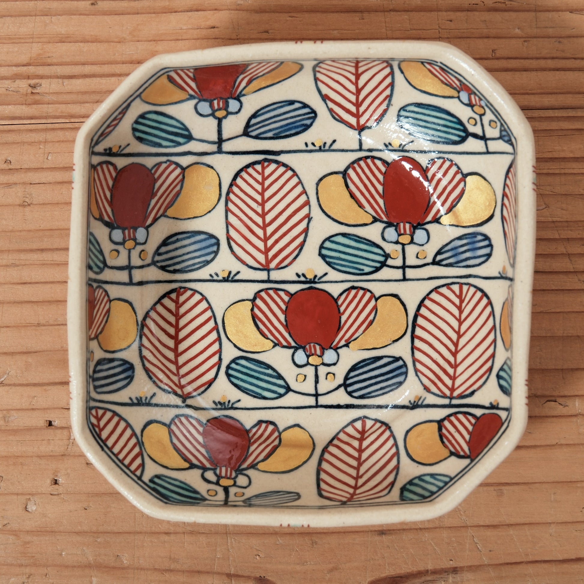 温かな色合いの赤絵と金彩が映える、幅約11cmの角鉢です。
