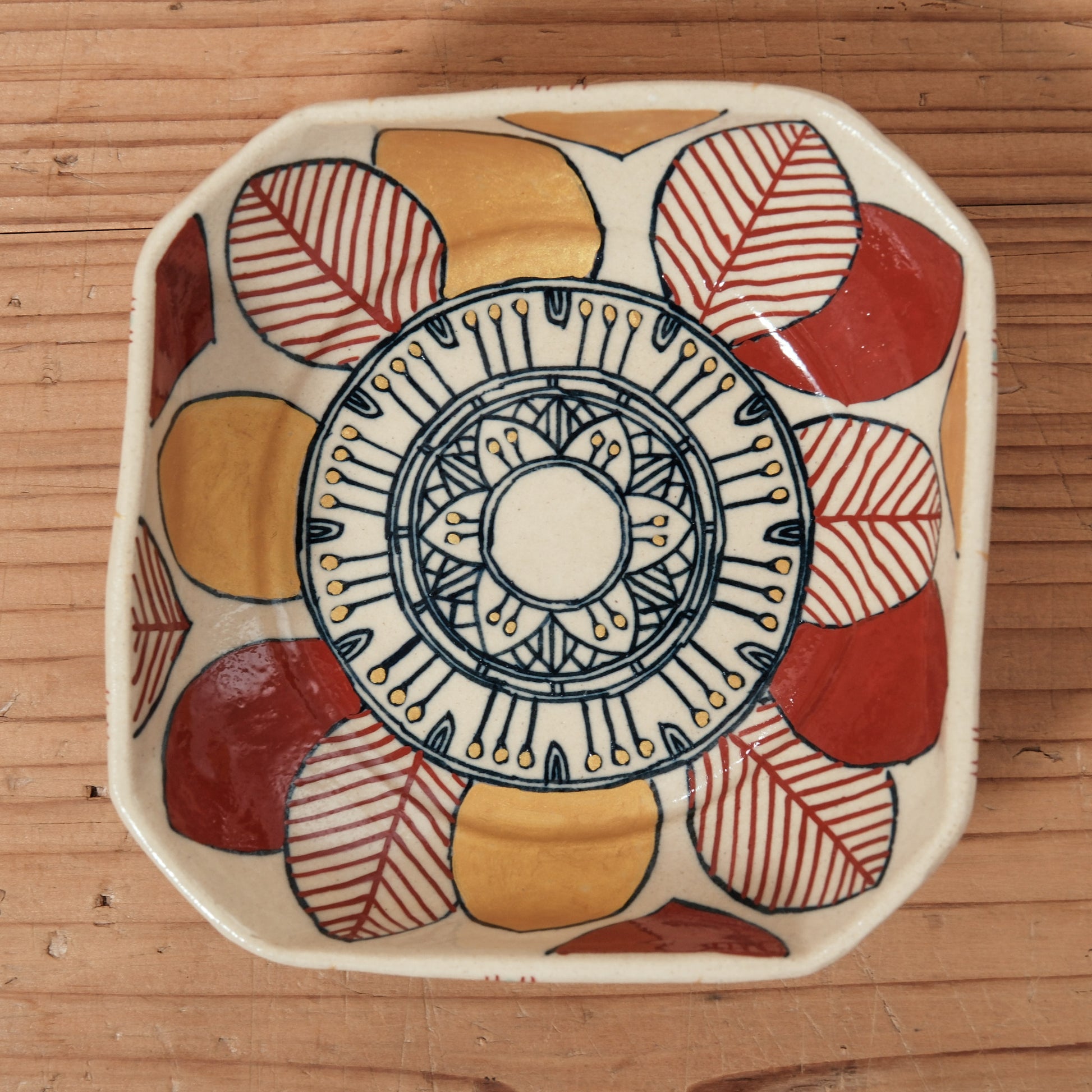温かな色合いの赤絵と金彩が映える、幅約11cmの角鉢です。