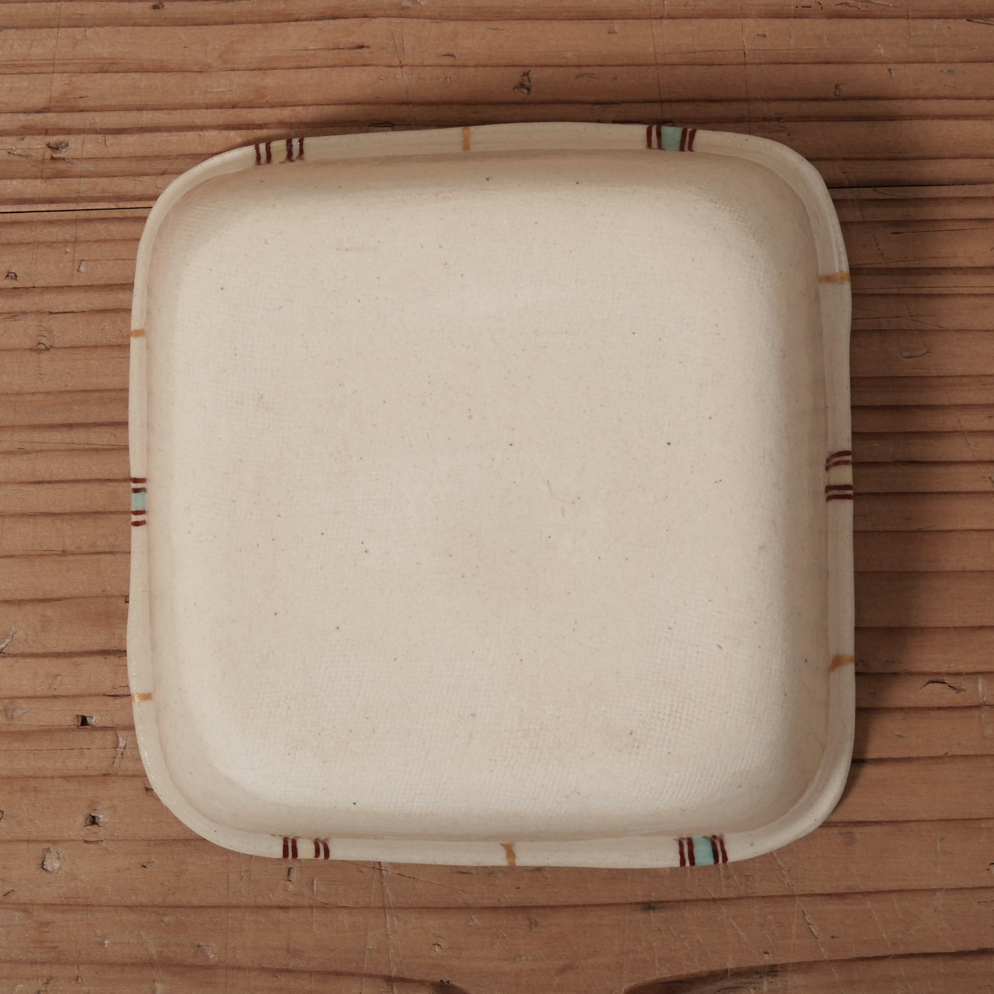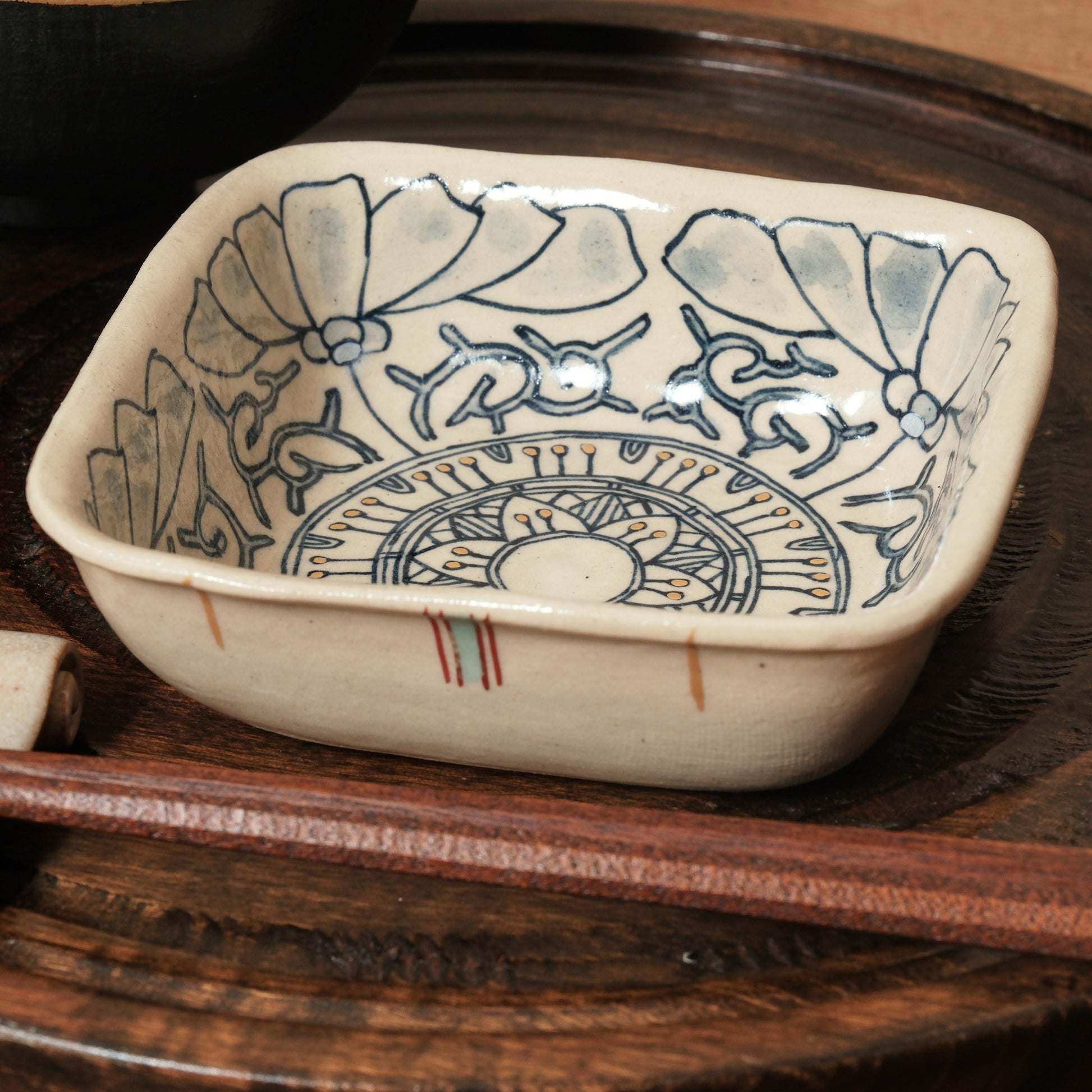 温かな色合いの赤絵と金彩が映える、幅約11.5cmの角鉢です。