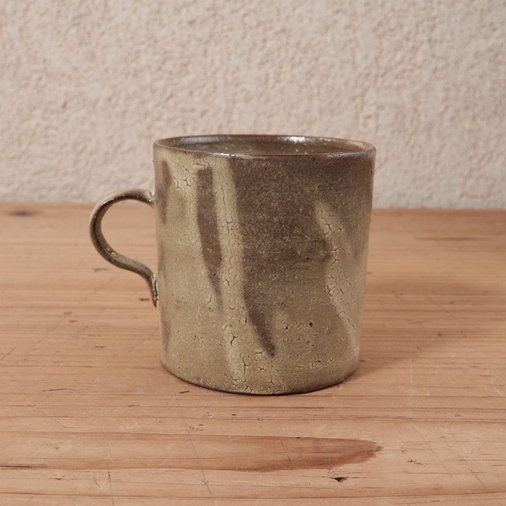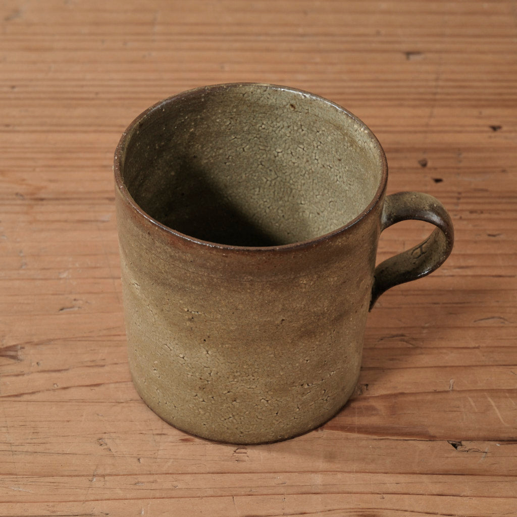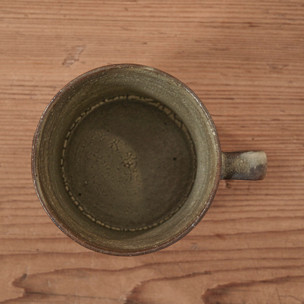 やわらかな緑を帯びた茶の中に、細かな粒子と濃淡が重なり合い、静かな景色をつくります。丸みのあるタイプに比べ、縦にすっと立ち上がる形状が釉薬の表情をより際立たせます。