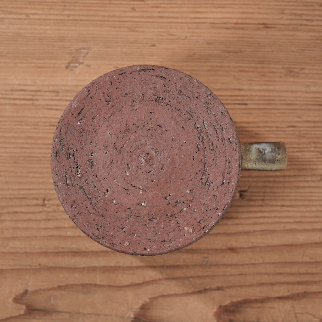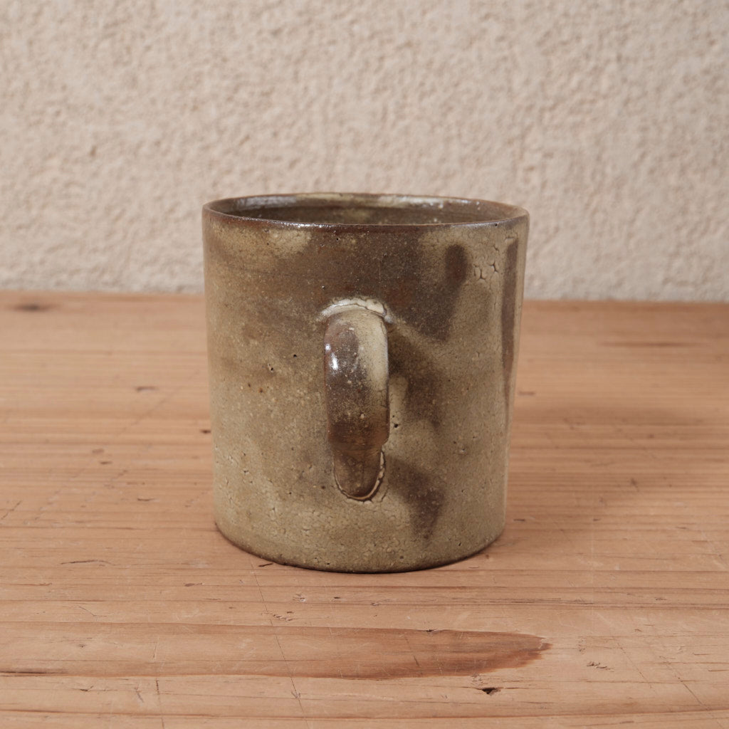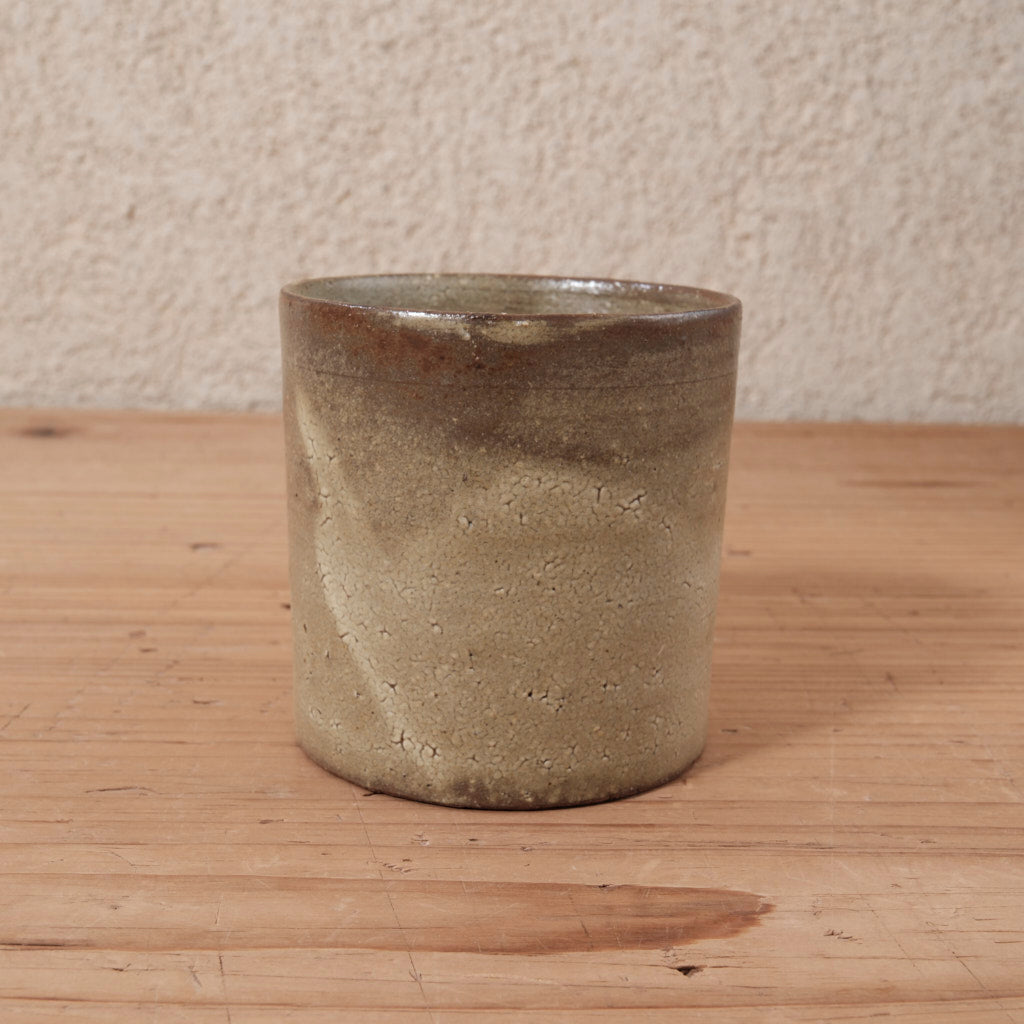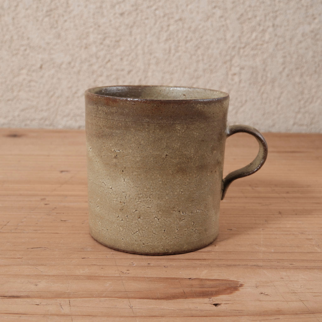 やわらかな緑を帯びた茶の中に、細かな粒子と濃淡が重なり合い、静かな景色をつくります。丸みのあるタイプに比べ、縦にすっと立ち上がる形状が釉薬の表情をより際立たせます。