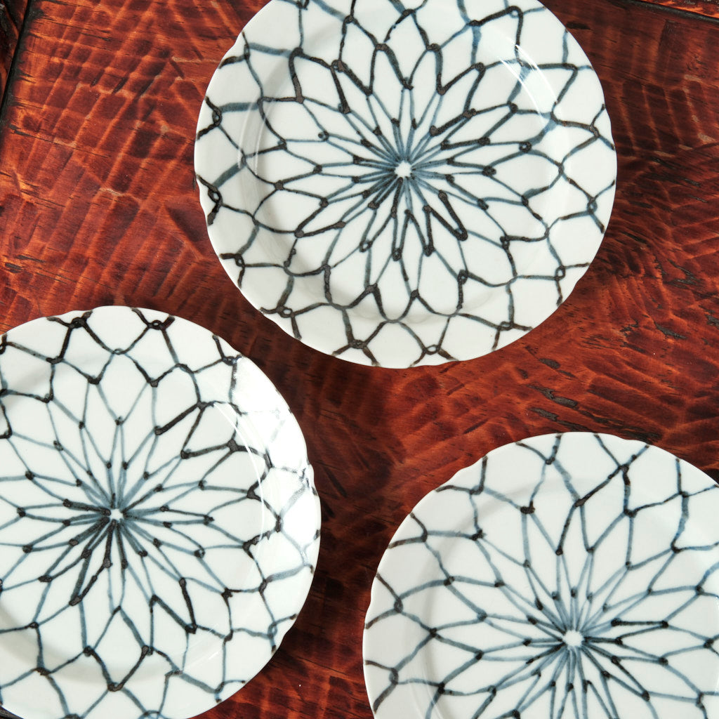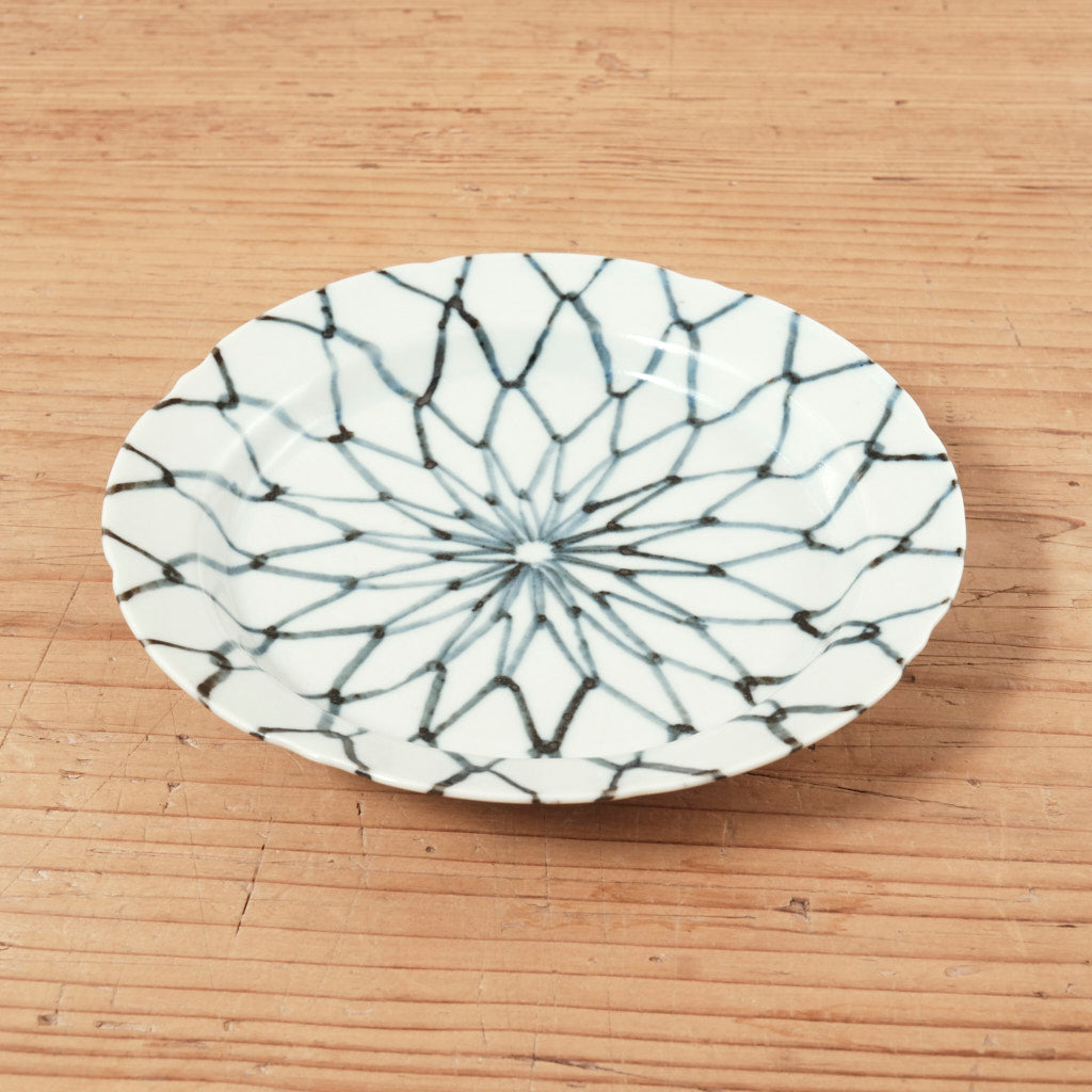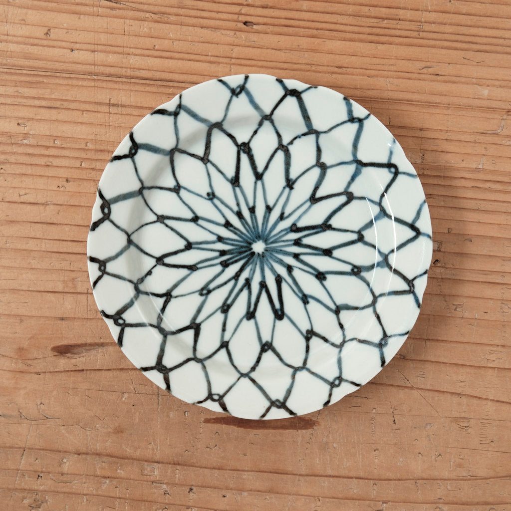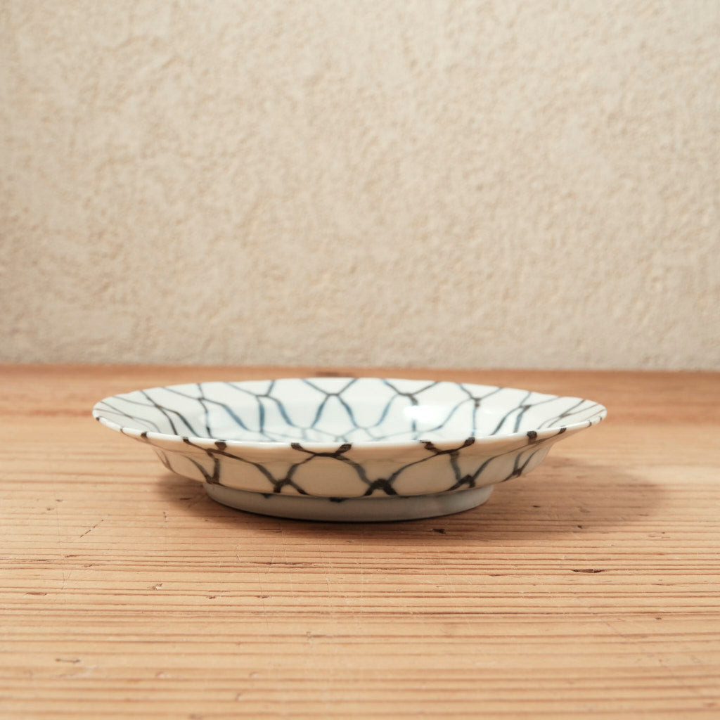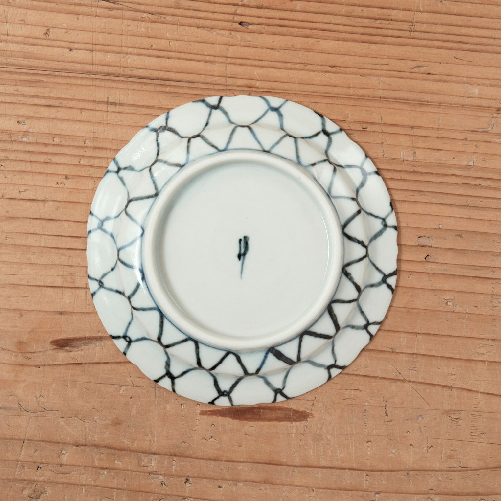 白い磁肌の上に、染付で描かれた網目模様が広がる五寸皿。
