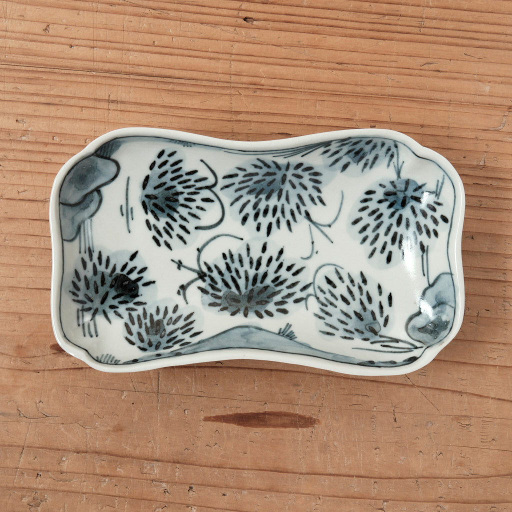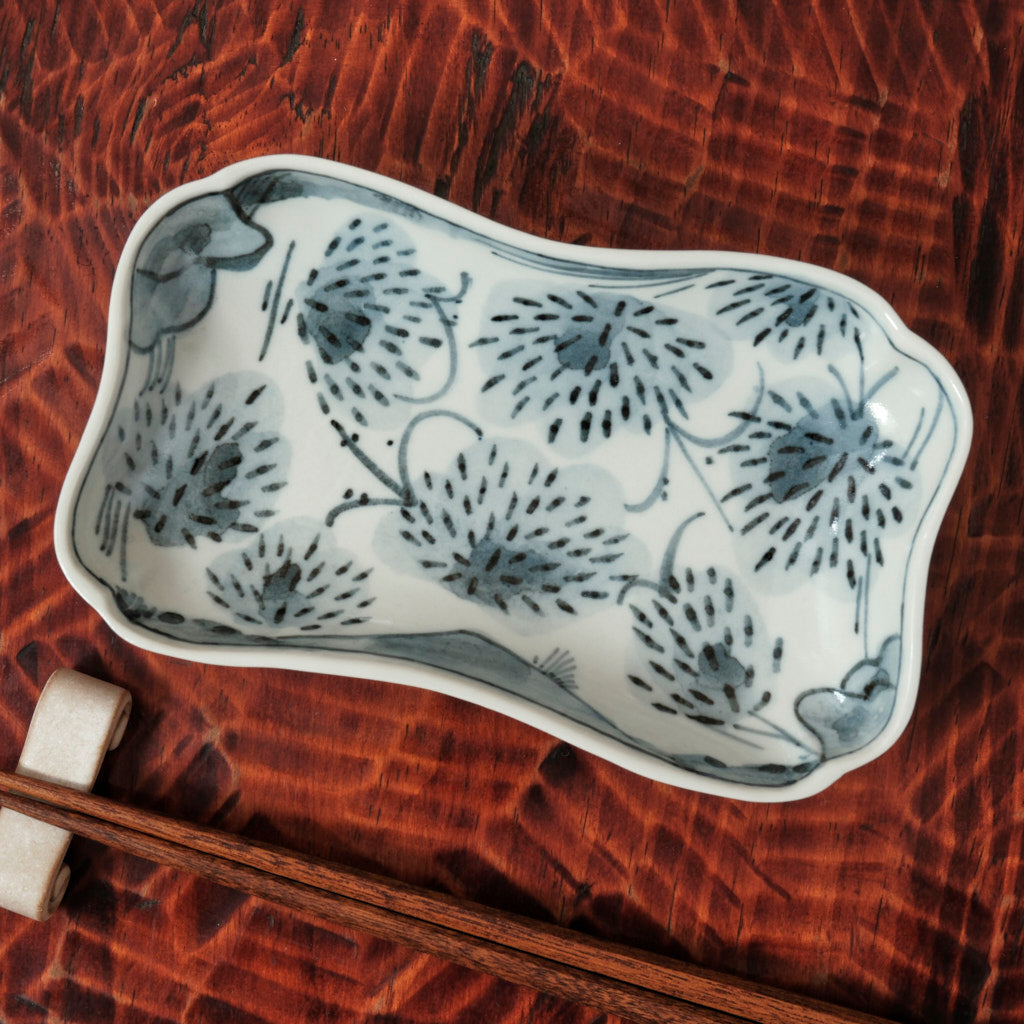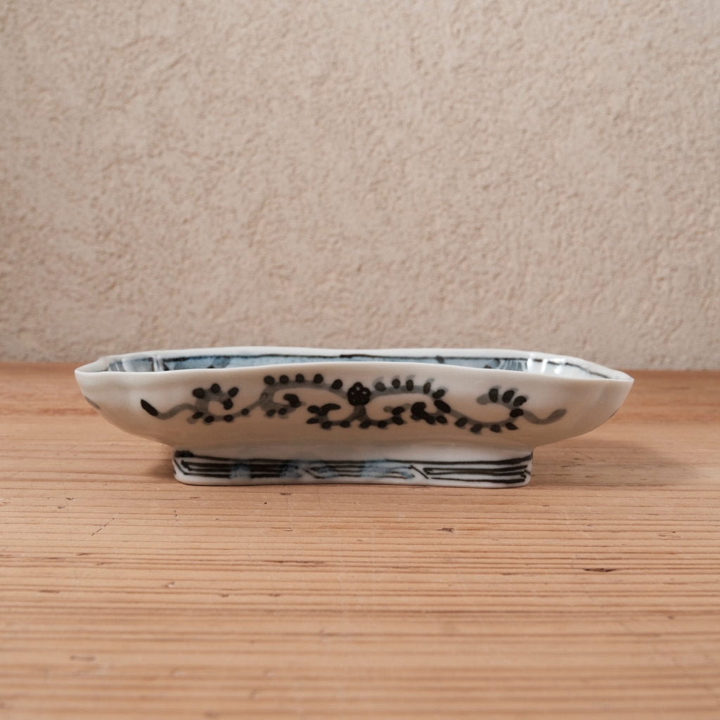 染付のやさしい青で、笹文がのびやかに描かれた隅切長四方皿。