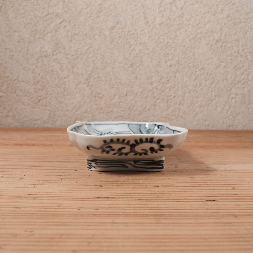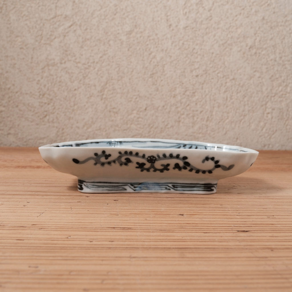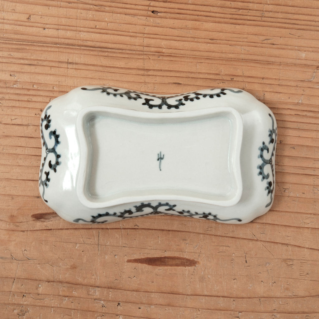 染付のやさしい青で、笹文がのびやかに描かれた隅切長四方皿。