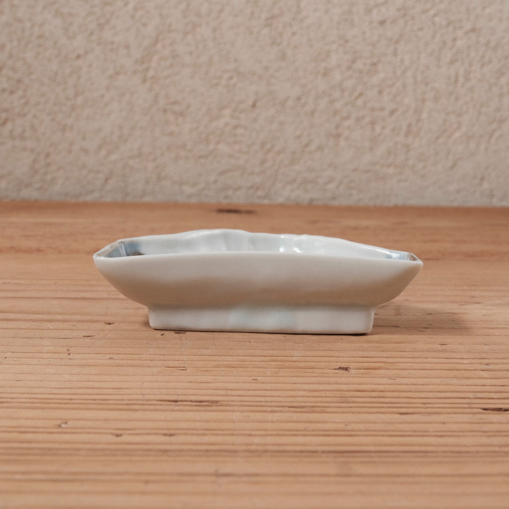 きっちりと描き込むのではなく、形そのものに遊びを持たせることで、器としての余白を大切にした一枚です。やわらかな白磁に、釉薬がかかることで生まれる淡い青みが、静かで落ち着いた印象を与えます。