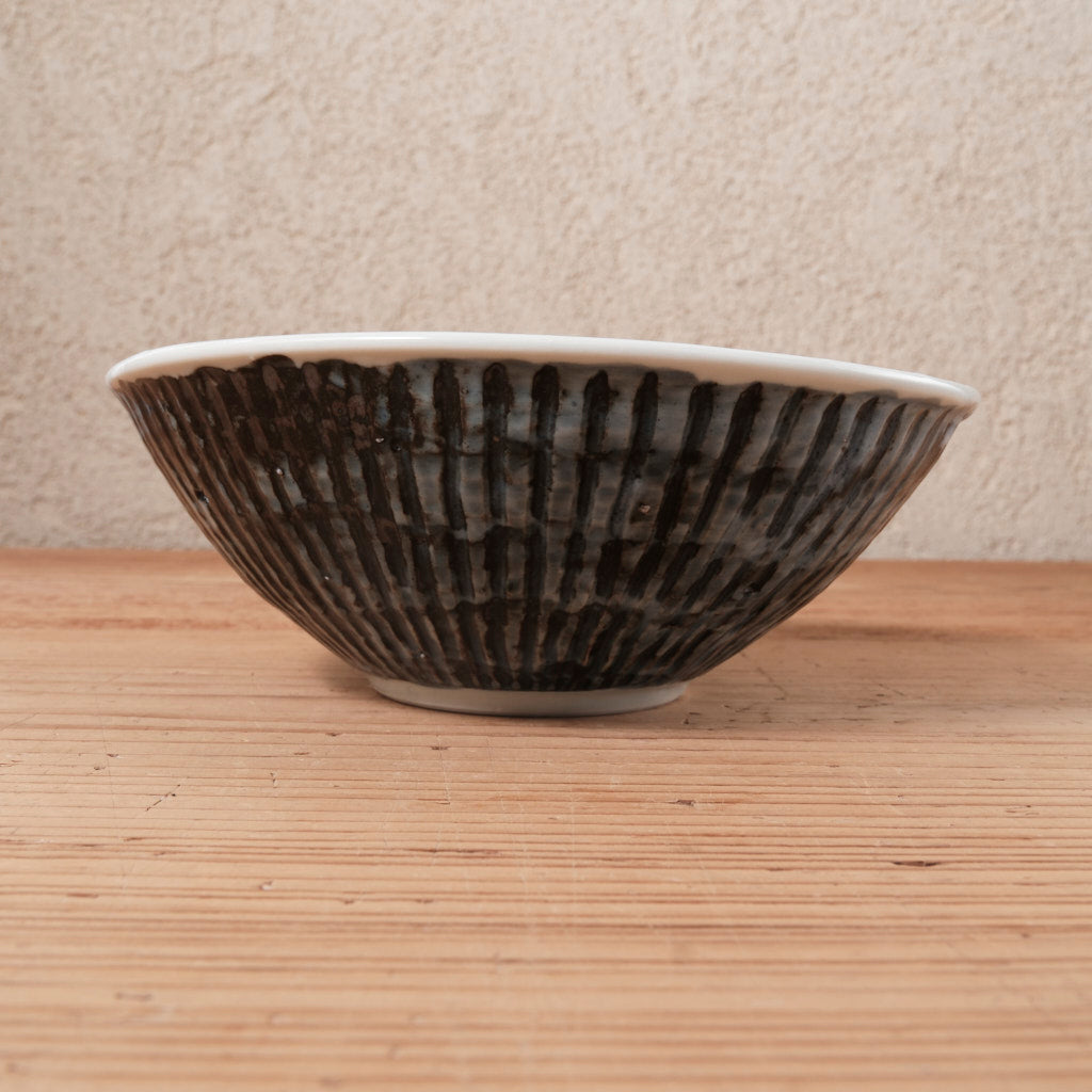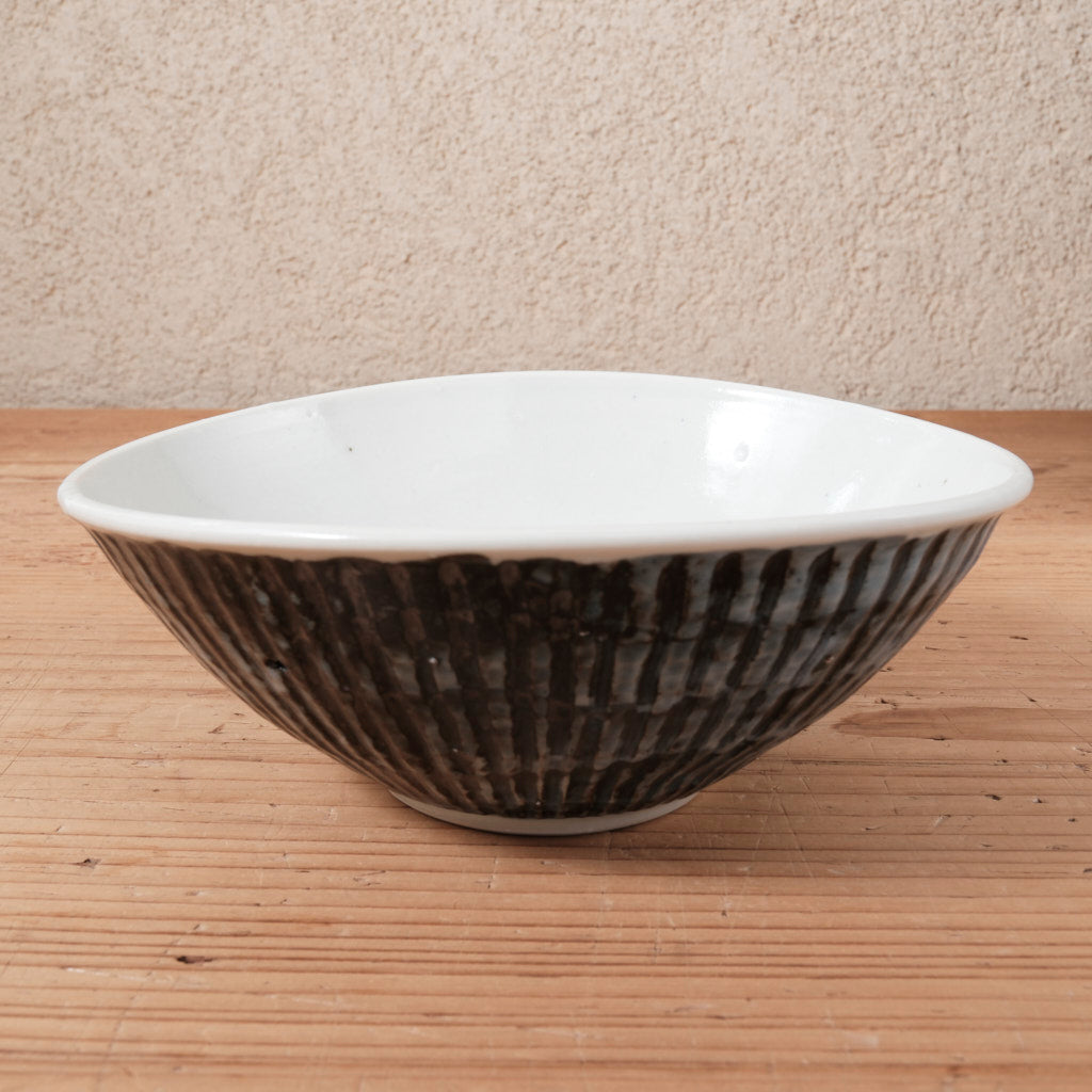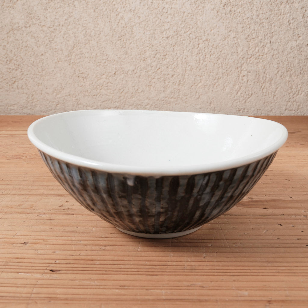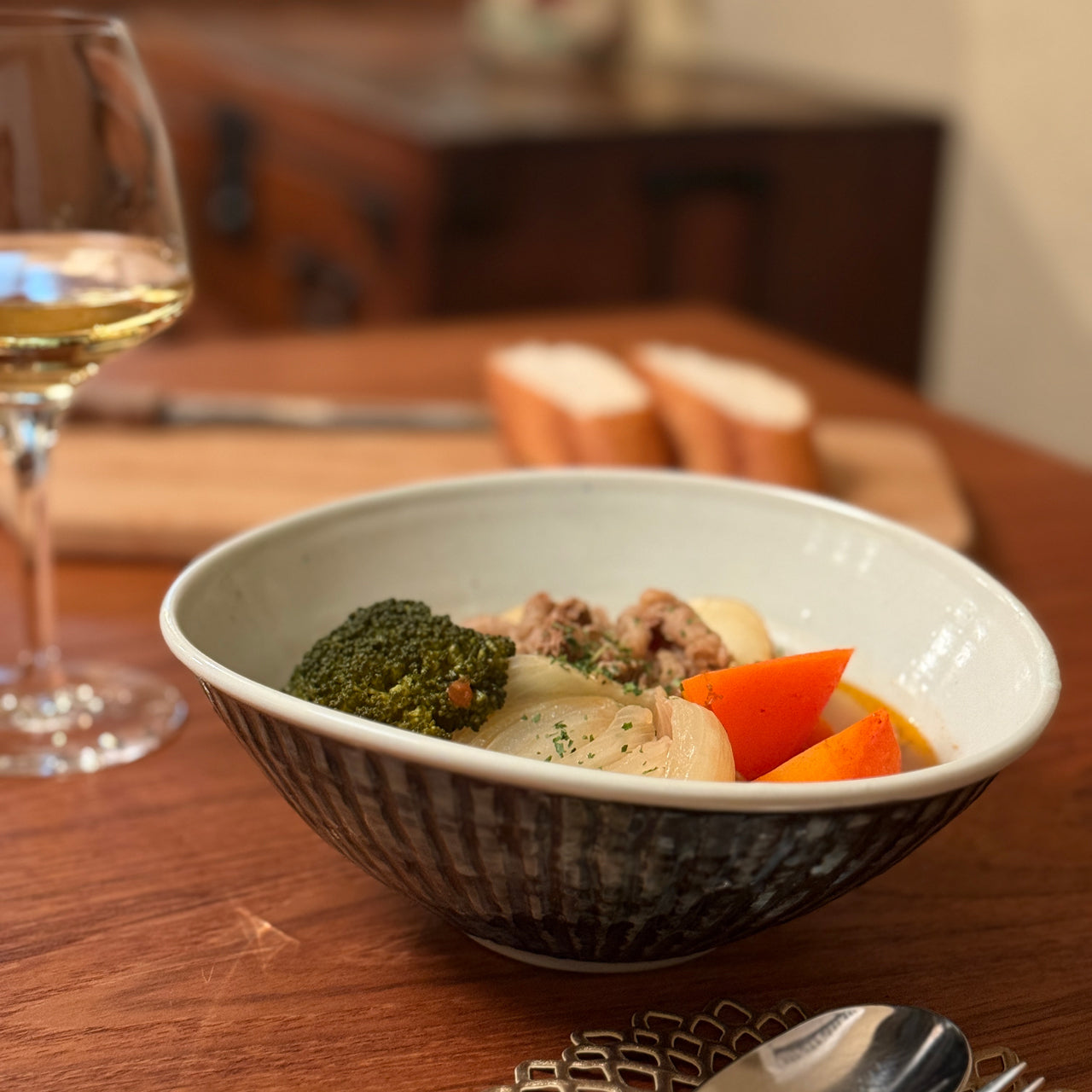 外側の鎬が生む陰影に対し、内側はなめらかに仕上げられており、具材を受け止める懐の深さが感じられます。いわゆる「カレー鉢」としてだけでなく、具だくさんのポトフや肉じゃが、煮込み料理との相性も抜群。一人分の鉢としても、少量を盛る盛鉢としても、現実的に使いやすいサイズ感です。