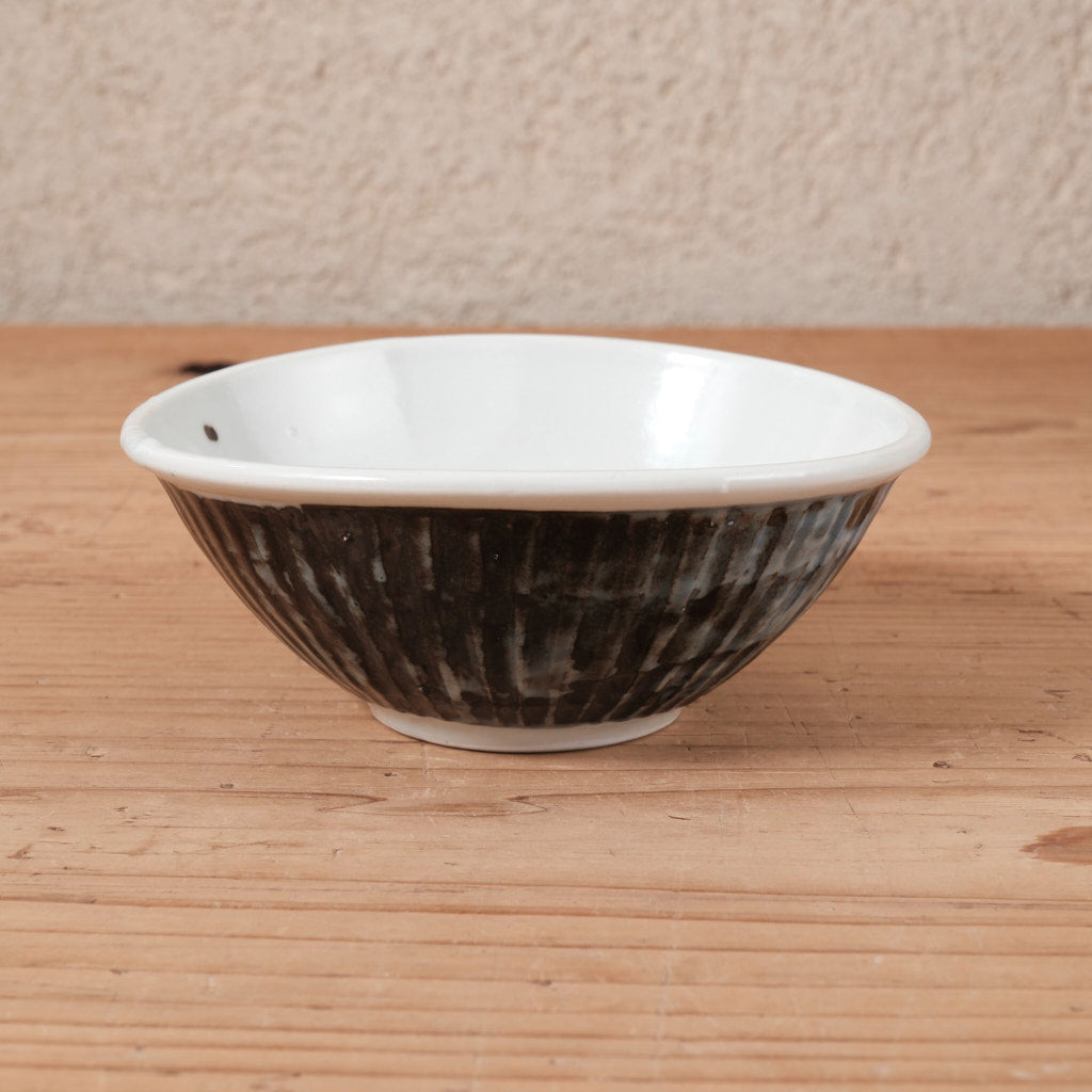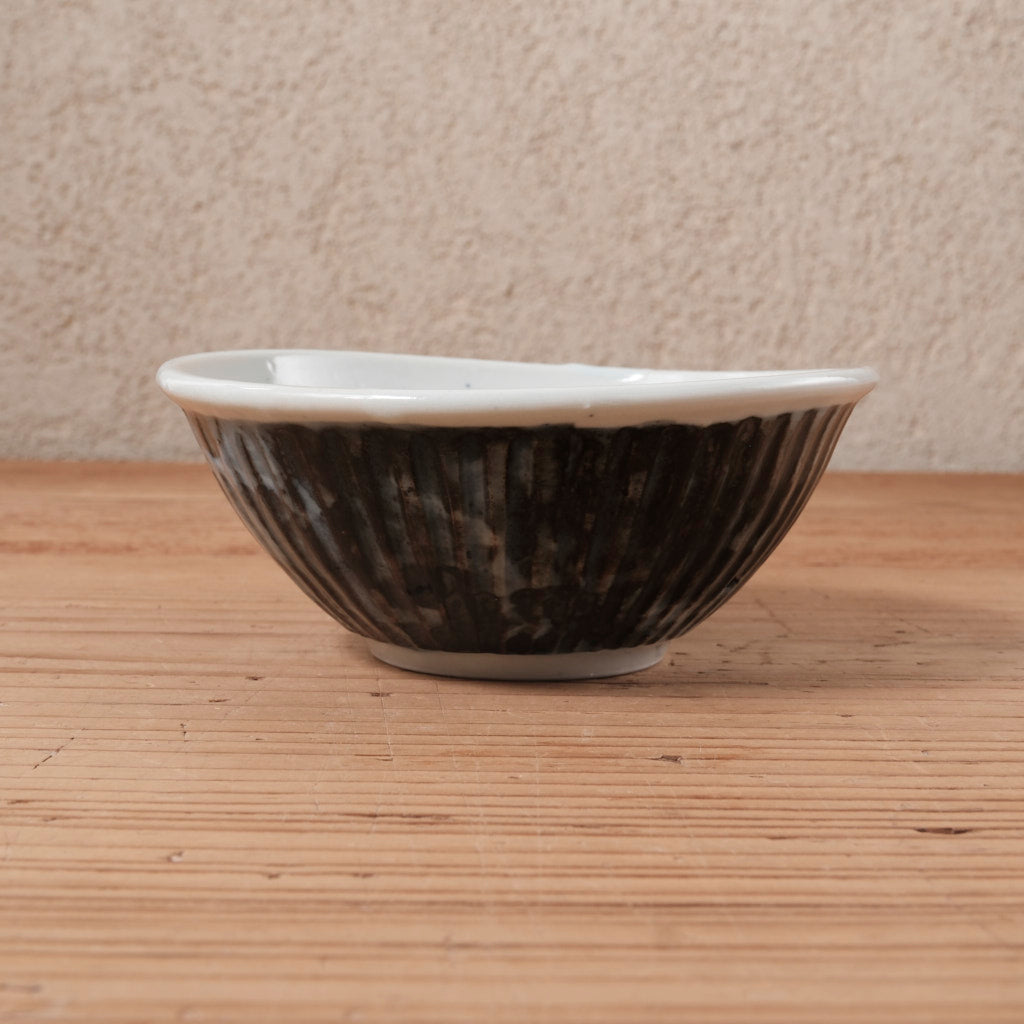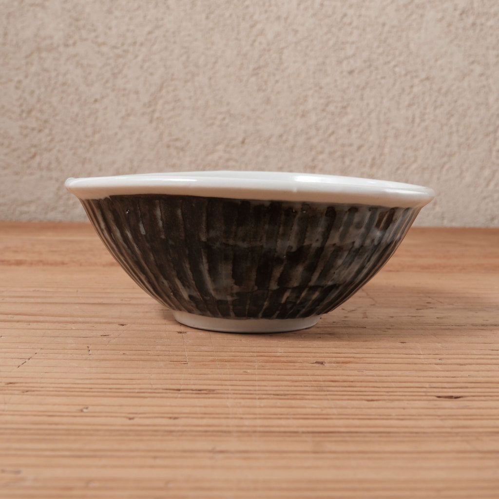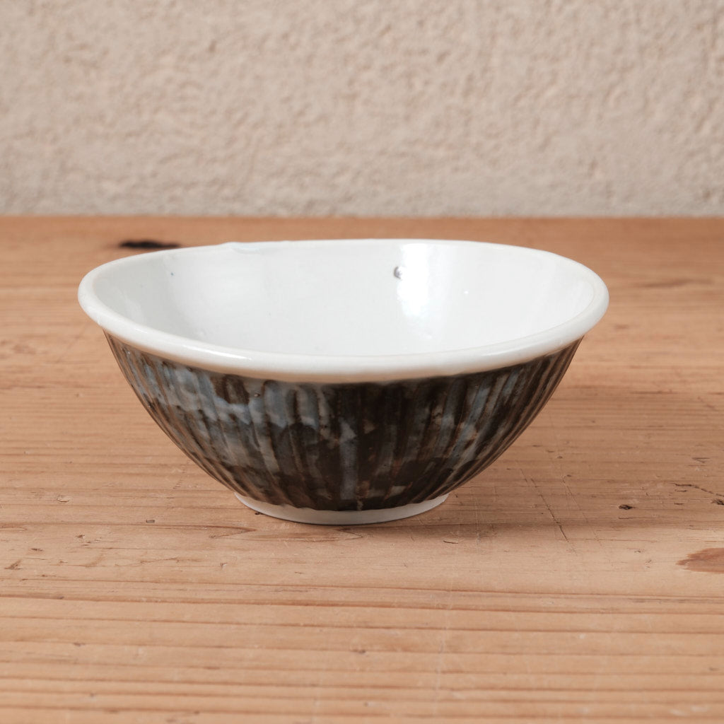 きっちり整えすぎない造形は、どこか肩の力が抜けた佇まい。外側の鎬が生む立体感に対し、内側はなめらかで、料理を自然に受け止めてくれます。直径約13cmほどのサイズは、和え物や煮物、少量の汁気のある料理にも使いやすく、取り皿としても出番の多い大きさです。